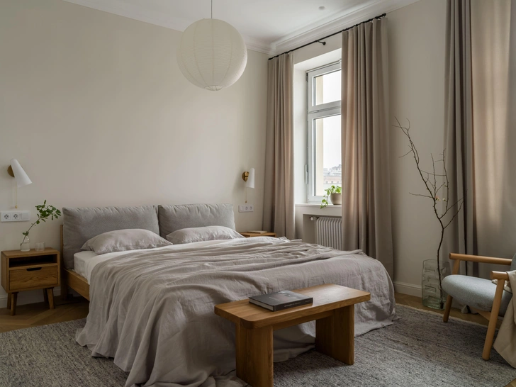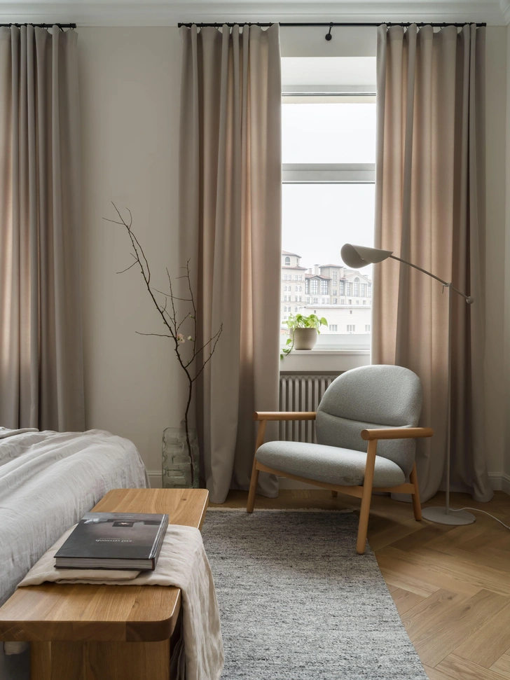 Спальня получилась очень уютной, с минималистичной палитрой бежевых оттенков и дерева. Отдельно хотим обратить внимание на потрясающую кровать от наших партнеров Partisan: прочность дуба в ней сочетается с мягким изголовьем. Еще в спальне есть милый уголок для чтения с креслом и торшером.