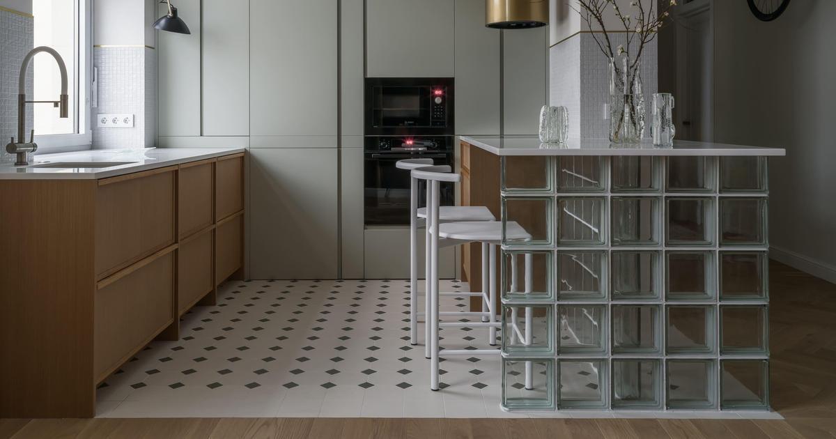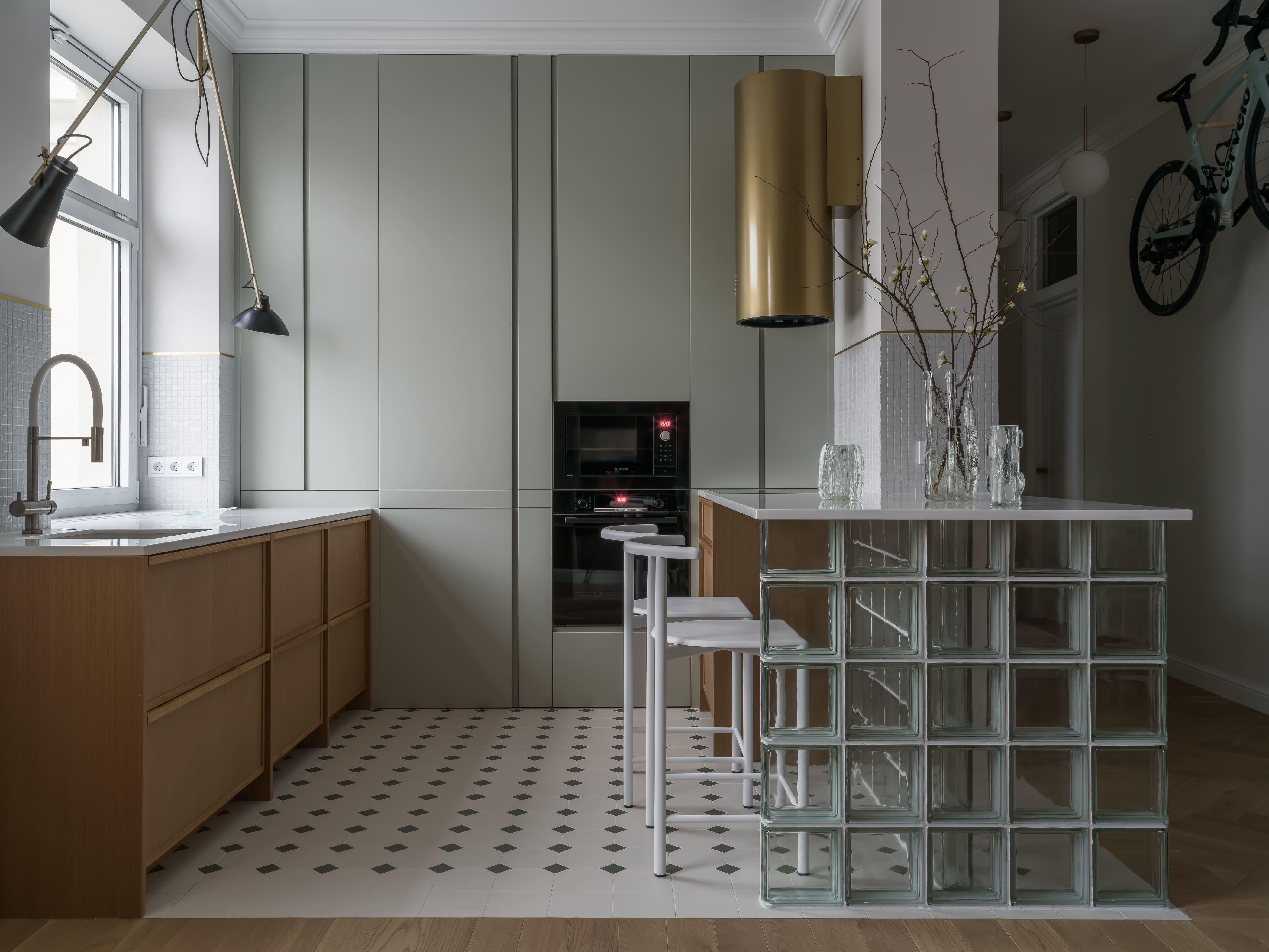 У нас получился интерьер с элементами современной классики, mid-century и брутализма. Мы сделали акцент на качественные, премиальные материалы, которые органично переплетаются с историей дома. Например, нетривиальная раскладка паркетной доски от Finex, французская метлахская плитка, стеклоблоки в проемах и даже в барном острове — все эти элементы разбавляют строгую геометрию и добавляют динамичности пространству, придавая ему особую атмосферу.