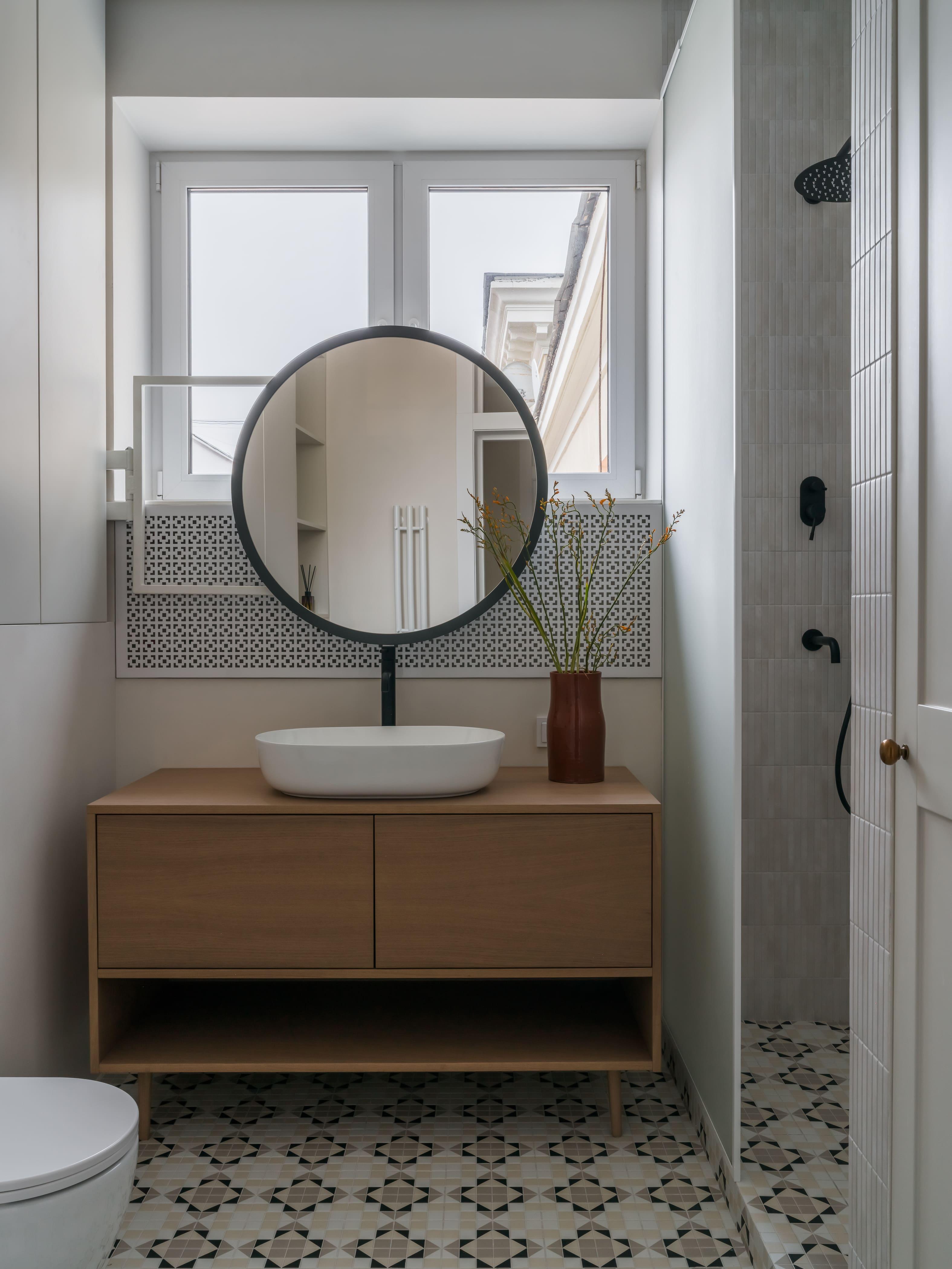 Плитка на полу Simple Colors, Winckelmans. Зеркало, Roodo Home. Свет, Maytoni.