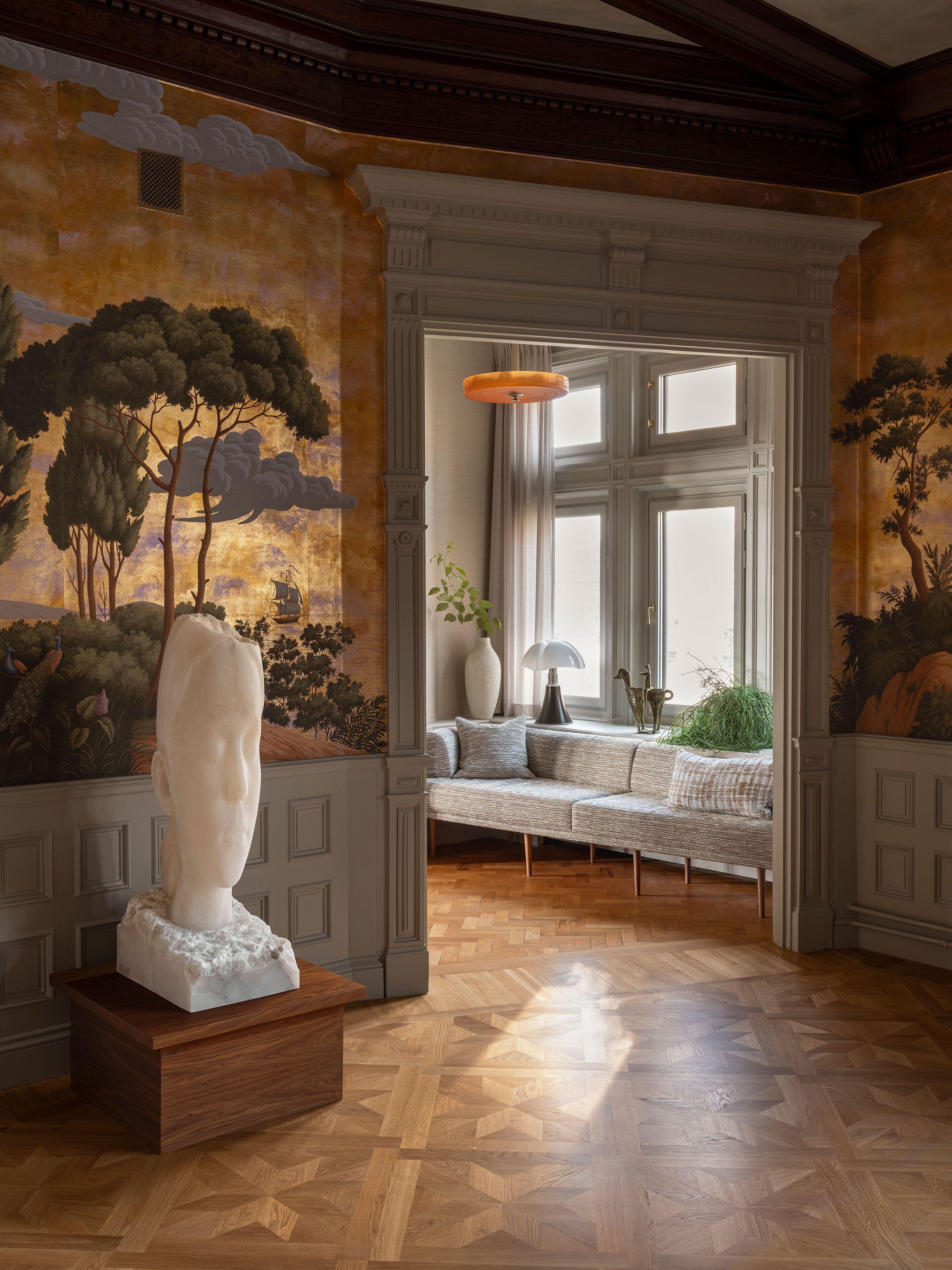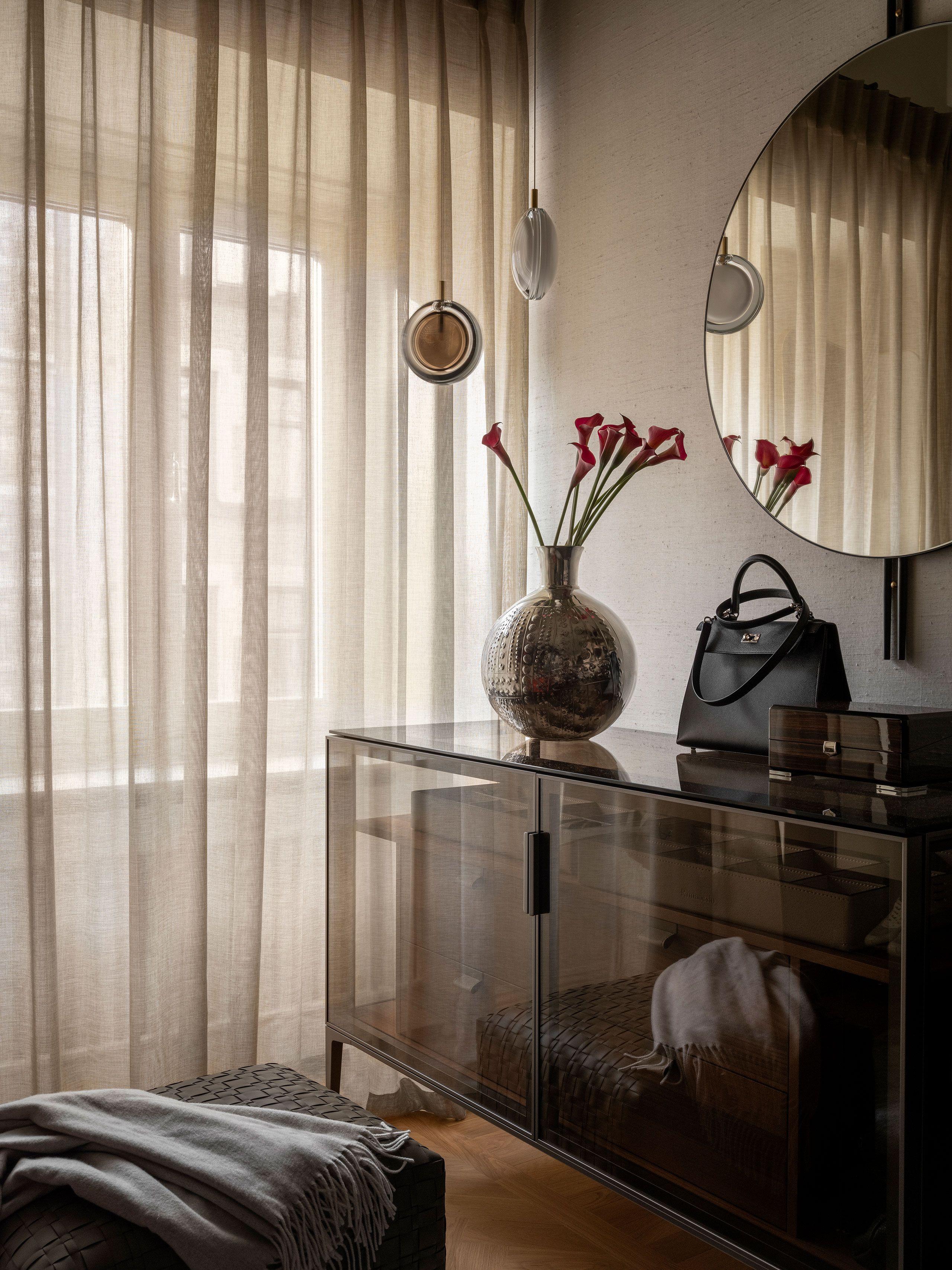Чувство скульптурности и художественности пронизывает пространство. Алебастровый бюст «Анна VI» бразильца Жауме Пленсы в столовой и керамическая скульптура шведки Евы Хильд в гостиной выступают равноценными участниками диалога, связывая классику и современность.