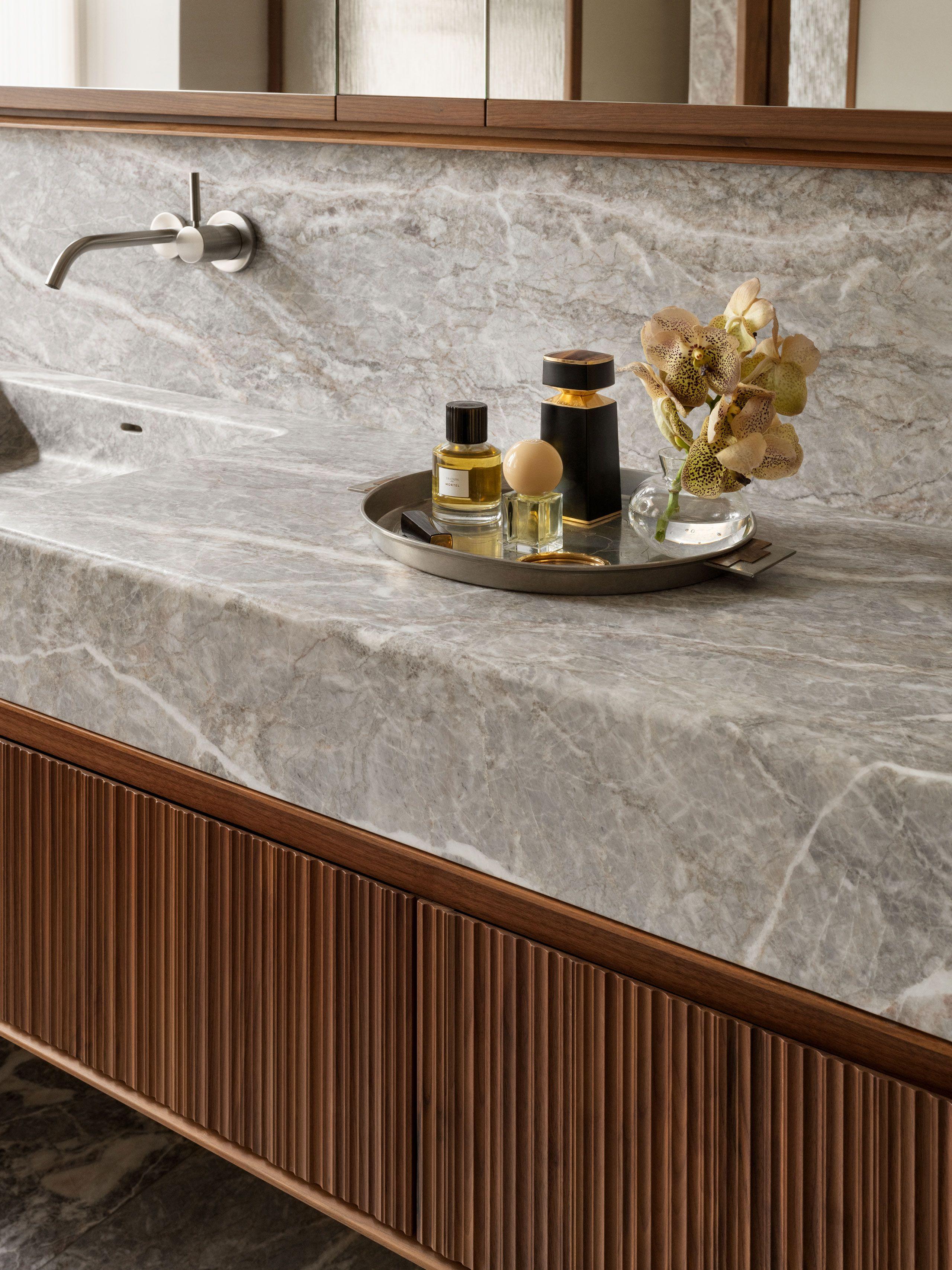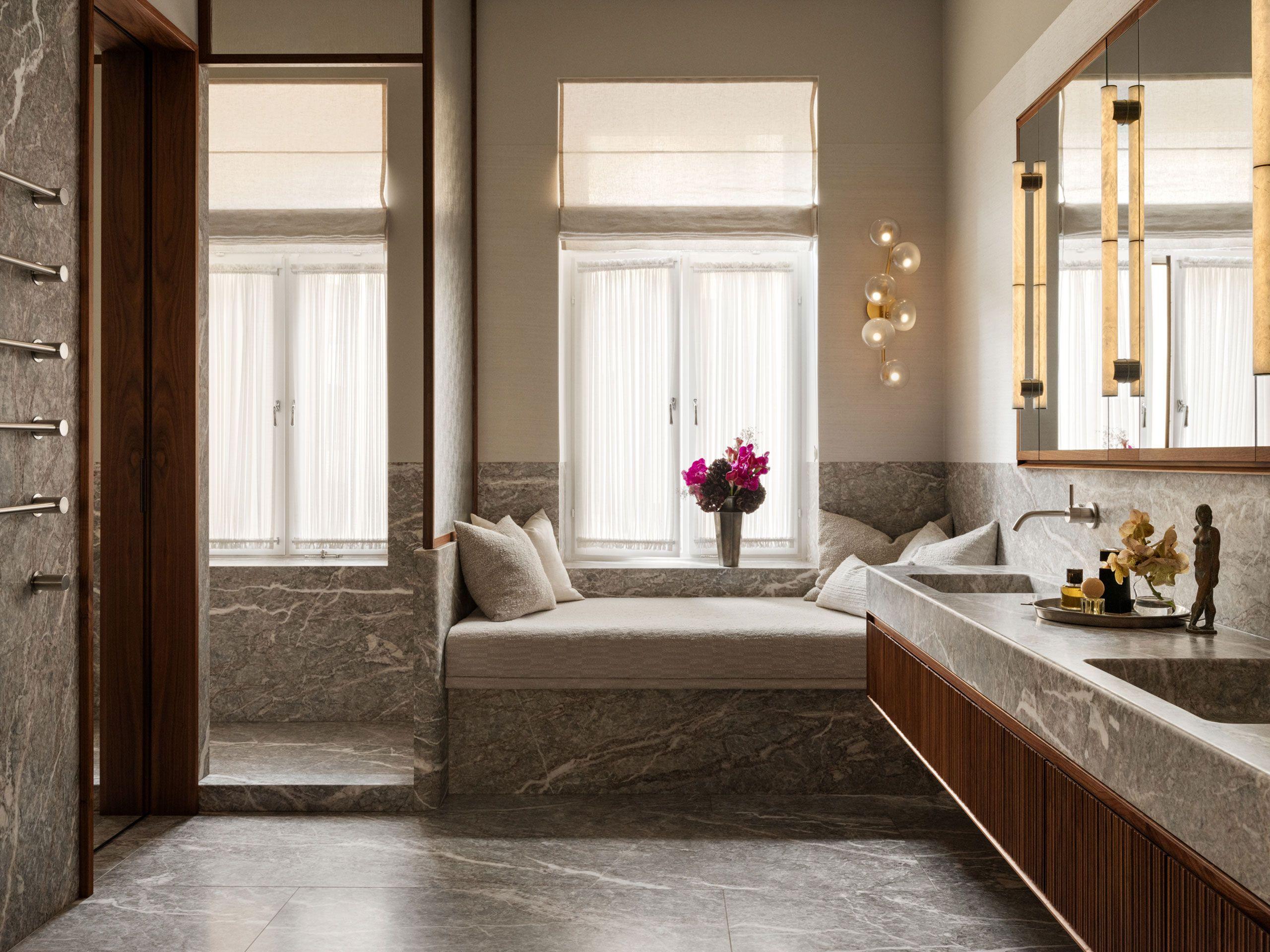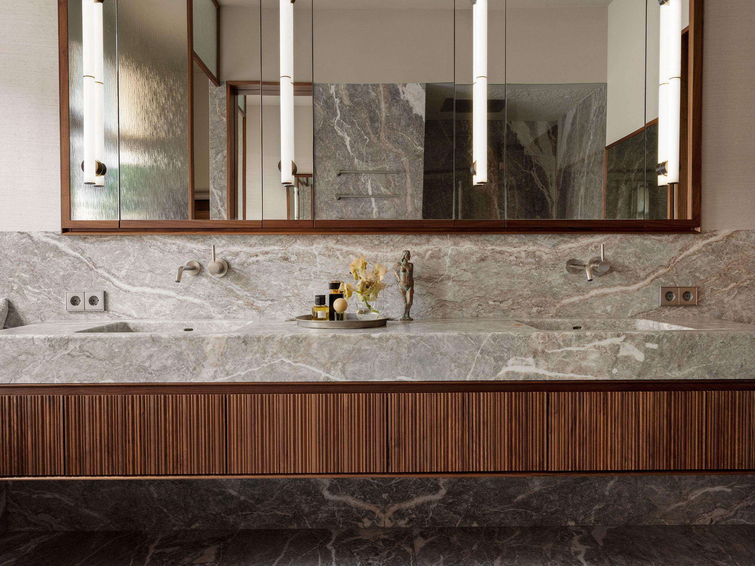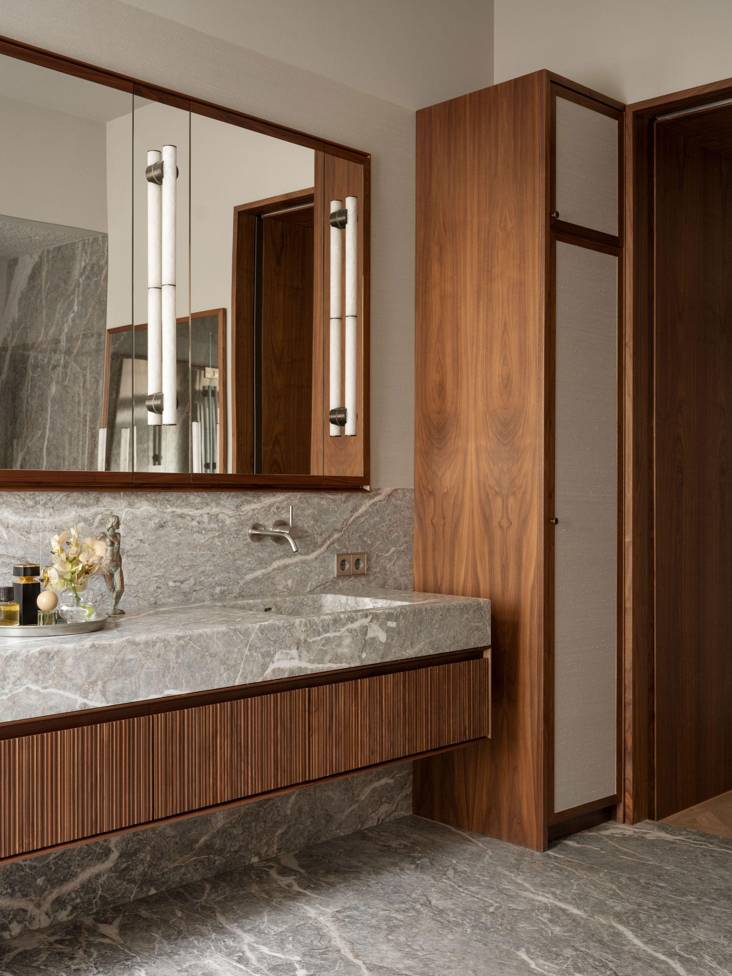 Этот подход ощущается во всем: исторические лепные карнизы и резные дверные молдинги соседствуют с современными минималистичными решениями, такими как кухонный остров из камня и нержавеющей стали или комод для ванной комнаты из мрамора и дерева.
