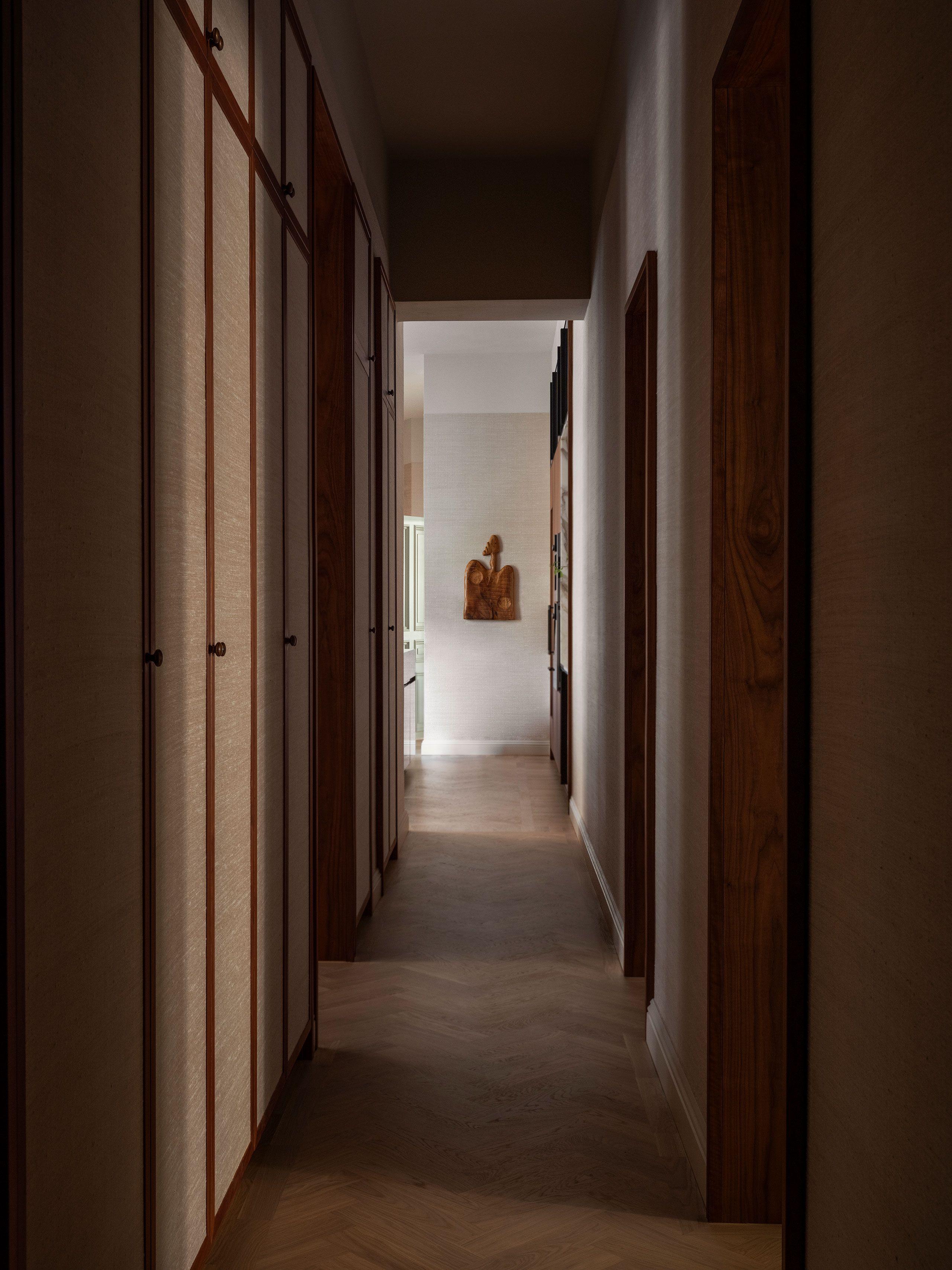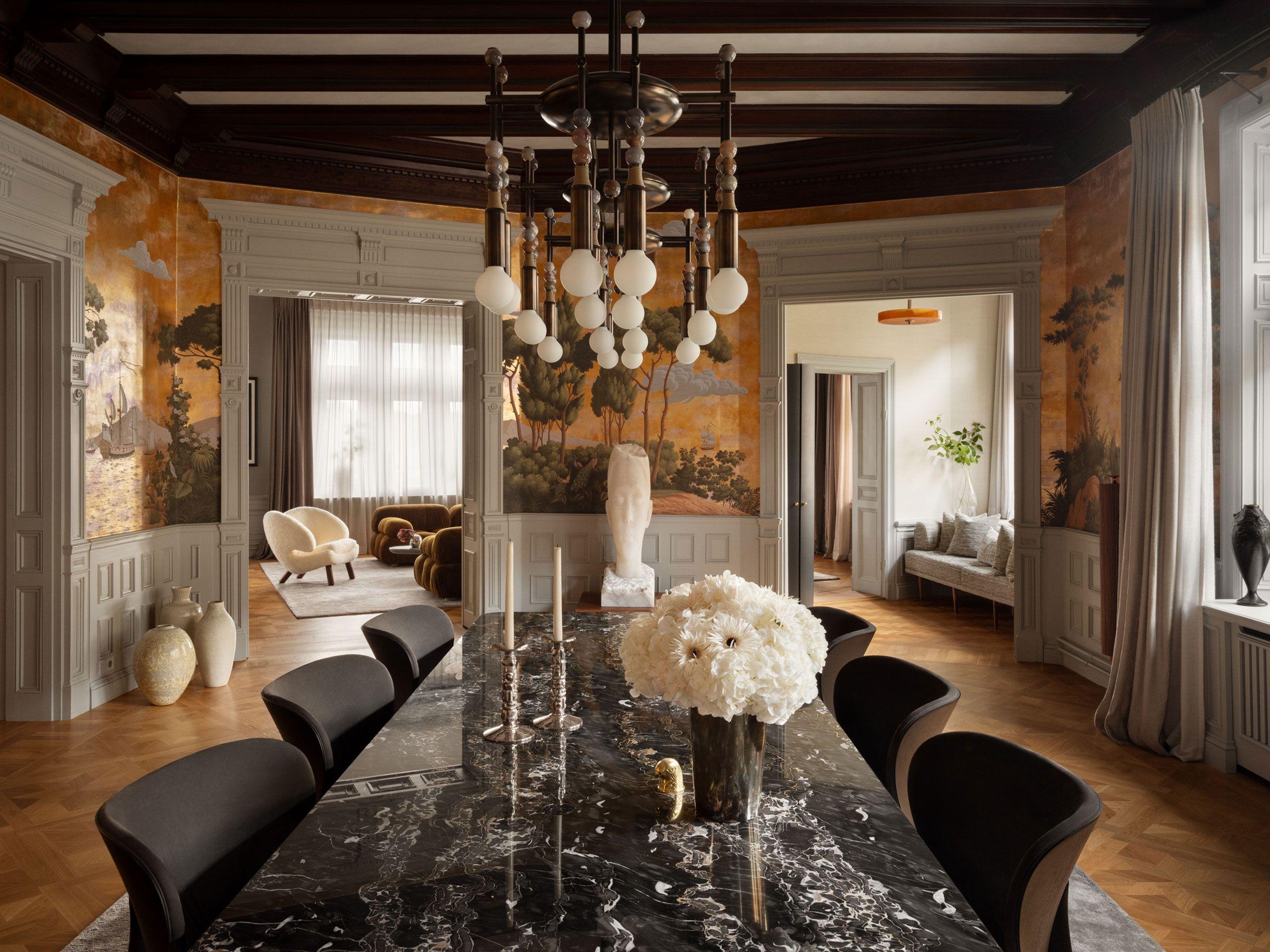 Основой интерьера стала сдержанная, но насыщенная палитра материалов: масляный паркет из дуба, столярные изделия из ореха, шелковые обои ручного плетения и итальянский мрамор. Они создают нейтральный фон, на котором особенно выразительно смотрятся культовые предметы мебели разных эпох.