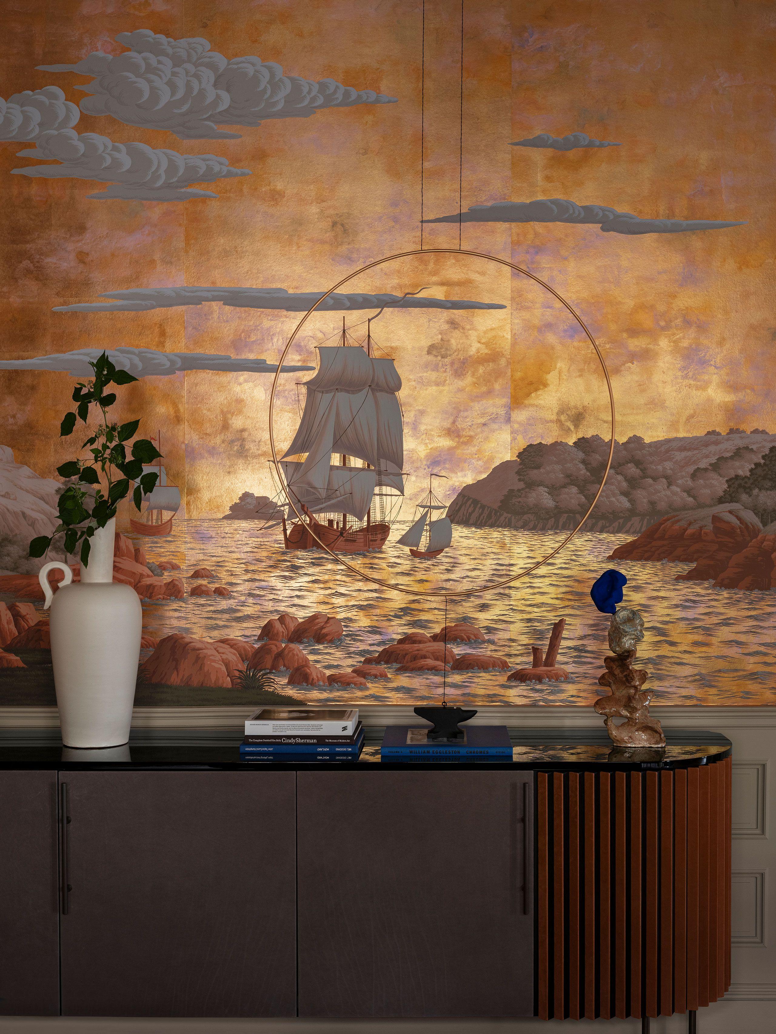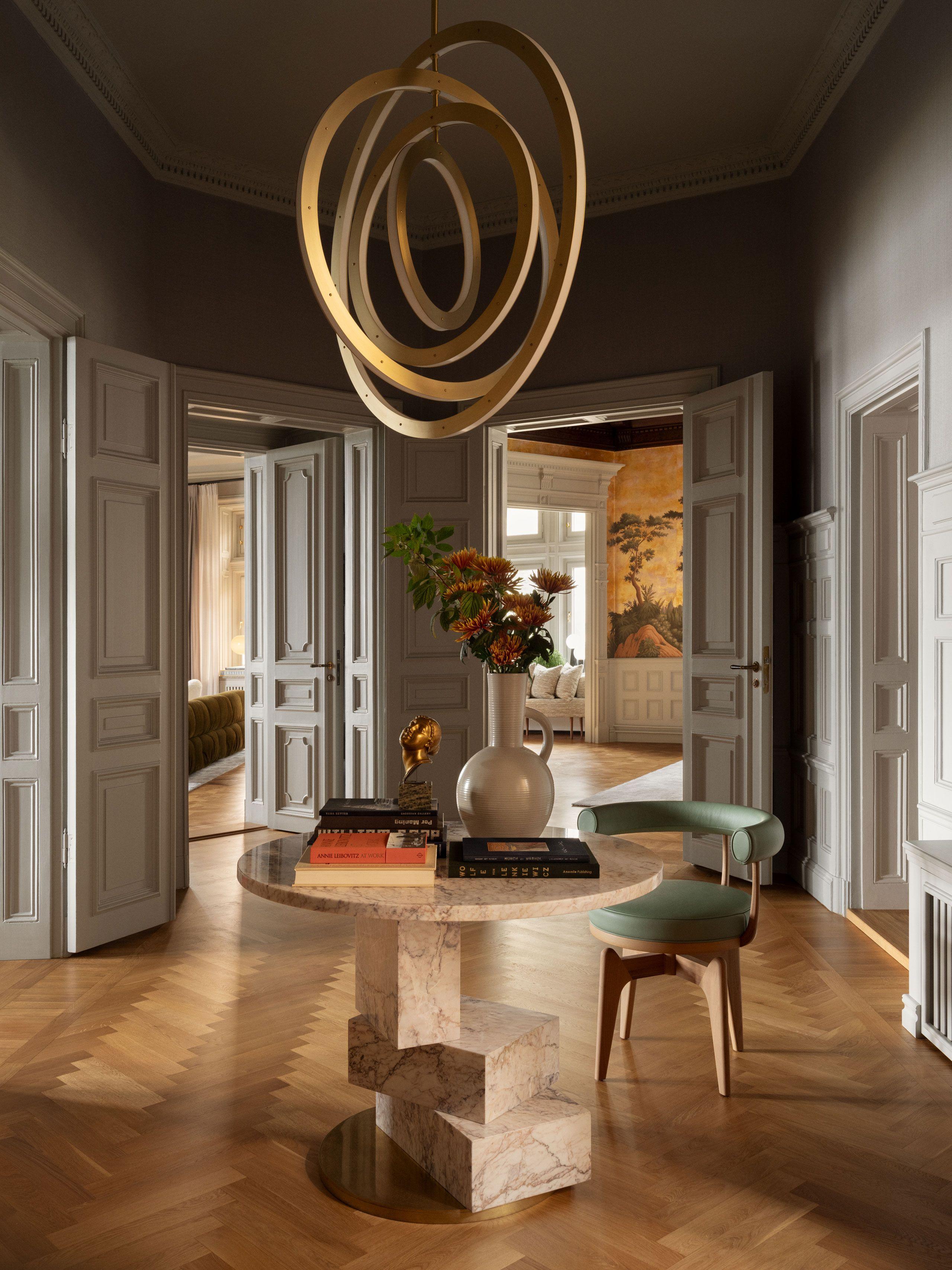 В прихожей парит подвесная лампа Halo Пола Лебаха из концентрических колец; в гостиной люстра Gem Branch от Giopato & Coombes напоминает цветущее дерево в хрустале; а в столовой подсвечник Talisman 14 Габриэля Хендифара, украшенный полудрагоценными камнями, отсылает к величию древнего Персеполя.