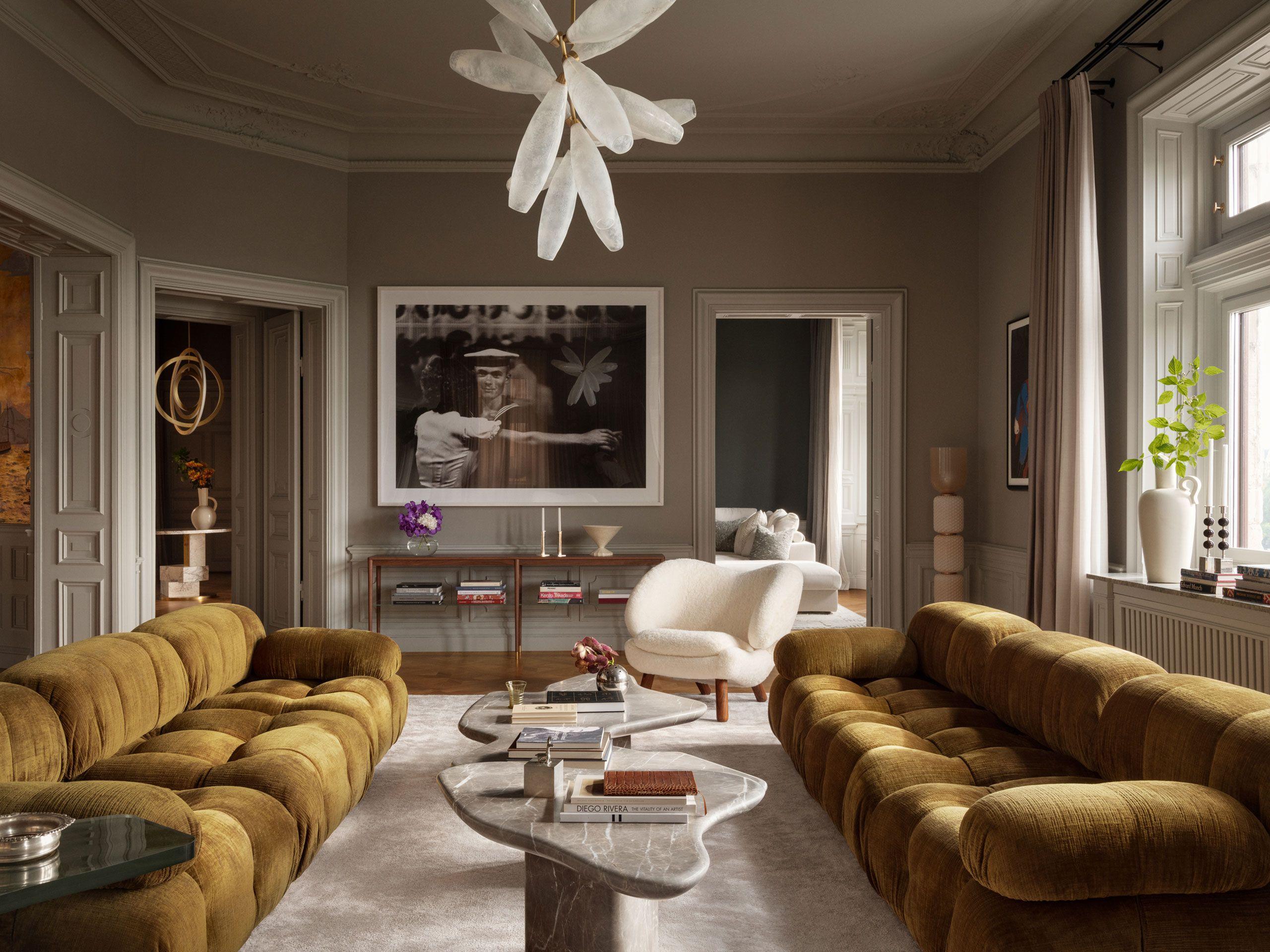 Меблировка напоминает кураторскую подборку шедевров дизайна. Вращающееся кресло Шарлотты Перриан для Cassina и кресло-«пеликан» Финна Юля в овчине привносят скульптурную мягкость, а плюшевый модульный диван Марио Беллини для B&B Italia задает тон гостиной.