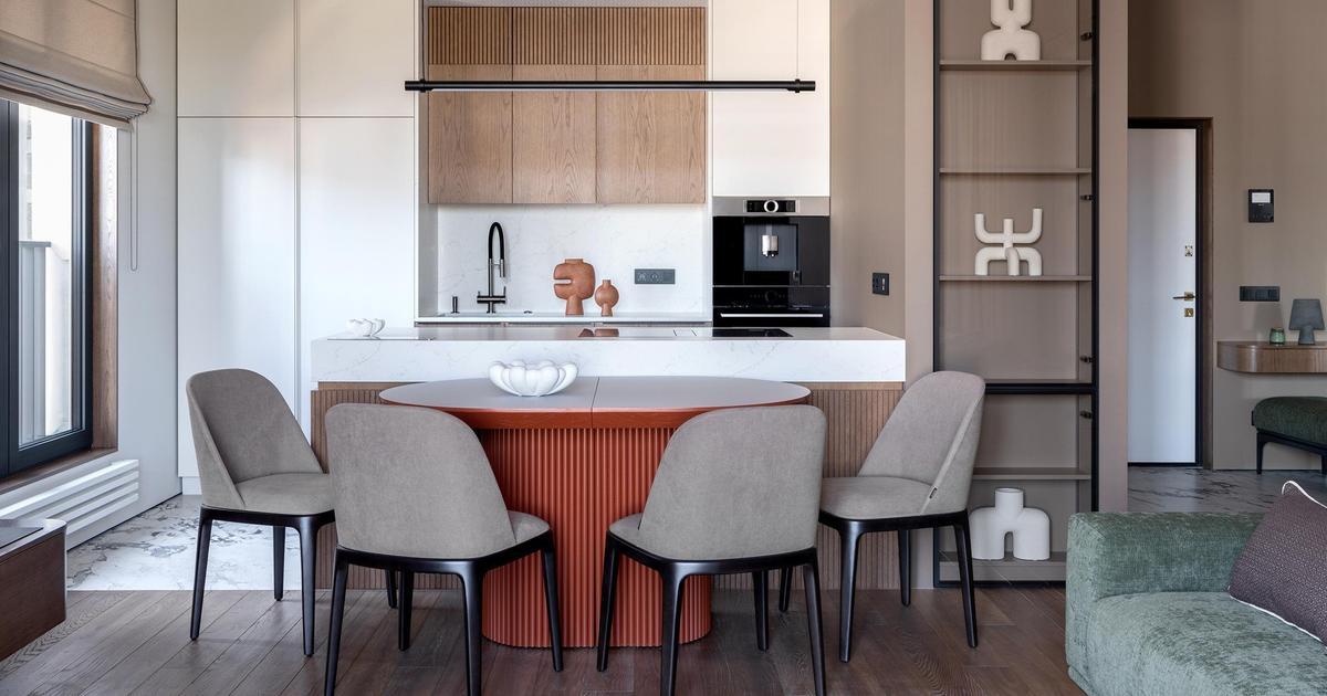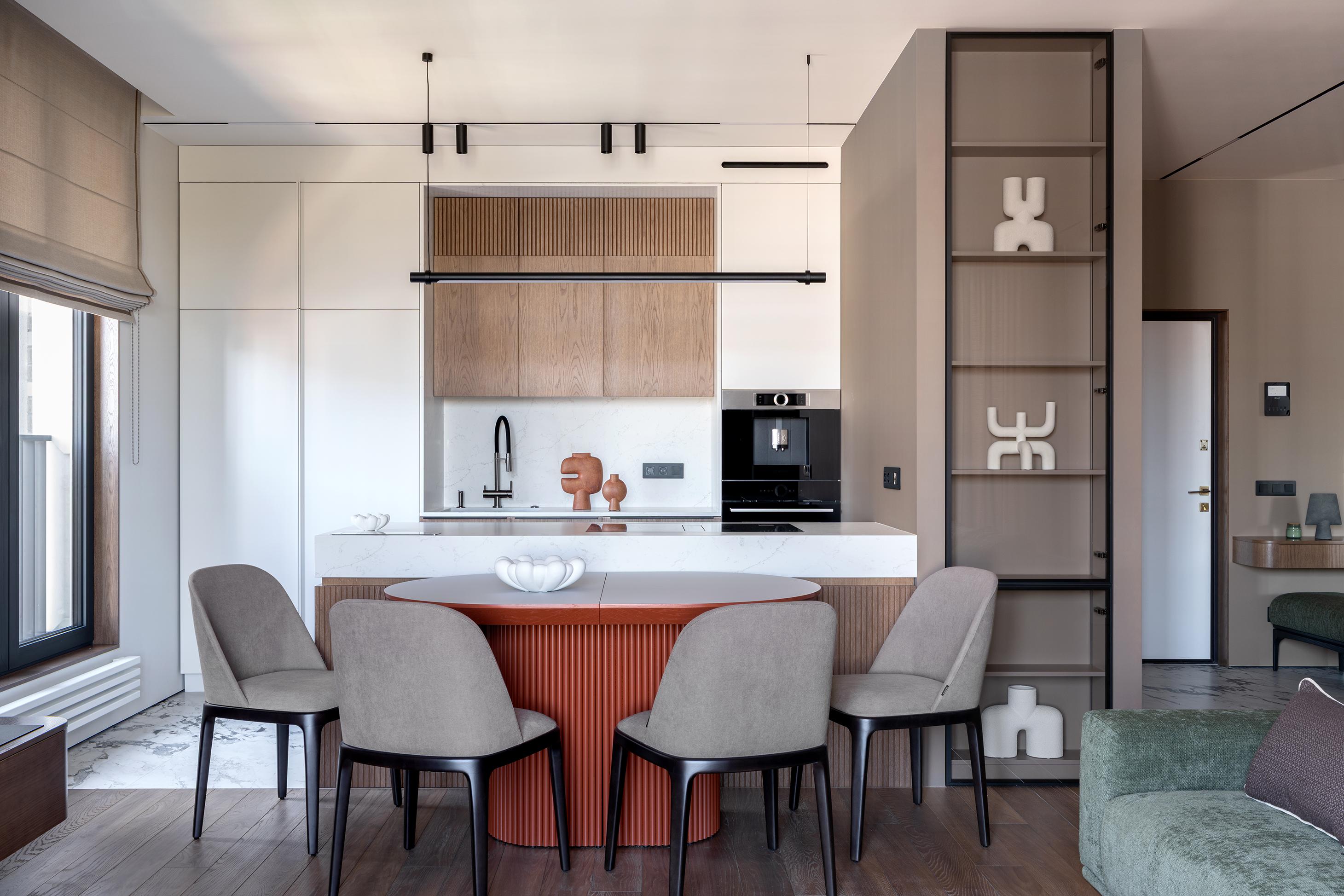 Радиатор, Home Heat. Инженерная доска, Citadel Parquet. Краска, Derufa. Шторы, Krasnova Textile. Двери, «Волховец». Корпусная мебель изготовлена на заказ, салон корпусной мебели «Интерьерно». Обеденный стол, Napilili. Обеденные стулья, «Лавсит». Подвесной светильник над островом, «ЦентрСвет». Камень на кухне, Majestic Stone. Керамогранит на полу, Atlas Concorde Russia. Керамогранит на стене, Italon. Мойка и смеситель, Omoikiri. Пуф в прихожей, Unika Moblar.