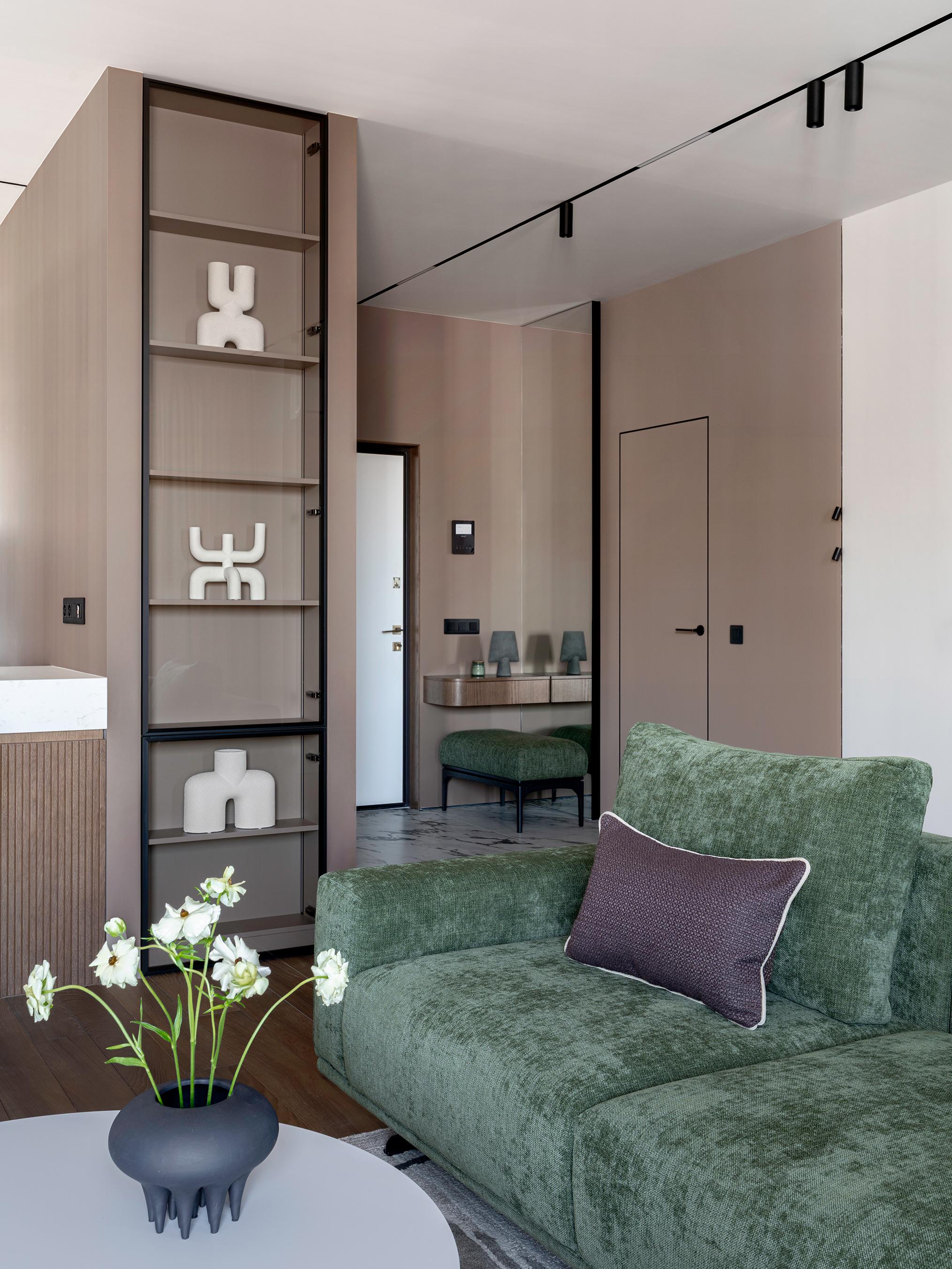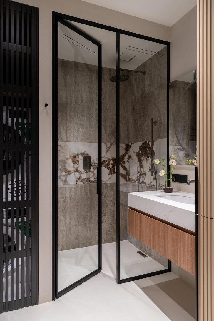 Стеклянная перегородка, «Формула Стекла». Камень на столешнице, Majestic Stone. Керамогранит Heritage Luxe и Les Bijoux, Rex.
