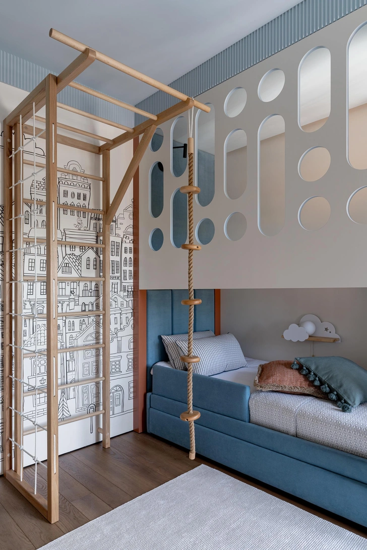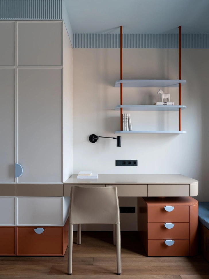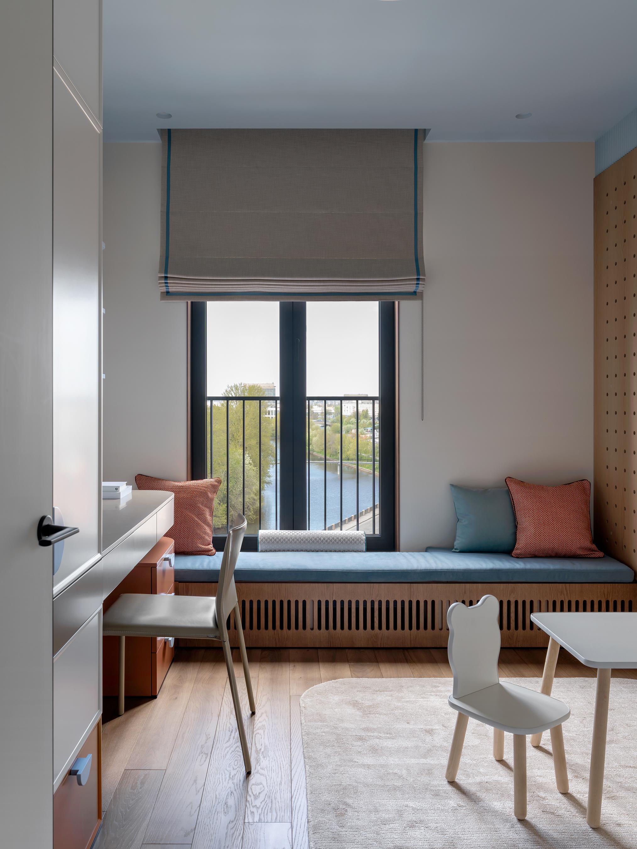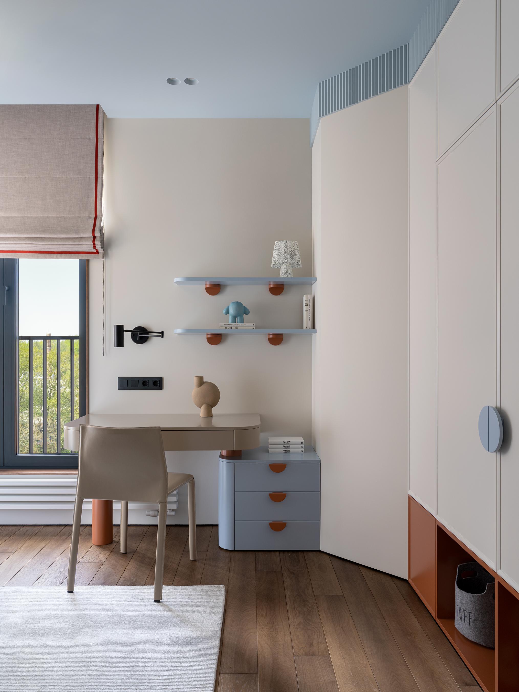 Пока дети маленькие, они будут жить в одной комнате, но когда вырастут — у каждого появится своя комната. Чтобы легко адаптировать интерьер без большого ремонта и учесть меняющиеся вкусы детей, мы предусмотрели несколько решений. Двухъярусную кровать мы изготовили на заказ: верхняя часть остается на месте, а нижнюю часть можно перенести в соседнюю комнату, для нее даже заранее изготовили дополнительное изголовье и спинку. В свободной нише можно будет сделать зону для игр, отдыха и чтения. Продумали мы и декоративные детали — мебельные ручки, например, можно будет заменить, если захочется более «взрослого», серьезного интерьера. Работой с разными сценариями в детской мы особенно гордимся.