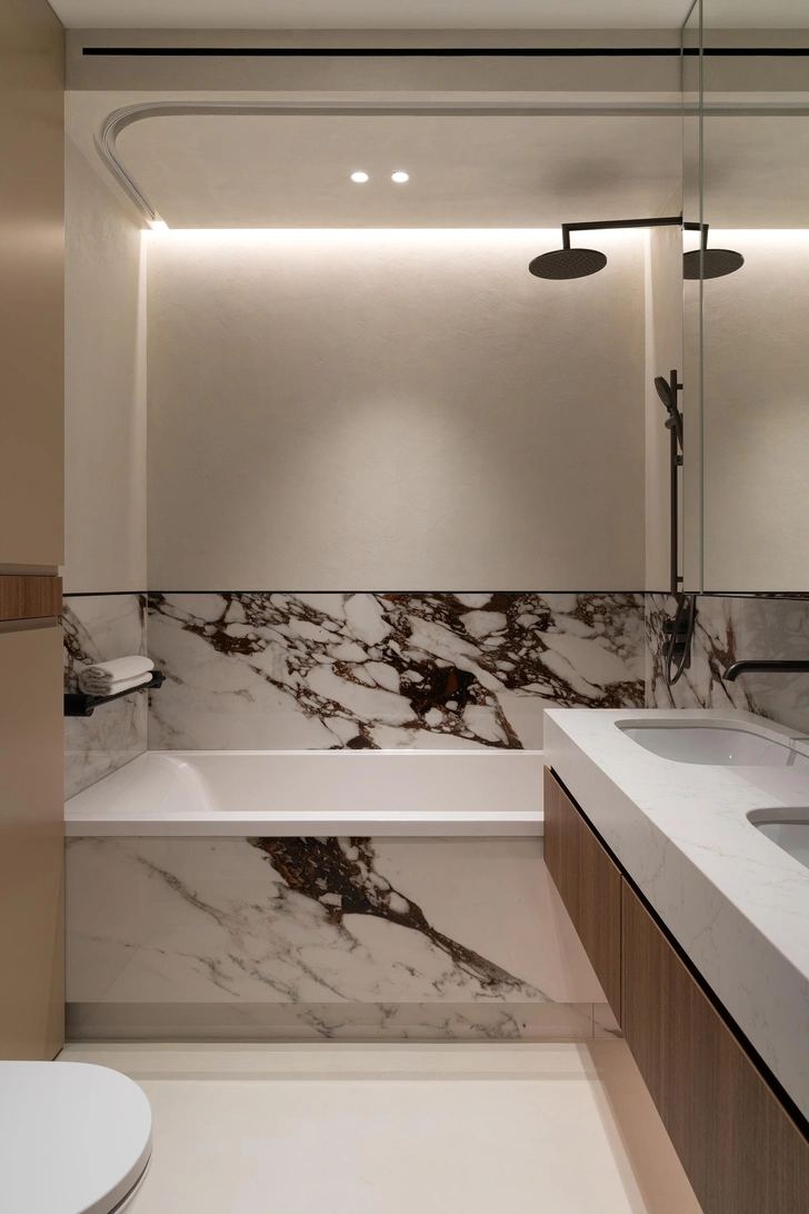 Ванна, «Эстет». Сантехника, Boheme и Deante. Керамогранит Les Bijoux, Rex. Микроцемент, Piterra. Камень на столешнице, Majestic Stone.