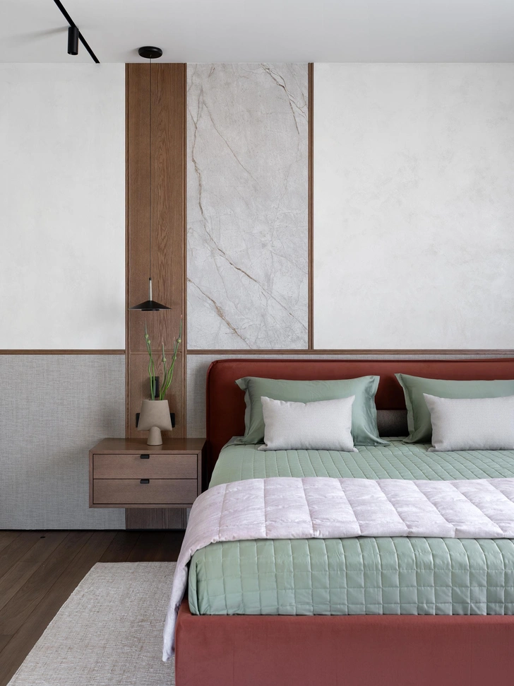 Кровать, SK Design. Подвесные светильники, Basic Decor. Обои, Decor Studio API. Микроцемент, Piterra. Керамогранит, Atlas Concorde Russia.