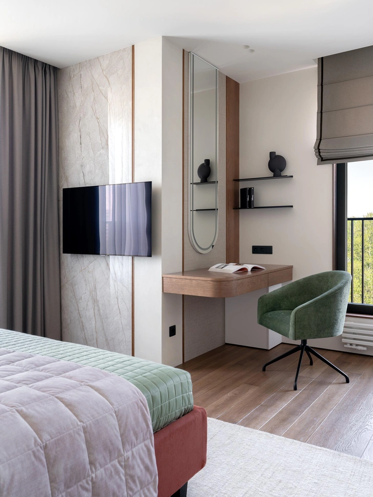 Самая сложная планировка была у спальни — диагональный срез стены, окна по двум сторонам. Выровняв угол, мы немного сократили фактическую площадь, зато значительно увеличили полезную. Пространство стало логичнее и функциональнее — нам удалось разместить и ТВ-зону и туалетный столик.