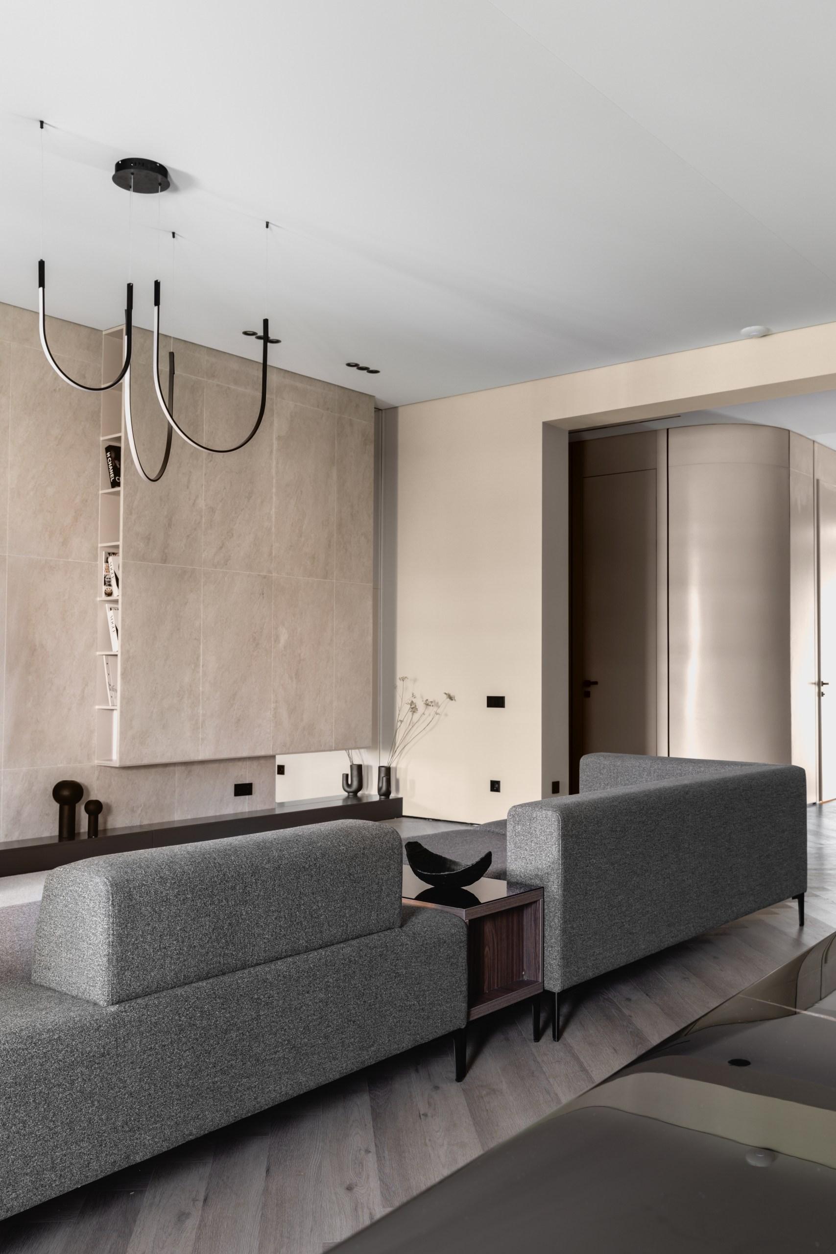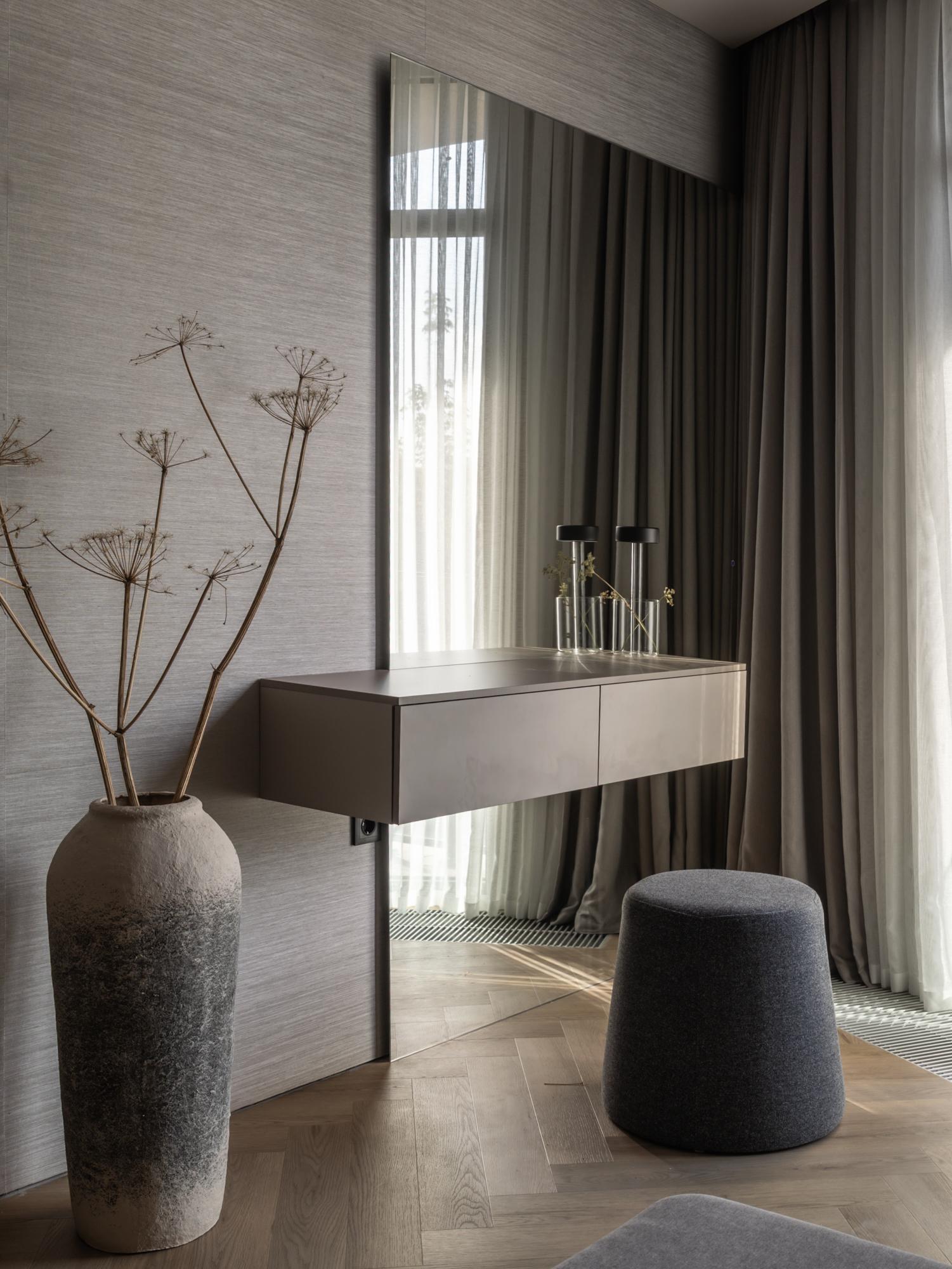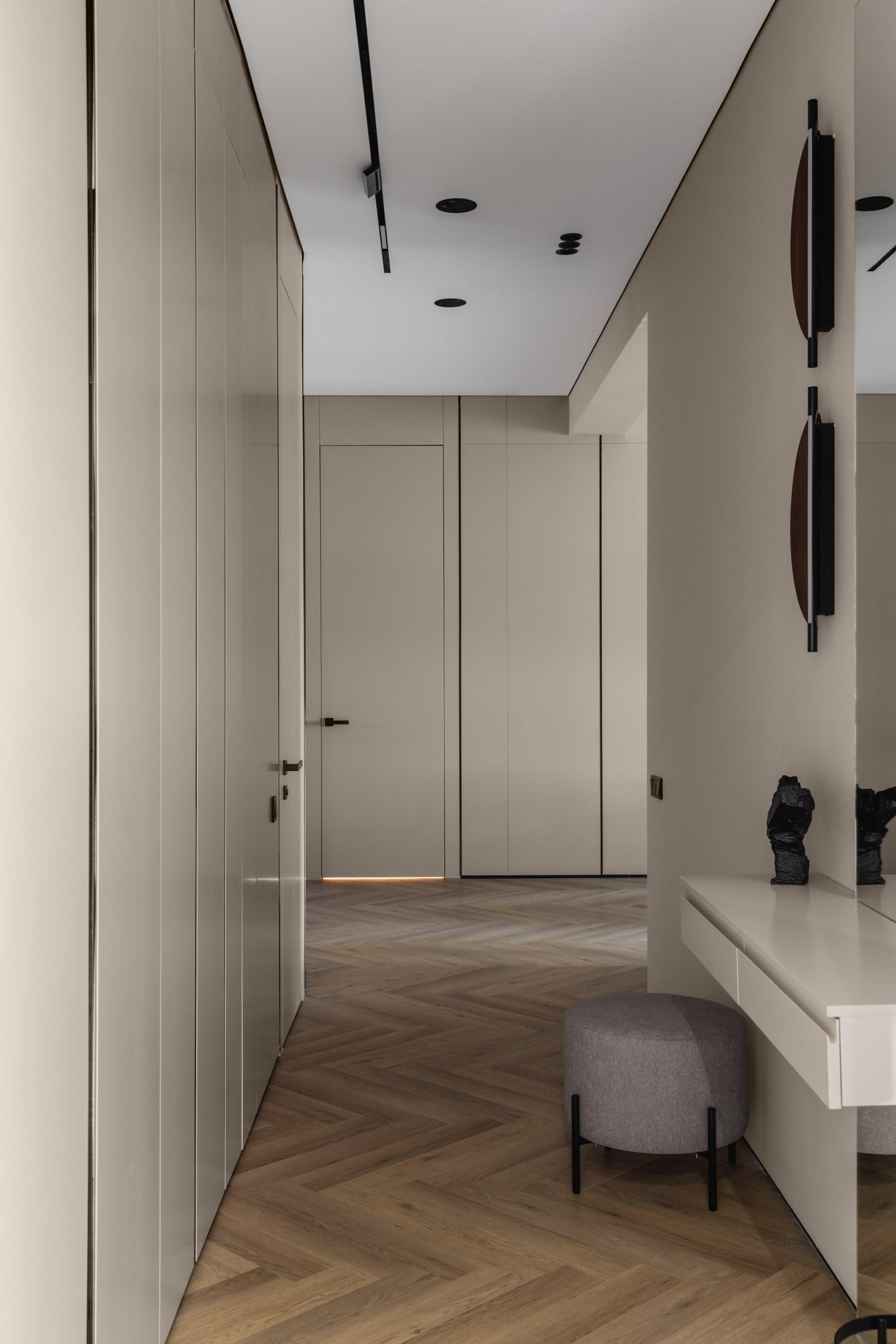 Заказчик хотел интерьер, похожий на комфортные отельные номера, но с домашним теплом и функциональностью. Светлая и просторная планировка, натуральные материалы и цвета — все для спокойной жизни. В основном здесь доминирует серо-бежевый, но встречаются и контрастные акценты — черный и охра.