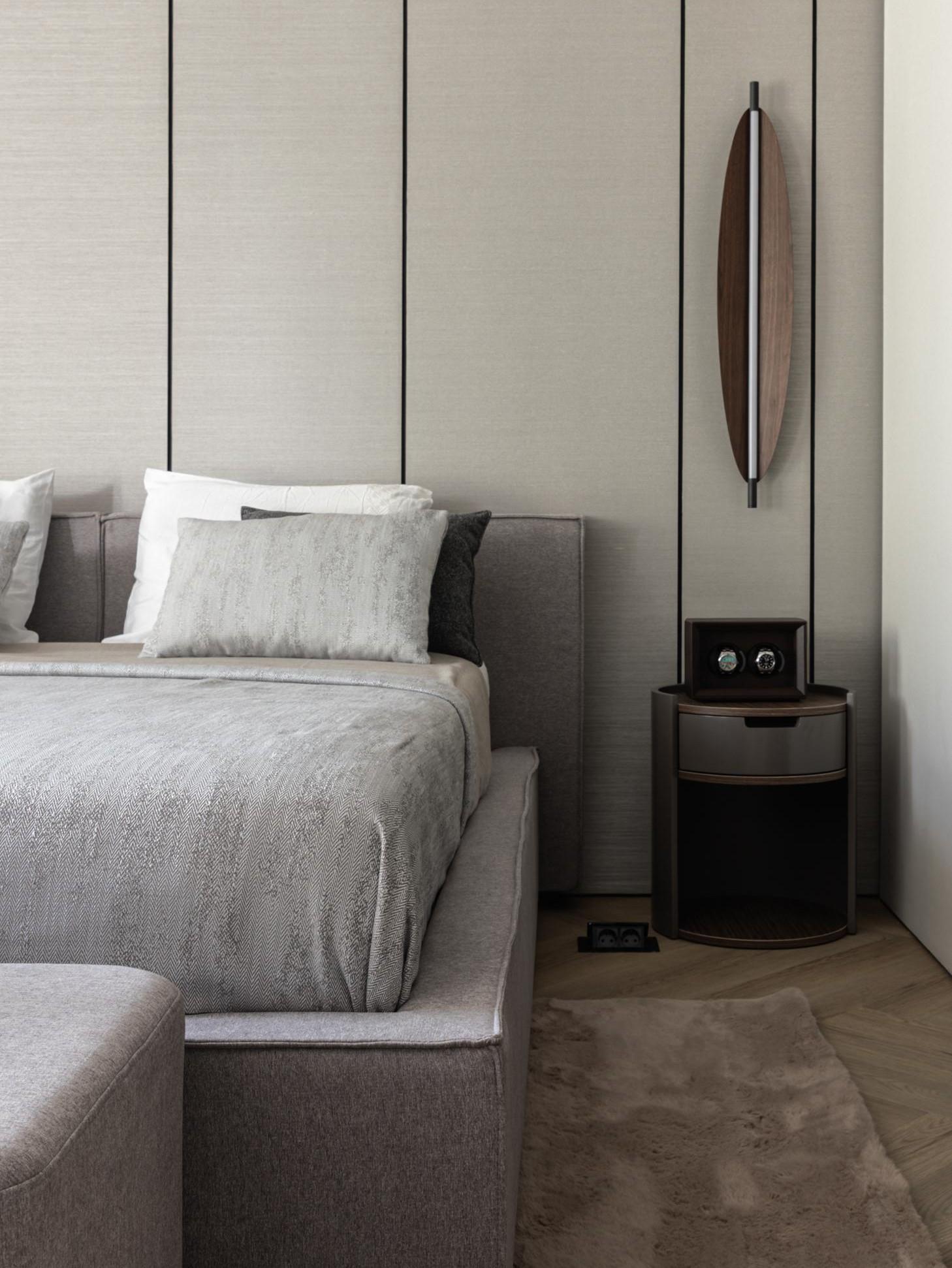 В спальнях уют создали с помощью льняных обоев и штор, создающие мягкий рассеянный свет. Продумали комнаты и для будущих детей: антивандальная мебель и стены, мягкие углы, кварцвинил — все для того, чтобы они смогли бегать по просторной квартире.
