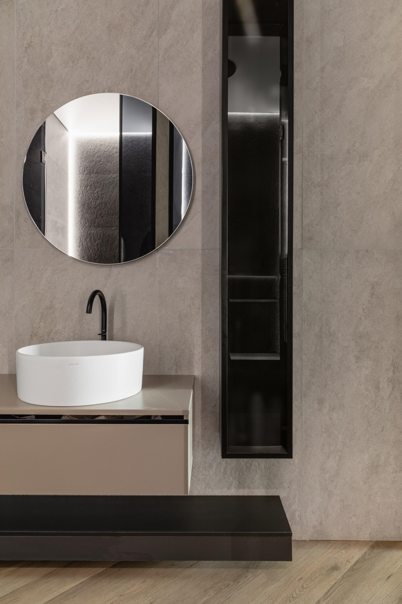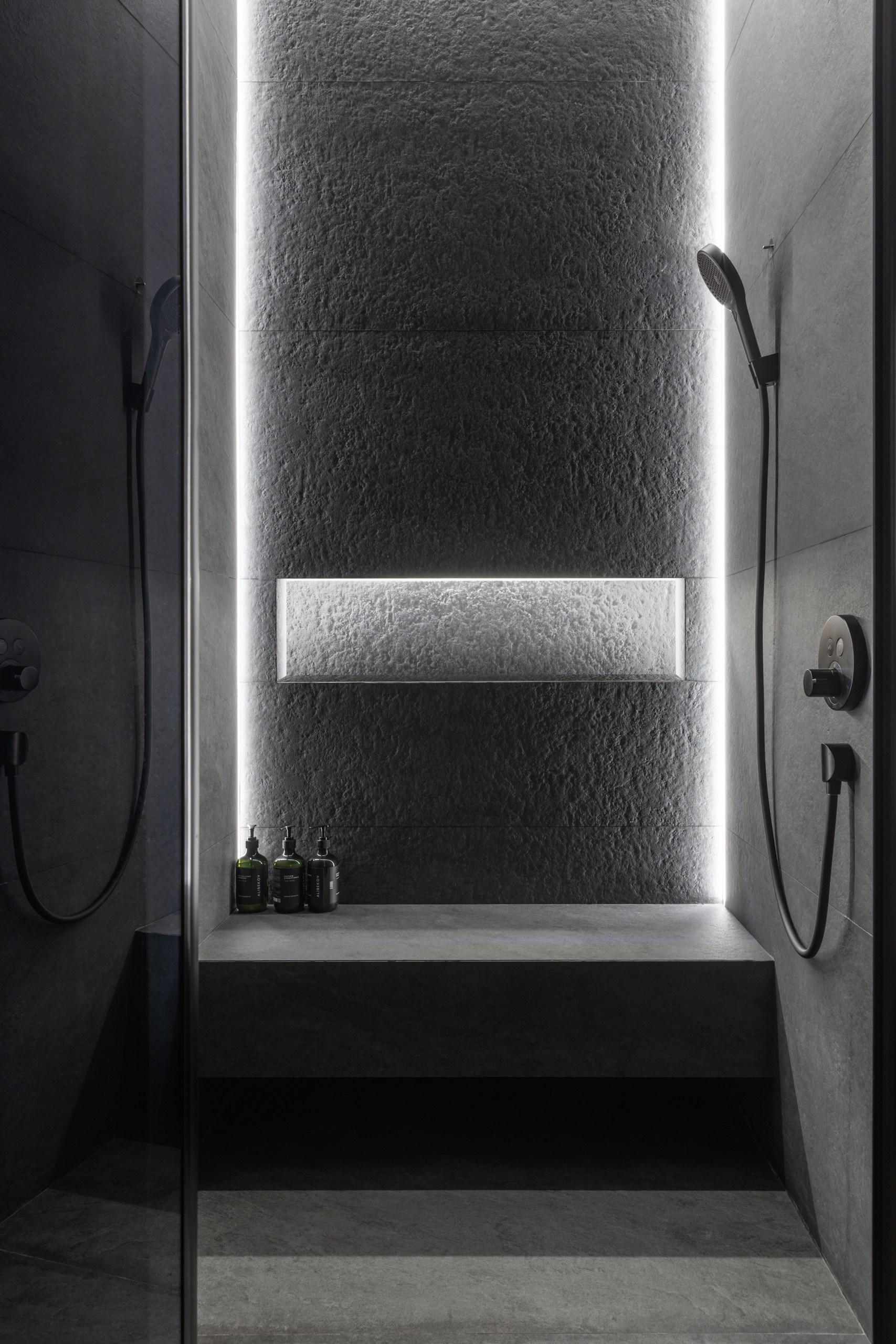 В душевой зоне мастер-ванной установлен хамам. Все системы мы встроили в стены и потолок, чтобы исключить визуальный шум, который часто бывает в санузлах.
