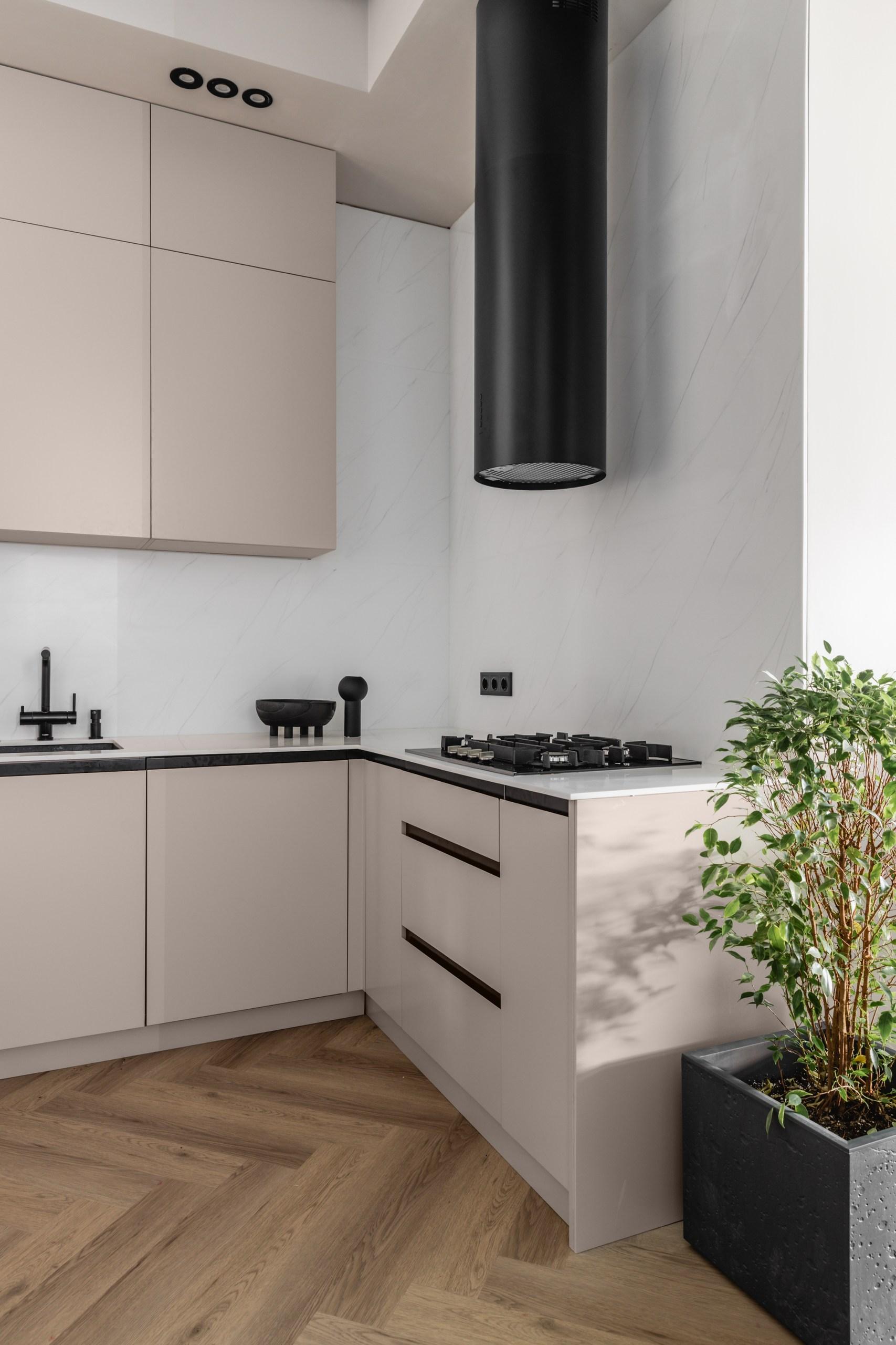Кухня небольшая: молодая семья больше любит обедать в ресторанах. Отсюда есть два выхода, в гостиную и в прихожую — это очень удобно, когда хозяева приглашают повара. Акцентным элементом здесь мы решили сделать черную вытяжку.