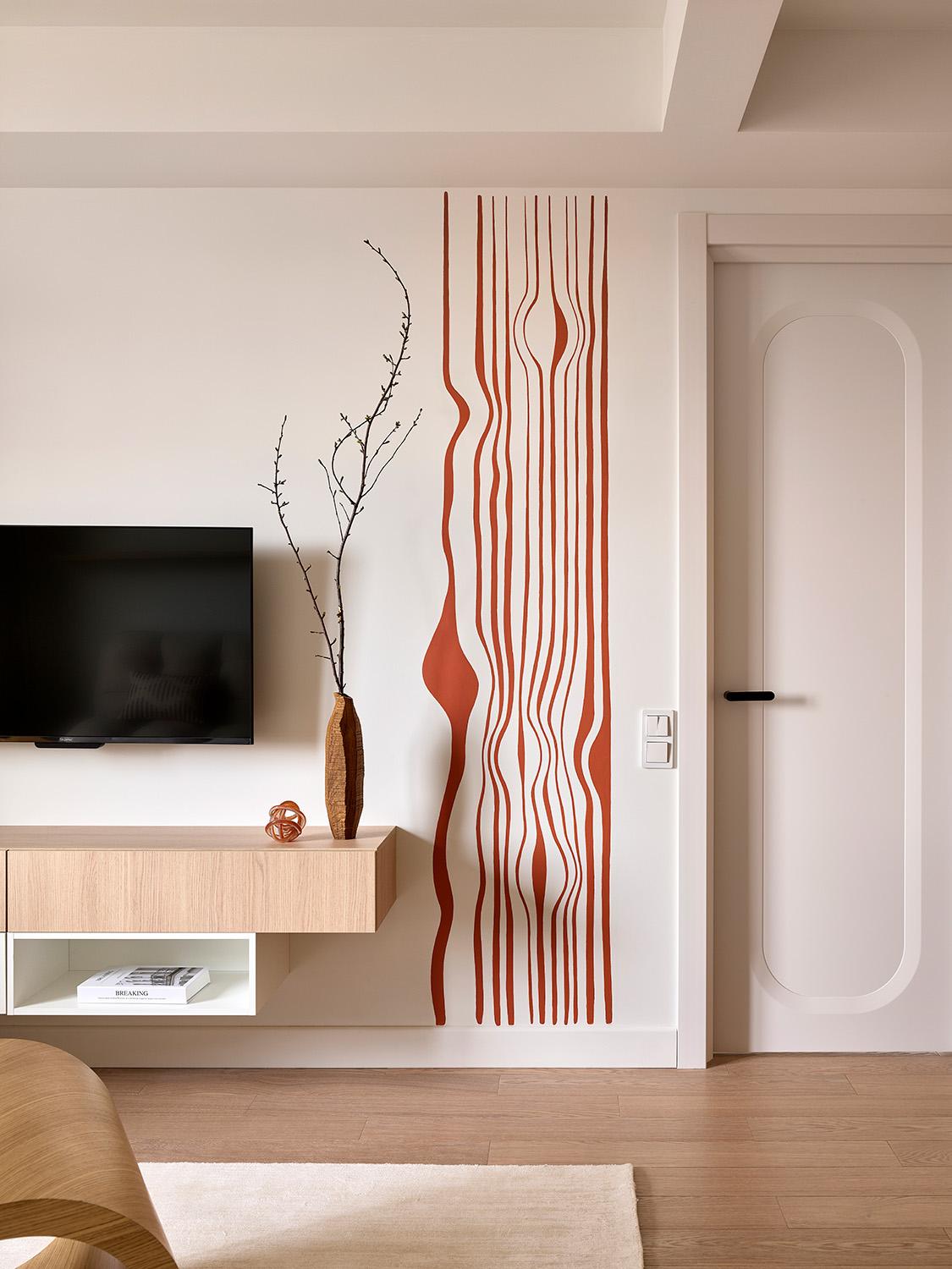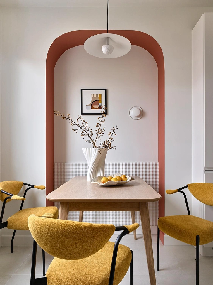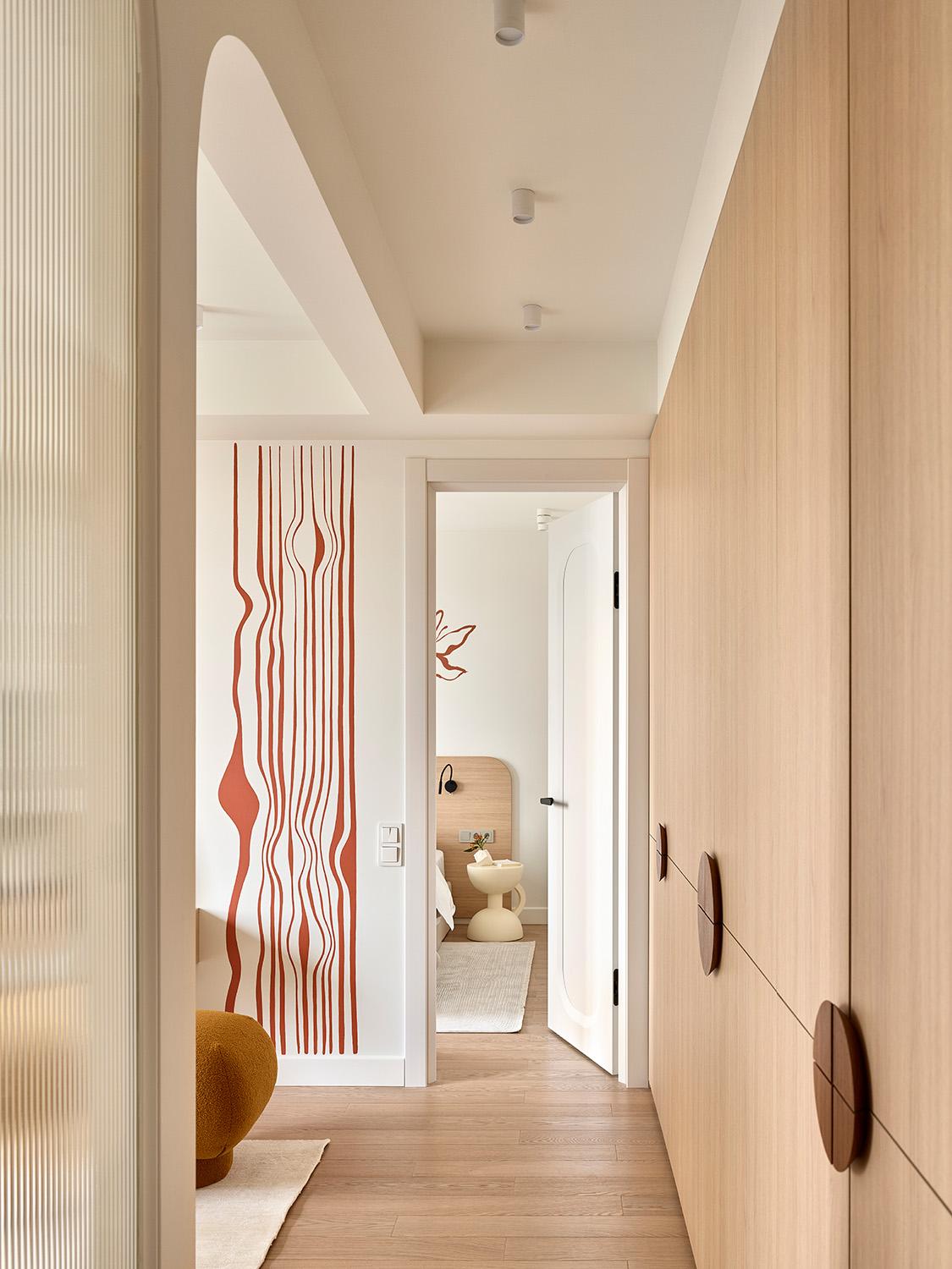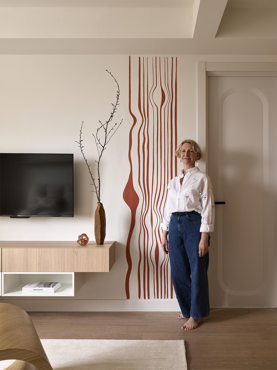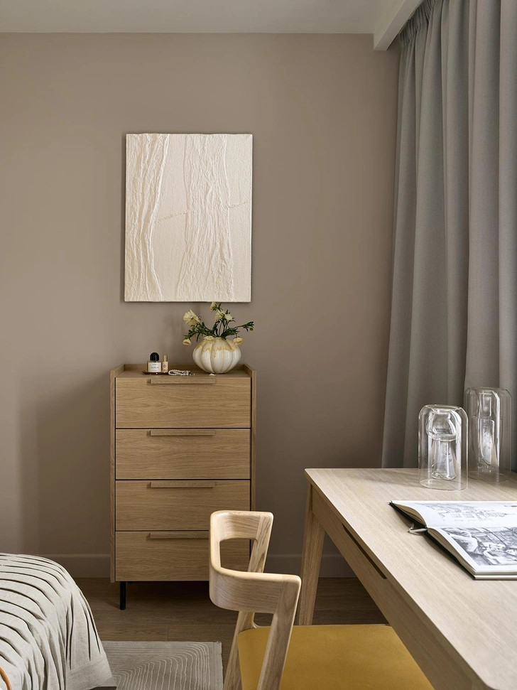 В проекте участвовали художники Антонина Гарасько и Владимир Озеров. Их лаконичная терракотовая роспись в гостиной и спальне придала интерьеру индивидуальность. Мы сделали много эскизов и думали, что выбрать. Среди вариантов были более смелые, которые мне нравились как дизайнеру. Но я понимала, что квартира будет сдаваться, и поэтому подход нужен универсальный. Так что даже устроили голосование в соцсетях — и правда, большинству понравился более спокойный вариант.