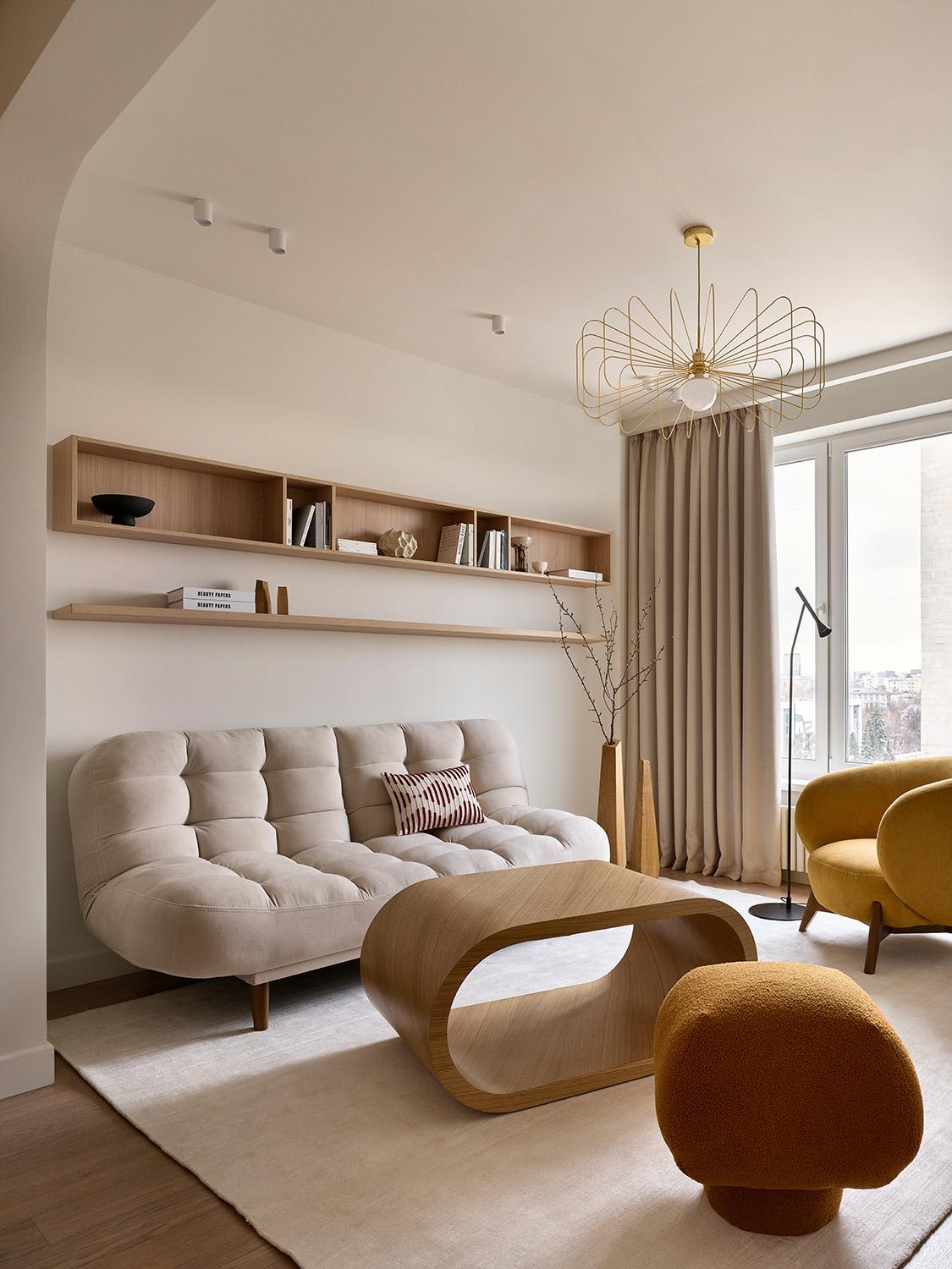 Краска, «Авиум». Полы, инженерная доска «Корона паркет». Журнальный стол «Цикл», «ОдинГений». Диван, кресло и пуф, Divan.ru. Полки изготовлены по эскизам дизайнера, мастерская Андрея Александрова. Ковер, Kover.ru. Деревянные вазы, Modenature. Керамика, 101 Copenhagen. Шторы, @Lovelyhome. Основной светильник и торшер, Aromas del campo, «Палантир».