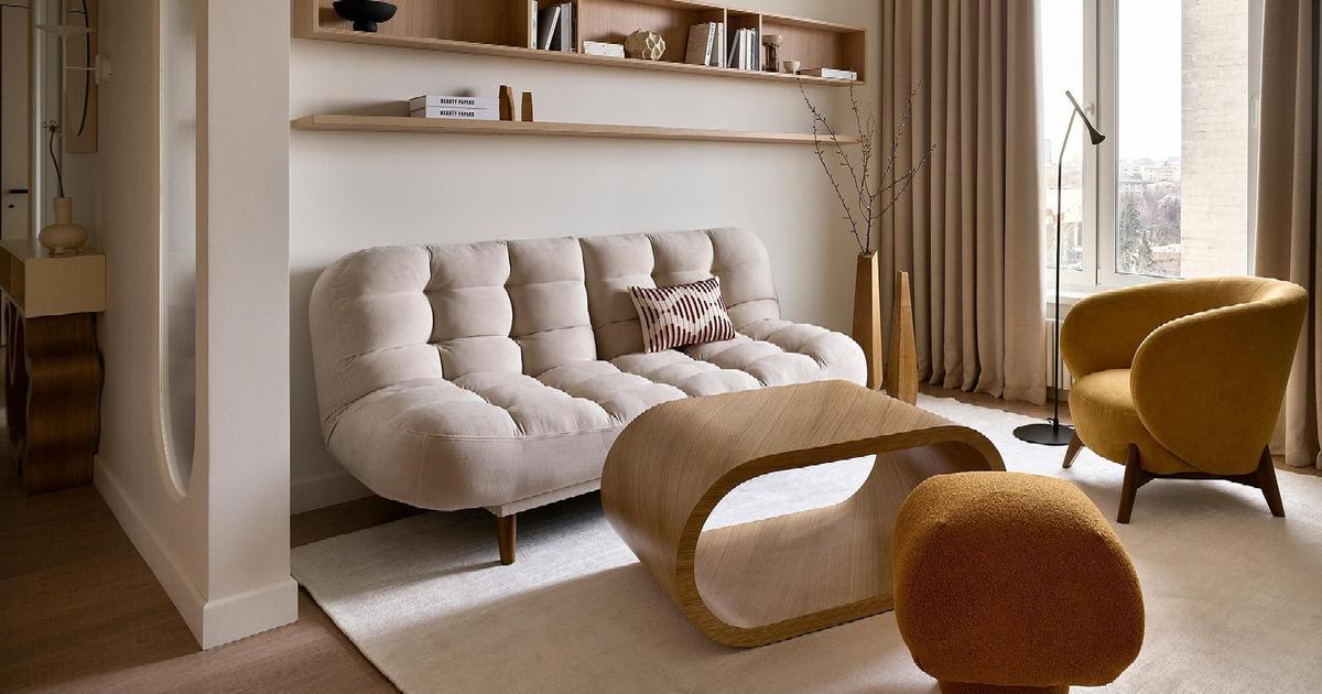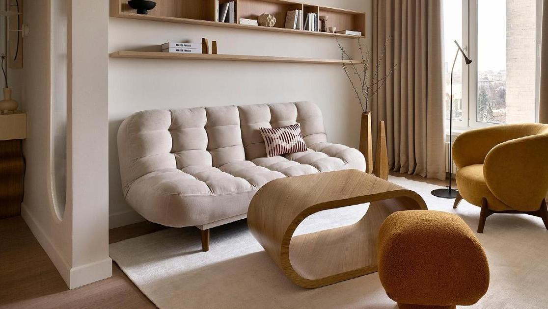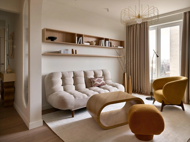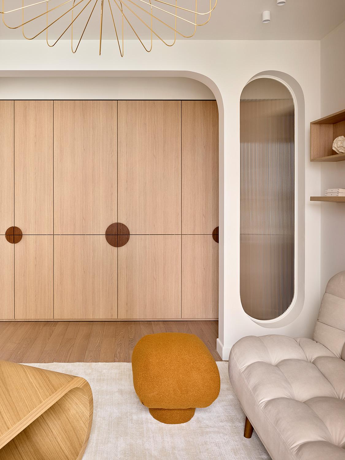 Все это мы смогли обыграть: пилон зашили, скруглили, и получилась милая ниша, в которую отлично вписался обеденный стол. А из геометрии балок в гостиной мы сделали интересный элемент зонирования, спроектировав небольшой простенок со стеклом-плиссе, отгораживающий приватную зону у дивана.