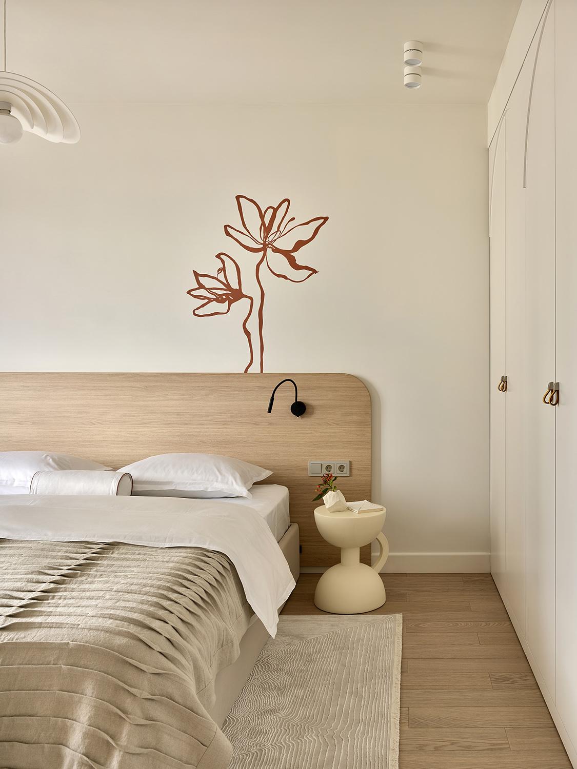 Кровать, «Аскона». Изголовье и гардероб изготовлены по эскизам дизайнера, мастерская Андрея Александрова. Ковер, Kover.ru. Подвесной светильник Selenitis, Market Set (Interio 22). Бра на изголовье, Aromas del campo, «Палантир». Роспись на стене, Антонина Гарасько и Владимир Озеров. Покрывало и постельное белье, Ateliertati.
