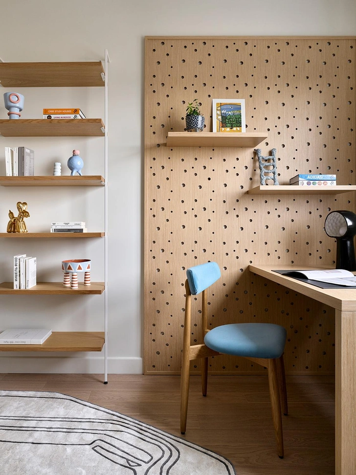 Шпонированная панель с перфорацией и рабочий стол изготовлены по эскизам дизайнера, мастерская Андрея Александрова. Стул и открытый стеллаж, SK design. Настольная лампа Keni, Izzy Decor. Керамический декор, Miropottery.