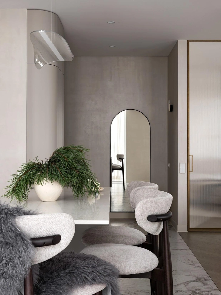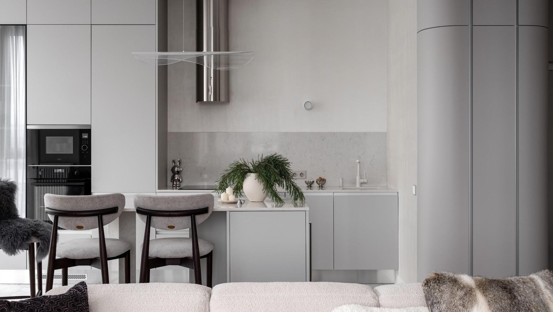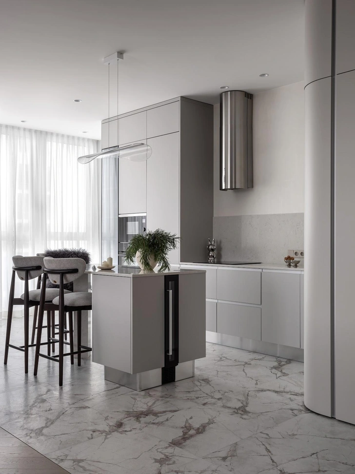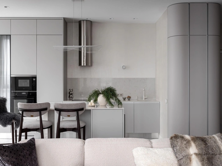 В квартире открытая планировка, зонирование здесь негрубое, гибкое. Кухню с компактным, но вместительным хранением обрамляет радиусный шкаф — легкая граница между прихожей и общей зоной. Это мой любимый элемент в этом проекте, он создан по индивидуальным эскизам и получился очень стильным и практичным. Мягкие линии делают его воздушным, скругленные углы отлично дополняют архитектуру пространства. Он помог избежать нам громоздких решений.