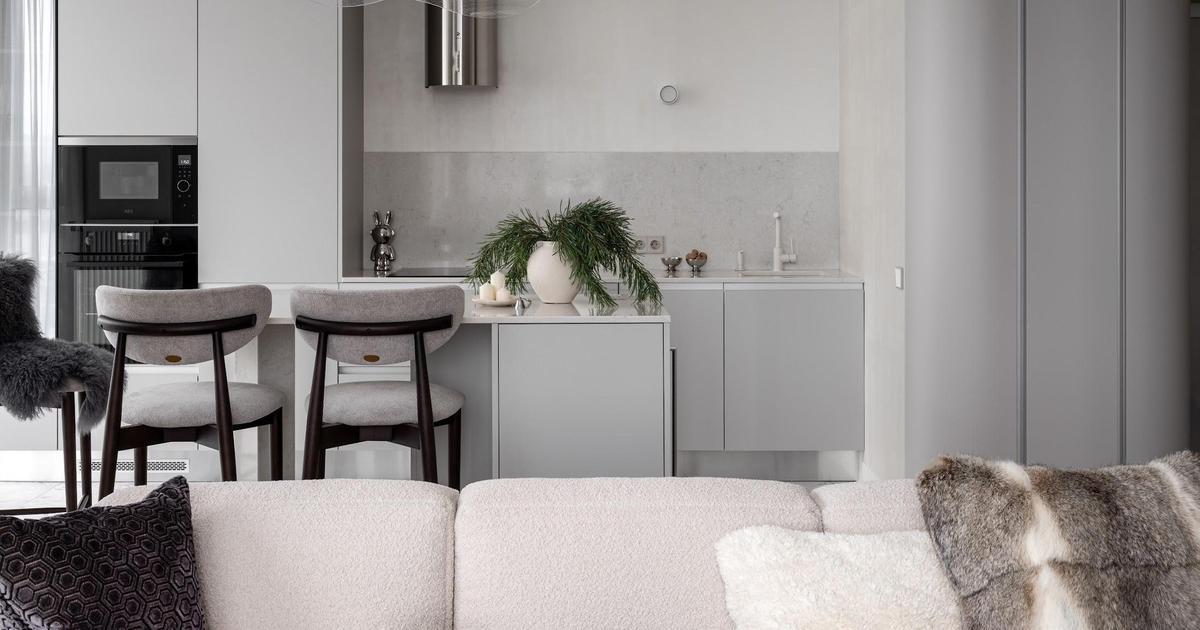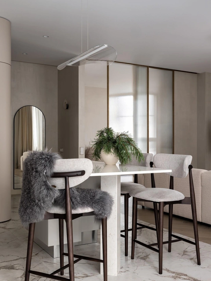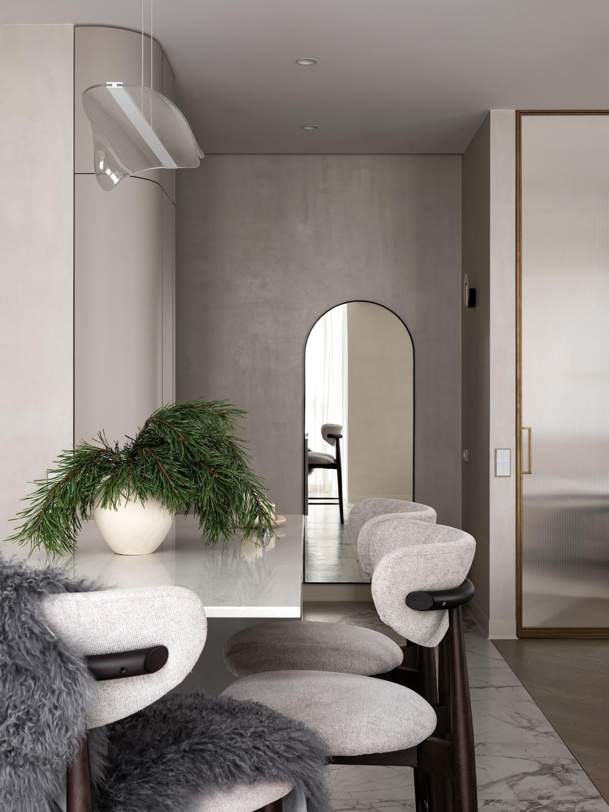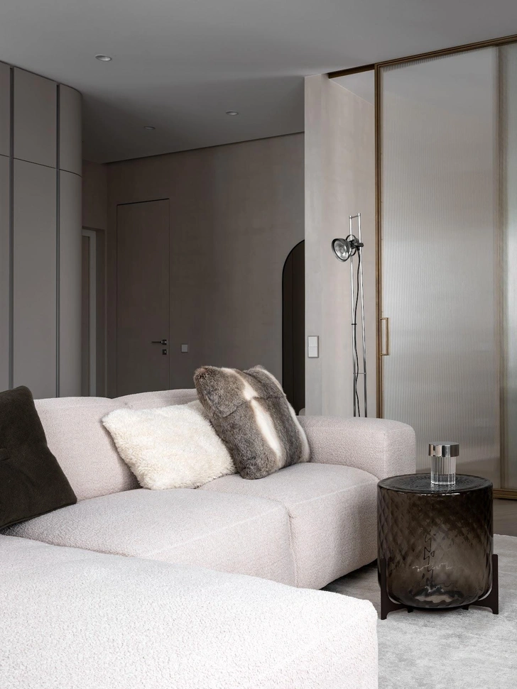 В квартире открытая планировка, зонирование здесь негрубое, гибкое. Кухню с компактным, но вместительным хранением обрамляет радиусный шкаф — легкая граница между прихожей и общей зоной. Это мой любимый элемент в этом проекте, он создан по индивидуальным эскизам и получился очень стильным и практичным. Мягкие линии делают его воздушным, скругленные углы отлично дополняют архитектуру пространства. Он помог избежать нам громоздких решений.