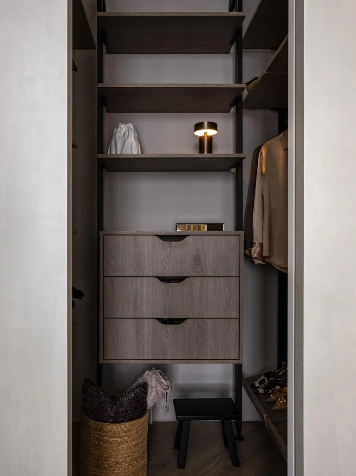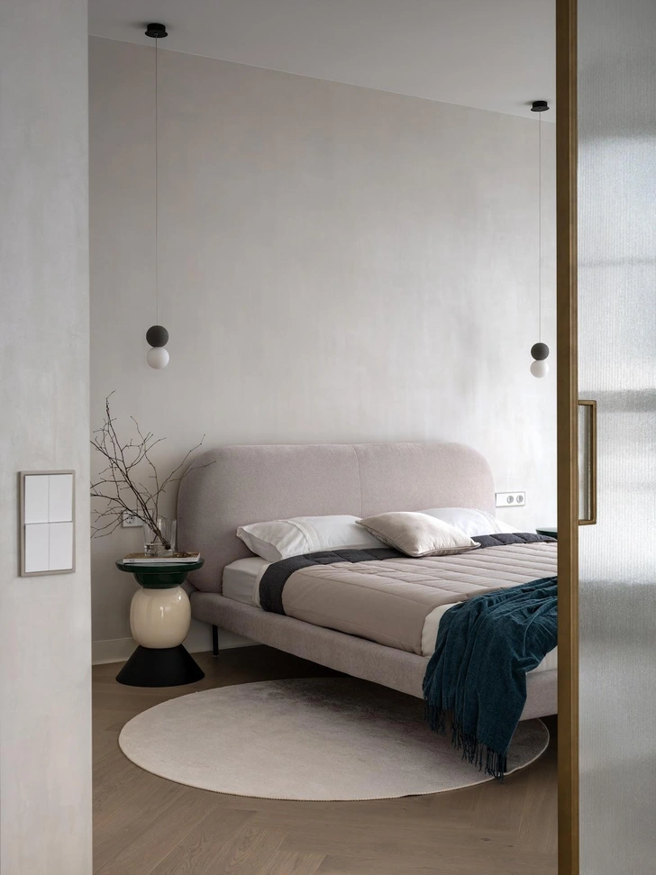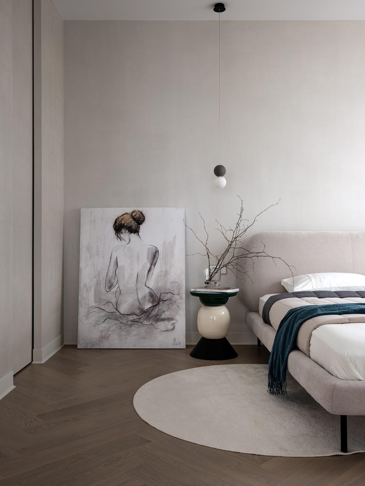 В мастер-спальне продолжается спокойная гамма и плавные формы — все для спокойного качественного сна. Здесь есть небольшая, но удобная гардеробная, она скрыта за раздвижной дверью в цвет стен. Украшает комнату нежная картина — она стала нашей музой!