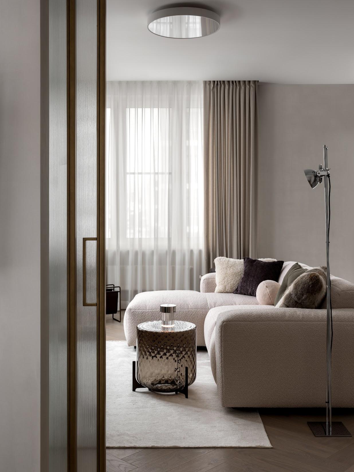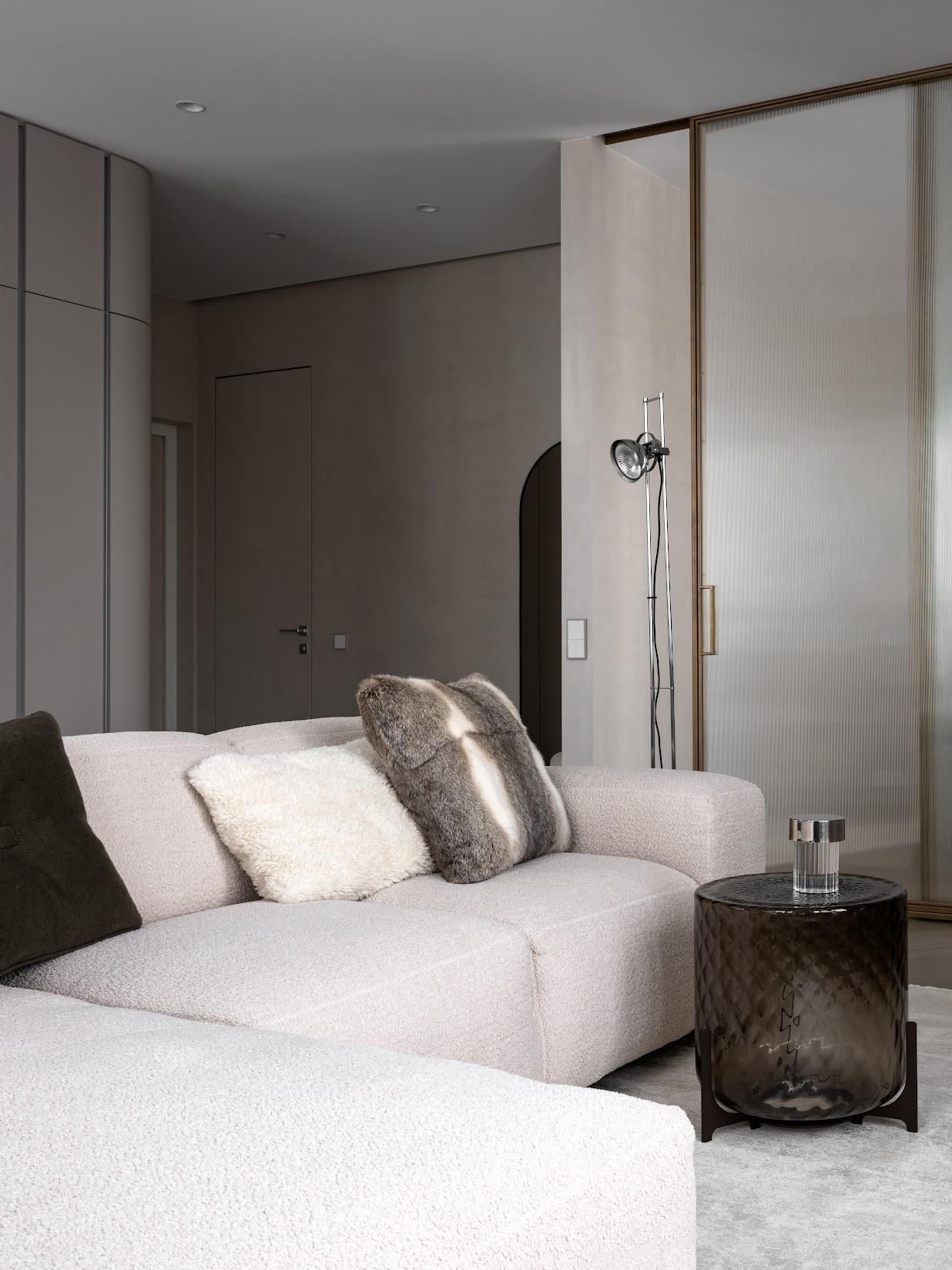 Диван Lucera, Flexlux Danish.Торшер, Zara home. Журнальный столик Dodo, Cattelan Italy. Светильник Last order fluted, Flos. Подушка, Minotti.