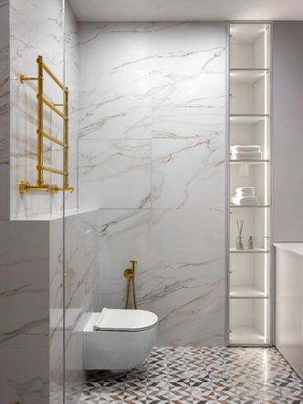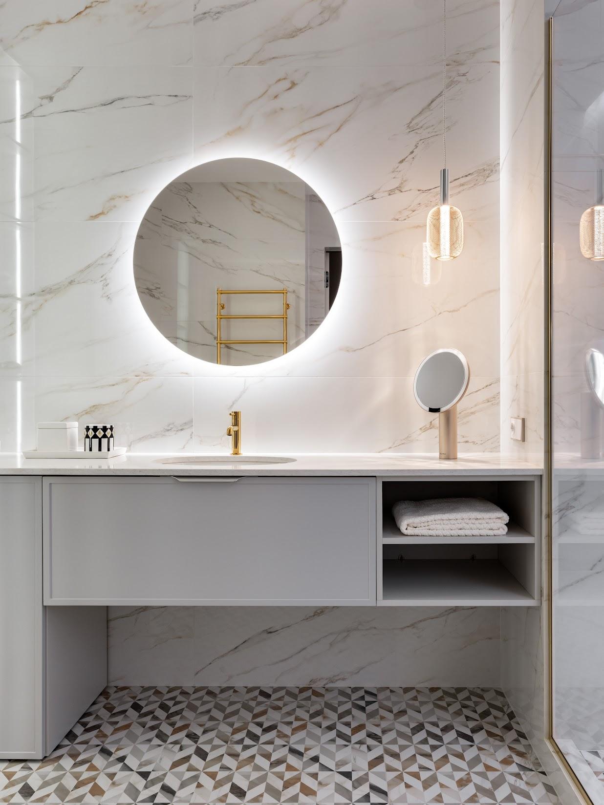 Керамогранит Cava lusso, Vallelunga Ceramica. Светильник Micron, Schuller. Полотенцесушитель, Margaroli. Косметическое зеркало, Bork. Керамогранит на полу Cava Domum, Vallelunga Ceramica.
