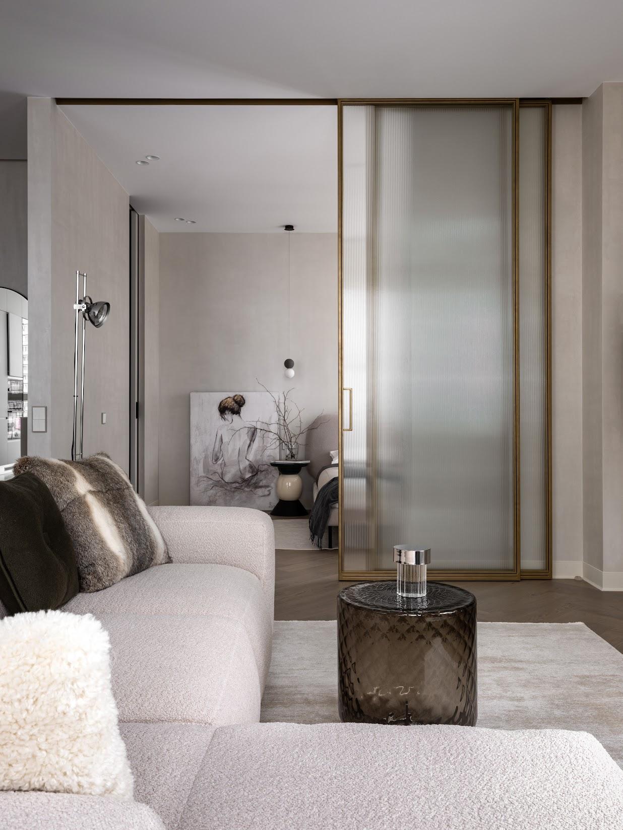 Другой интересный элемент зонирования — рифленая перегородка, которая не только негрубо разделяет зоны и создает приватность, но и не препятствует естественному свету. Стекло добавляет пространству современный вид и делает его воздушным, просторным, незамкнутым, а ритм вертикальных линий добавляет динамики и акцентирует внимание на высоте потолков. Это гораздо лучше, чем стены.