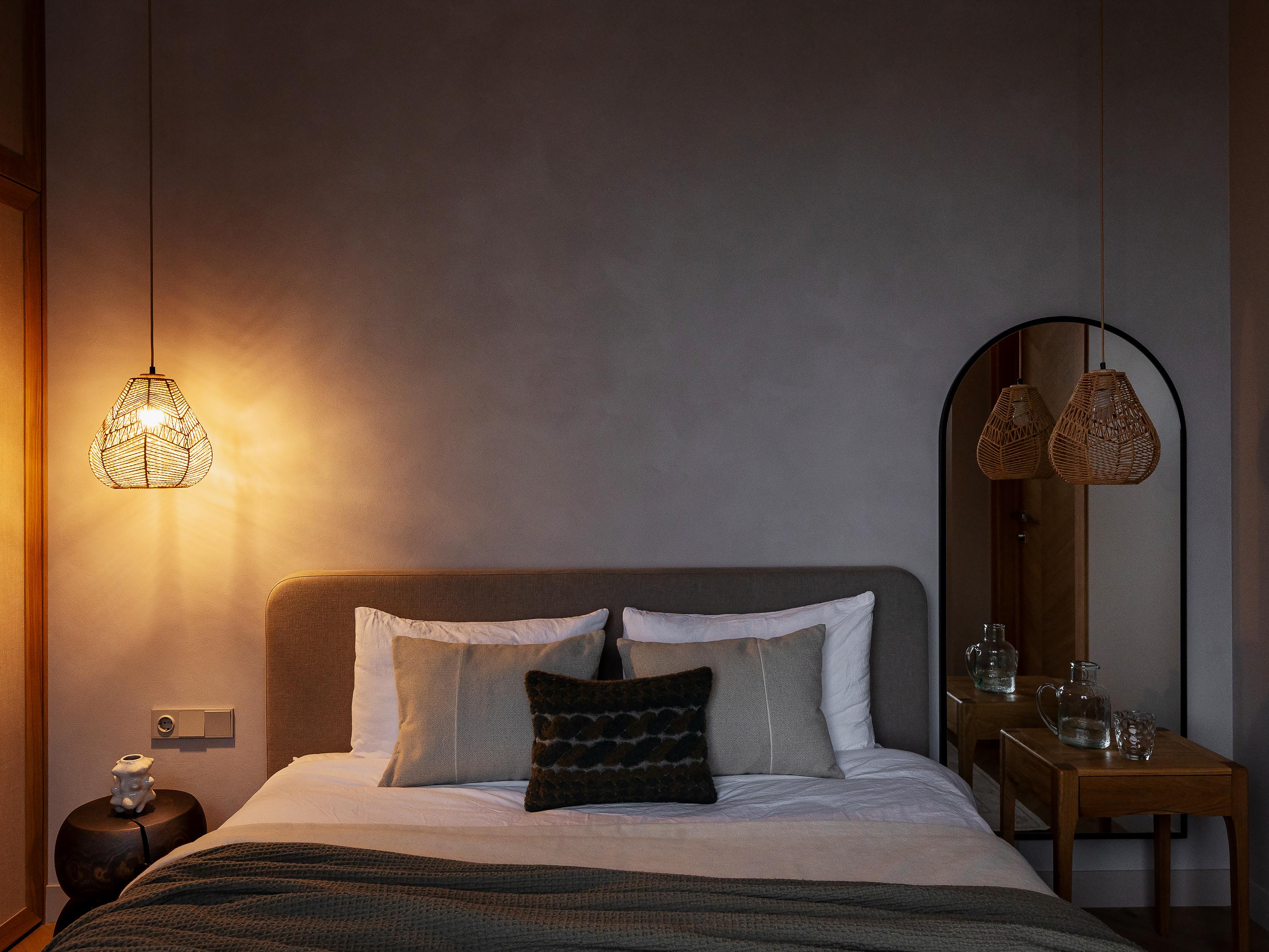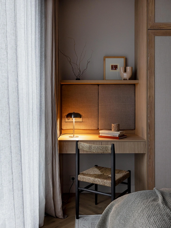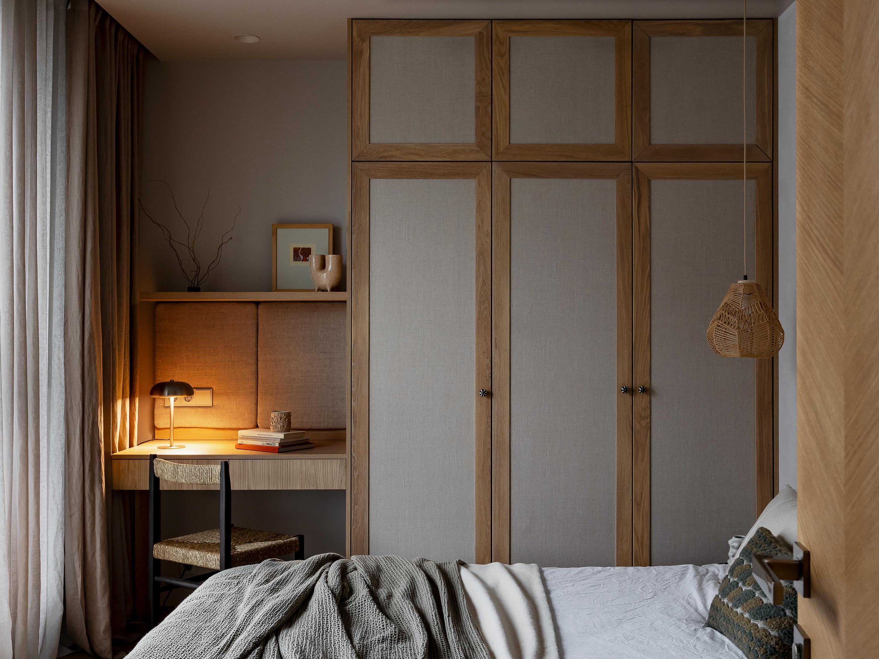 Спальня получилась очень уютной! Здесь много деталей, которые хочется рассматривать: декоративная стена за изголовьем кровати, деревянные фасады шкафа с тканевыми вставками, интересные ручки, мягкая панель из льна над рабочим столом, разные тумбы возле кровати, подвесные светильники… Заказчики стараются не захламлять пространство, поэтому много хранения делать не пришлось, это тоже помогло облегчить интерьер.