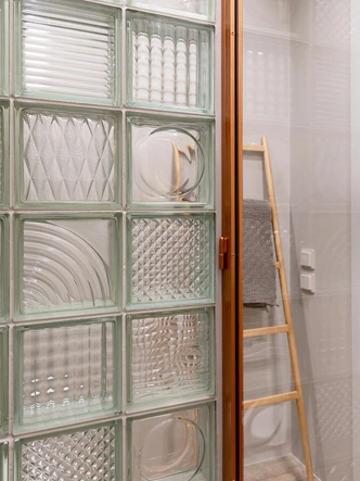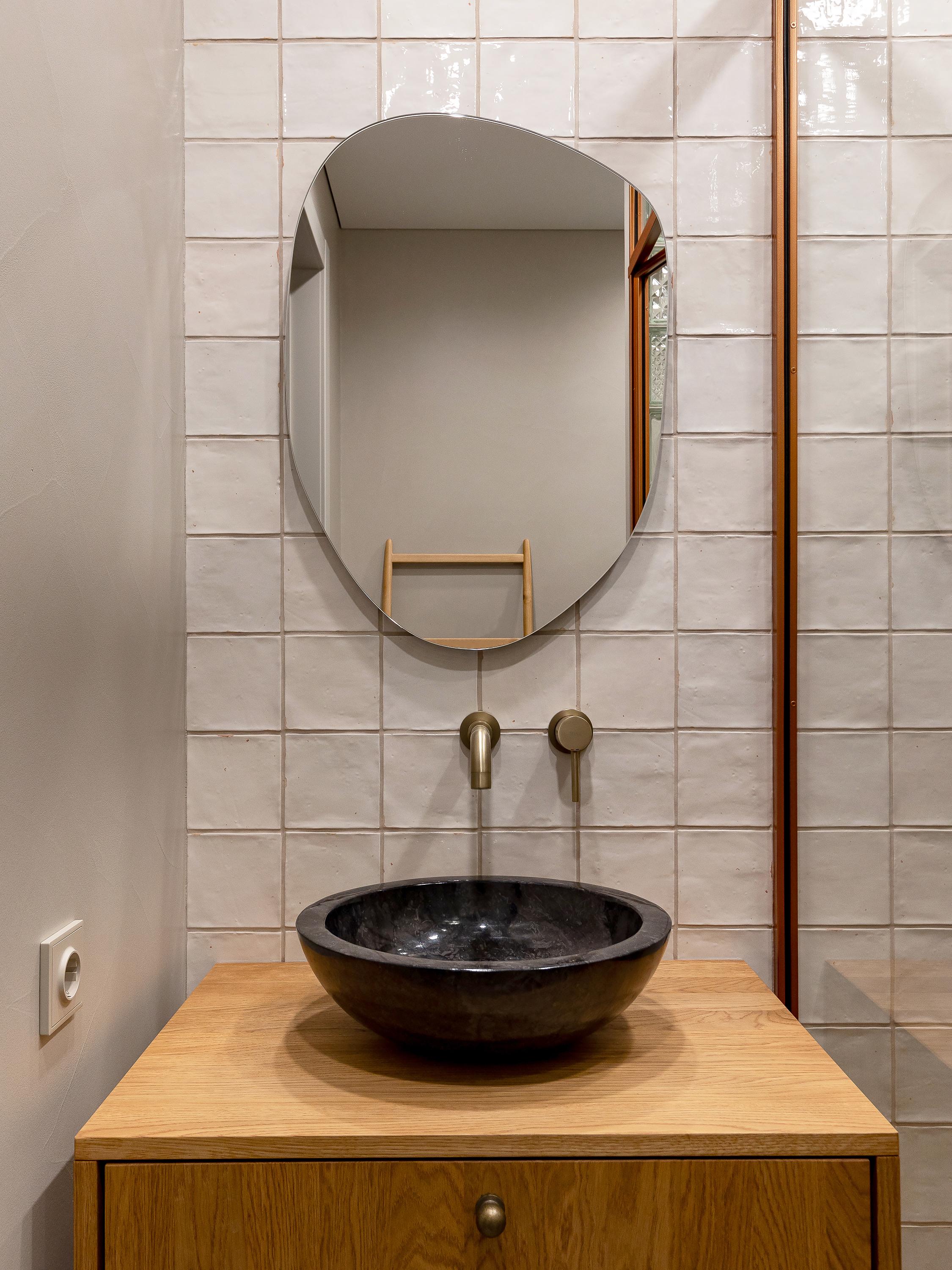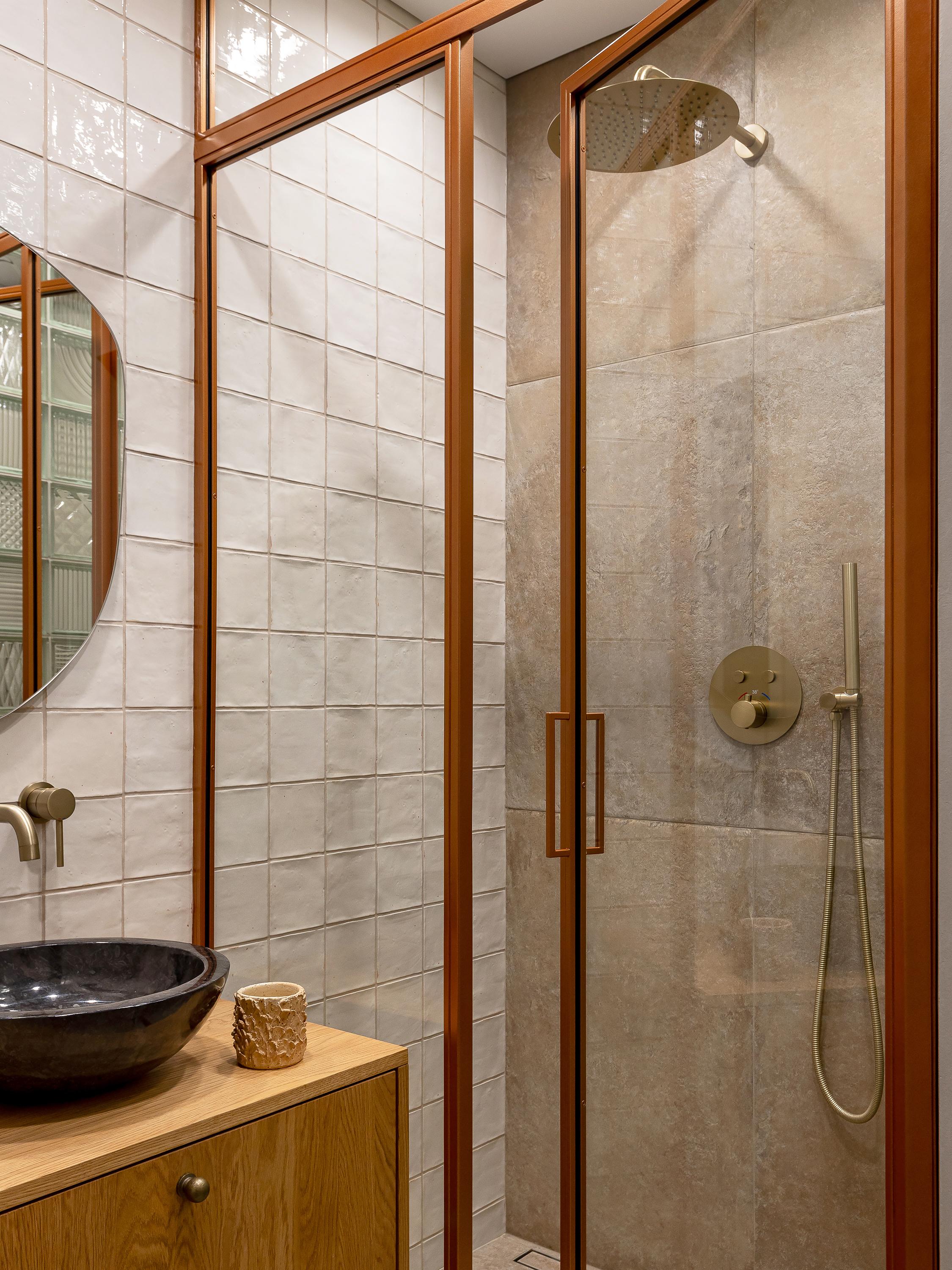Стеклянная перегородка, @black.owl.belarus. Крупноформатная плитка Castle, Coem. Мелкоформатная плитка, Mestizaje. Смесители, Rea. Тумба под раковину изготовлена по эскизам дизайнера.