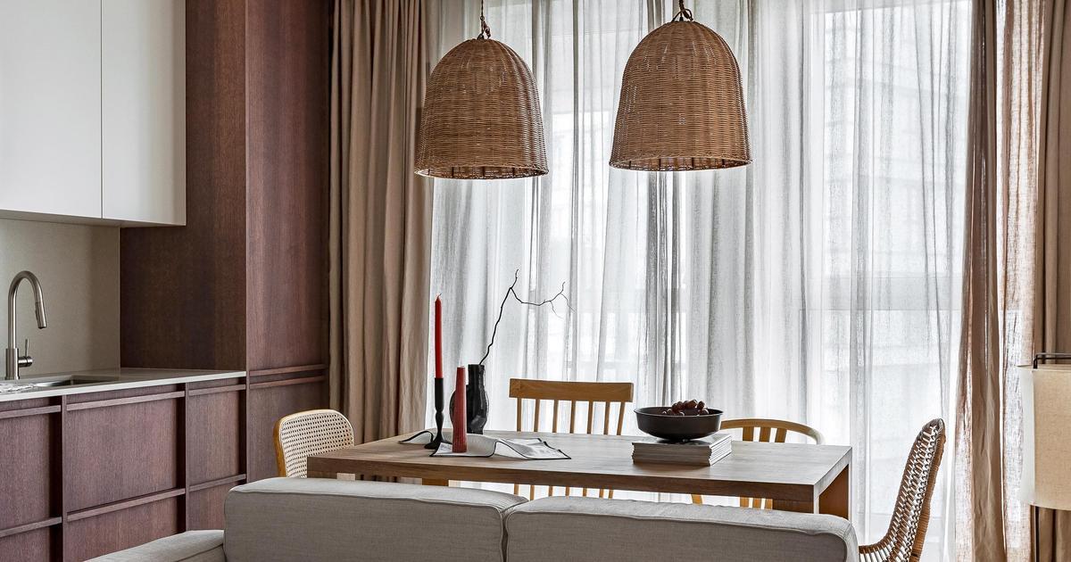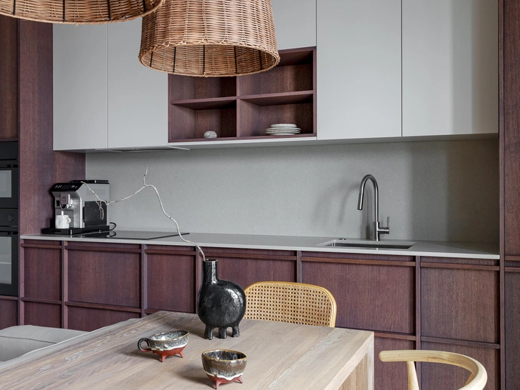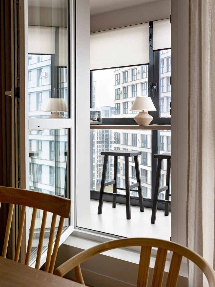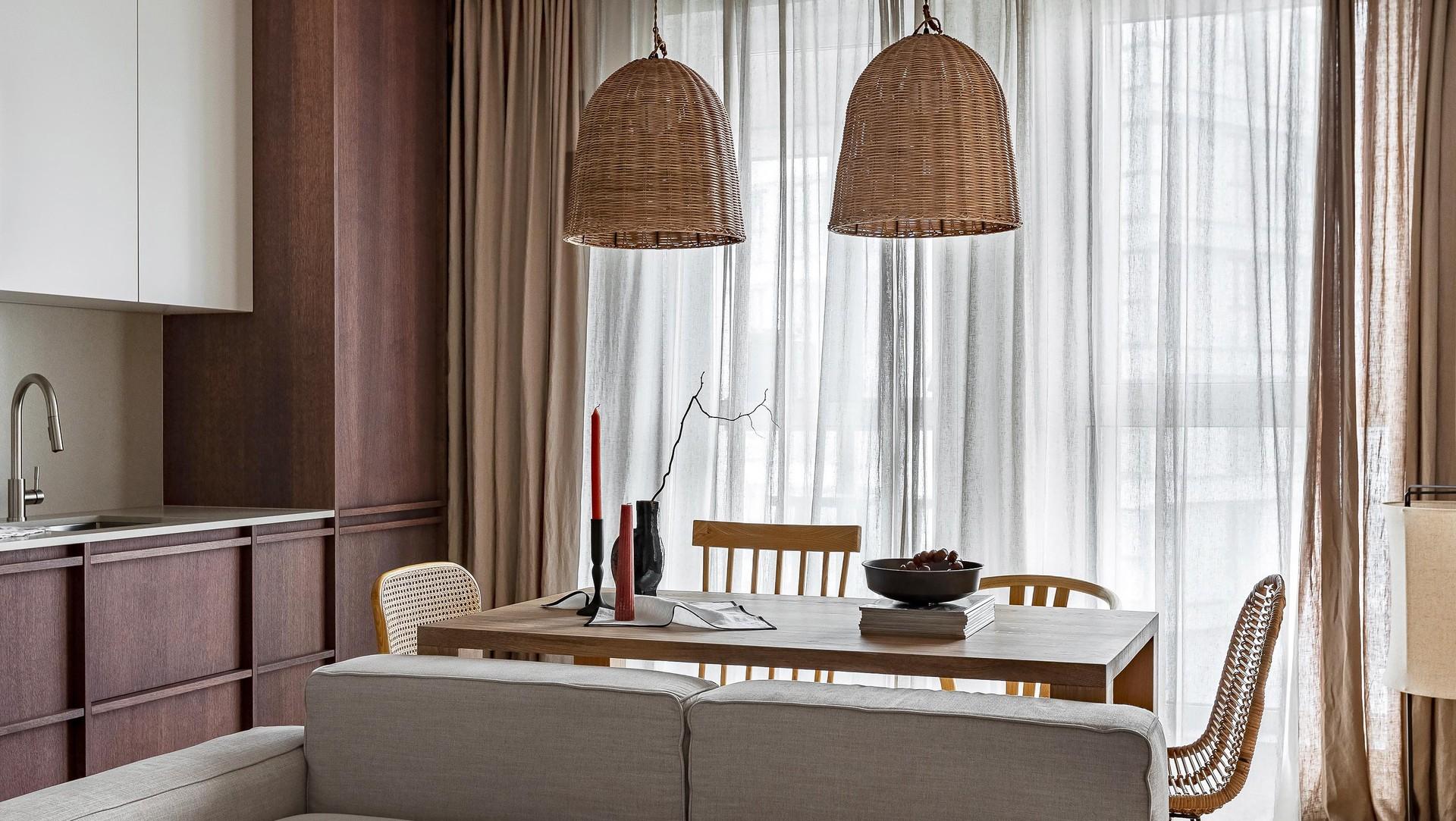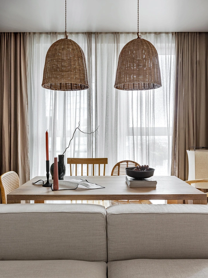 На кухне выделяется необычный оттенок шпона и плетеные светильники над столом. Вечером их теплый свет создает особую атмосферу. Дополняют обеденную группу четыре разных стула, которые по цвету рифмуются с дверью в спальню. Из столовой можно выйти на лоджию — там есть стойка у окна, где можно попить кофе или поработать.