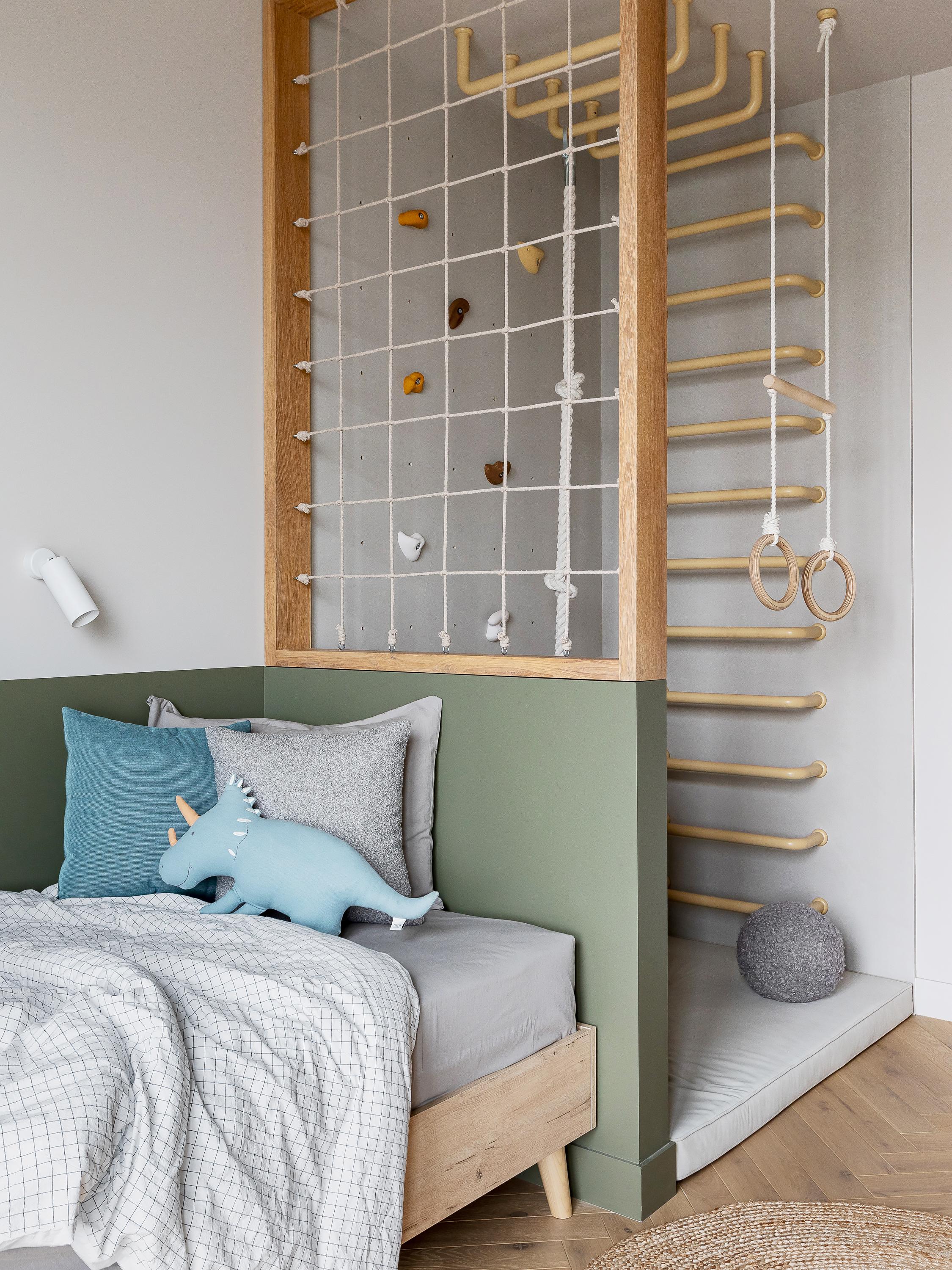 В комнате мальчика есть все для активных игр, даже скалодром. Он может выдержать до 200 кг, и глава семьи этому так обрадовался, что теперь и сам занимается там спортом — вот так неожиданно получилось. Над письменным столом мы расположили перфорированную доску, где можно переставлять цилиндры и навешивать полки. Между ней и шкафом образовалась ниша, куда мы вписали встроенные полочки.