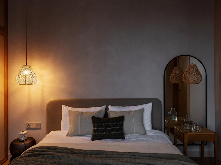 Декоративная штукатурка, Ирина Ницу. Прикроватный столик, Zara Home. Постельное белье, Homely.by.