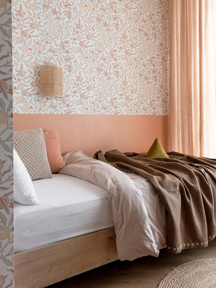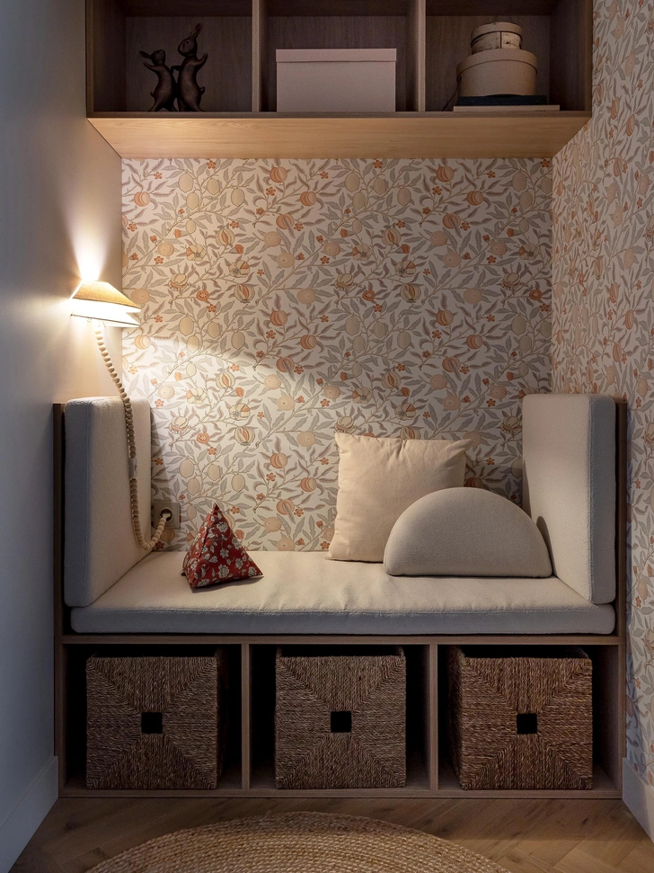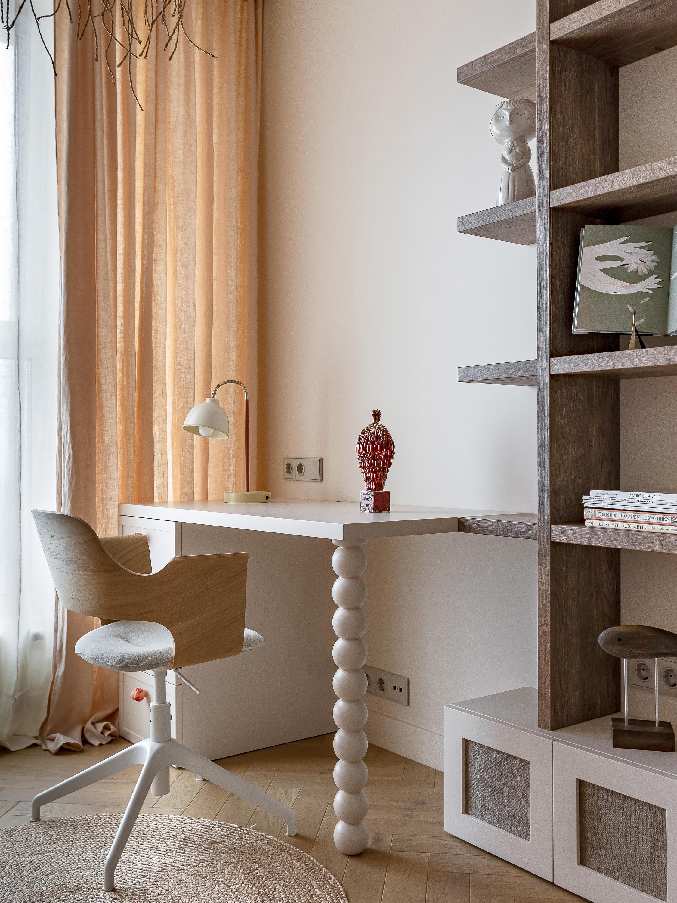 Детская девочки — единственная комната, где есть обои. С их принтом сочетаются милые ручки-персики на ящиках письменного стола. Здесь много рифм: вот, например, бусины на бра — они подыгрывают ножке рабочего стола. С нежными деталями контрастирует стеллаж, сделанный будто из амбарной доски — он поддерживает ваби-саби эстетику квартиры. Здесь поместятся все книги школьницы. А читать их можно в мягком уютном уголочке.