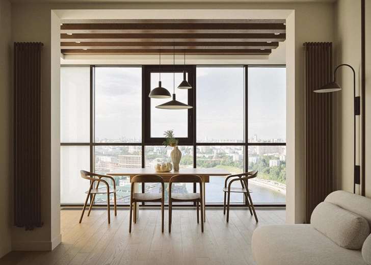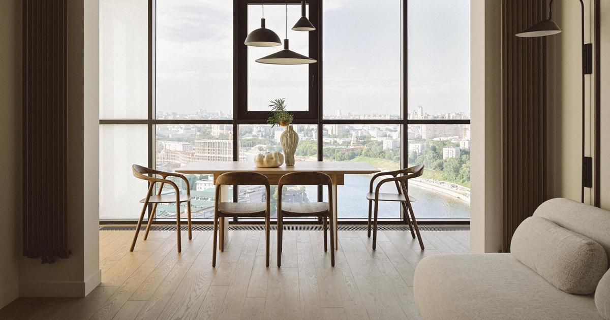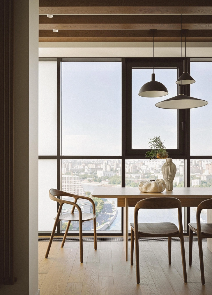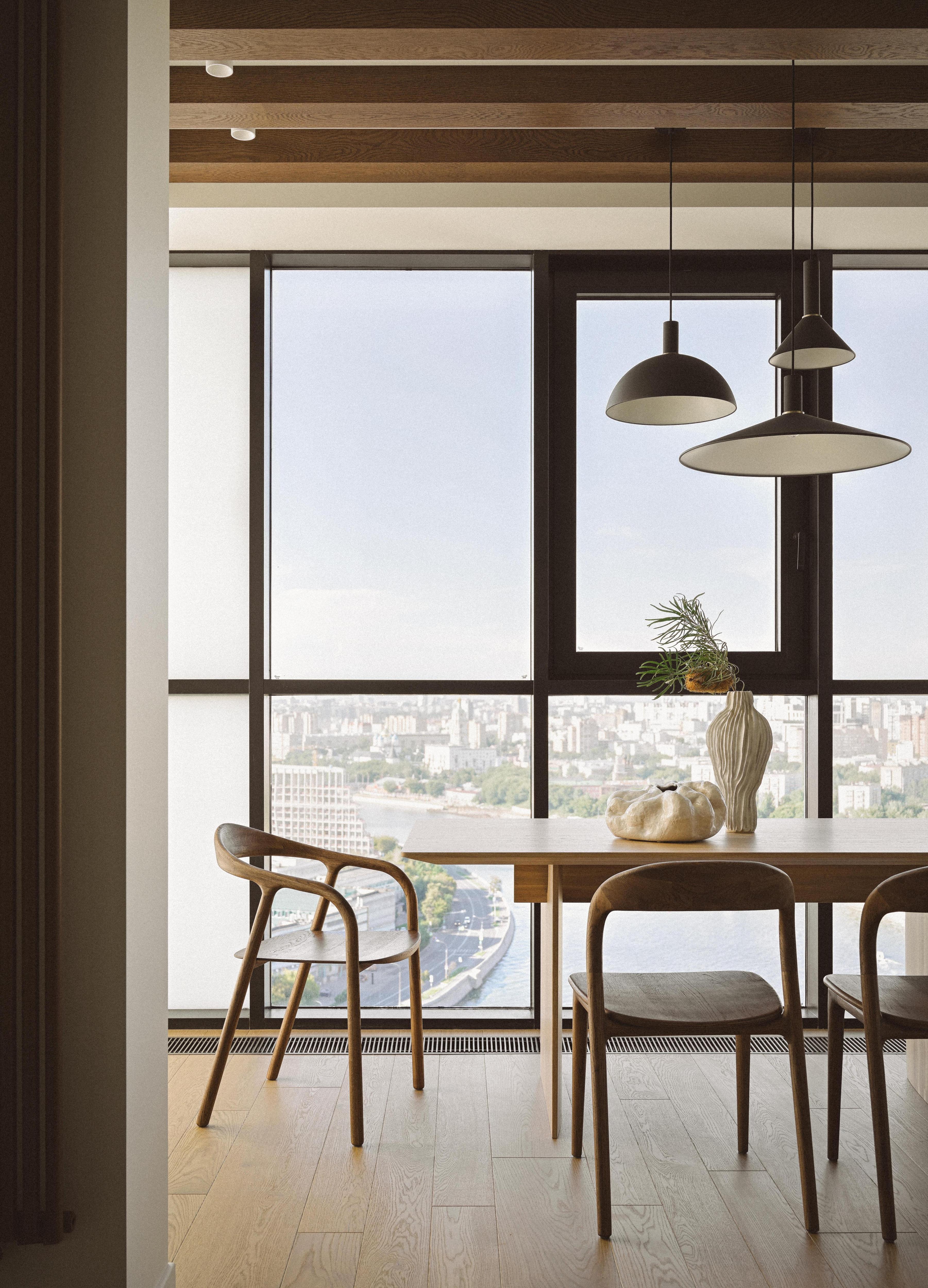 До этого семья жила в квартире в три раза меньше, там была очень маленькая кухня — так что они уверяли меня, что никогда не сидят вместе за обеденным столом, все едят в разное время. «Нам нужна только барная стойка, и максимум на двух человек!» — говорили они. Но при этом семья очень дружная, поэтому я не могла расстаться с мыслью о том, как было бы здорово им сидеть за большим столом и любоваться Москвой из шикарных панорамных окон… «Ладно, когда будешь приходить к нам в гости — будем там пить чай», — ответили мне. Но уже через пару месяцев после окончания проекта заказчица написала, что обеденный стол стал их любимым местом. Они стали вместе обедать и ужинать, и даже завтракать по выходным!
