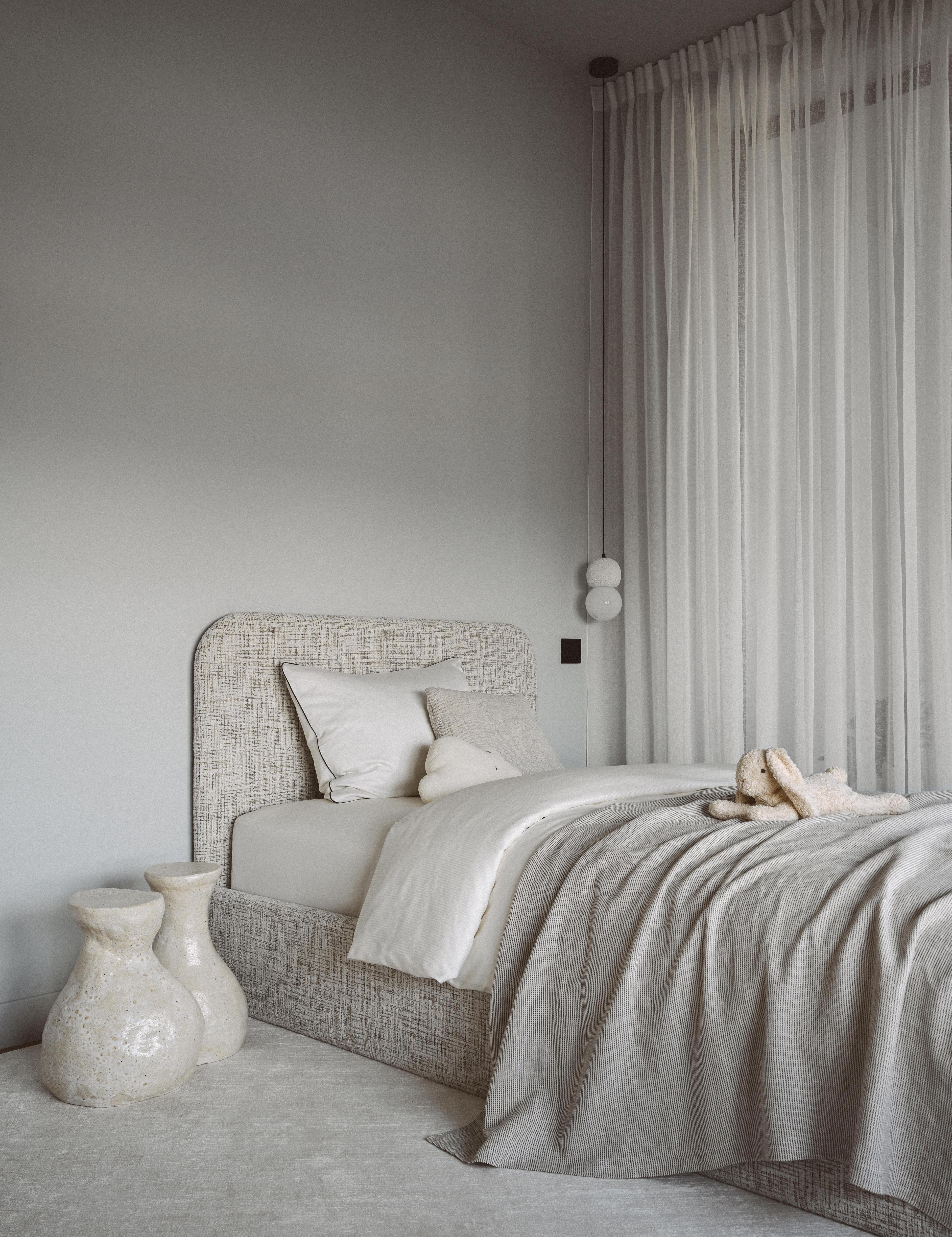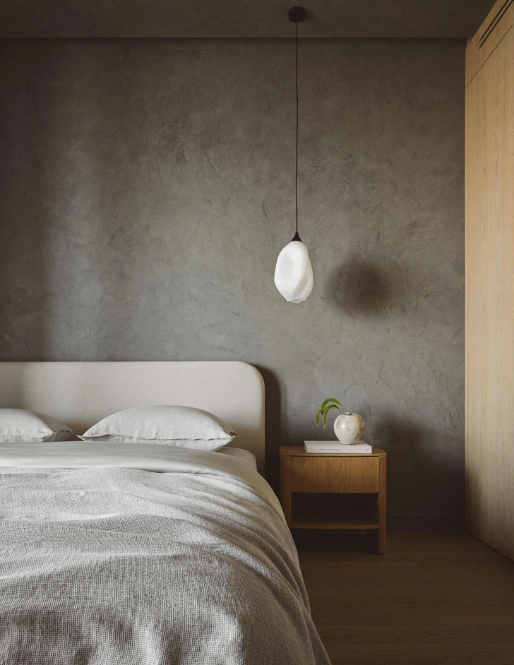 Каждая спальня в проекте — любимого цвета своего хозяина. Вообще, цвета — самое страшное, что нам приходилось обсуждать в процессе ремонта. Заказчики сразу признались, что для них существует один любимый цвет — это серый. А все вот эти нюансы и оттенки красного и зеленого — это мои личные выдумки и заморочки. На том и остановились. Поэтому спальня родителей получилась обволакивающего серого цвета. Чтобы было интереснее, добавили фактуры, покрыв стены и потолок штукатуркой. А чтобы стало еще уютнее, добавили теплый натуральный оттенок дерева и льна.