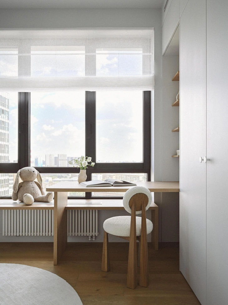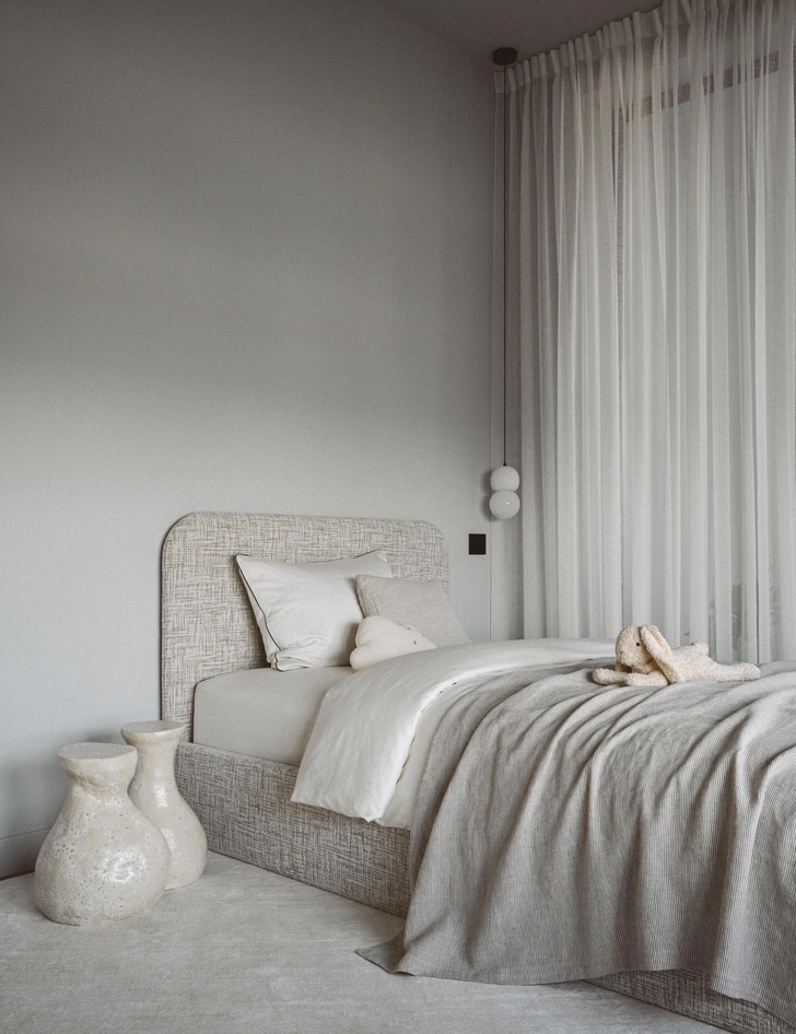 В спальне девочки все очень воздушное, как легкое серо-голубое облачко. У нас получилось создать здесь мечтательную атмосферу. А главное — в комнате много скрытого хранения, что позволяет пространству оставаться свободным и визуально чистым, здесь легко наводить порядок.