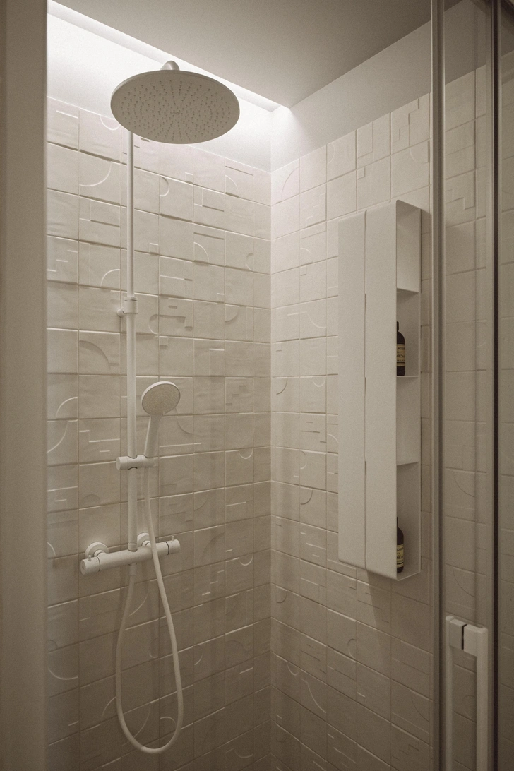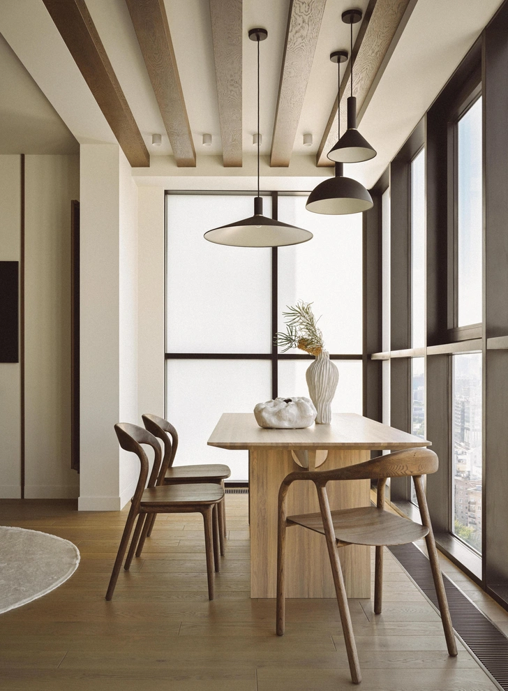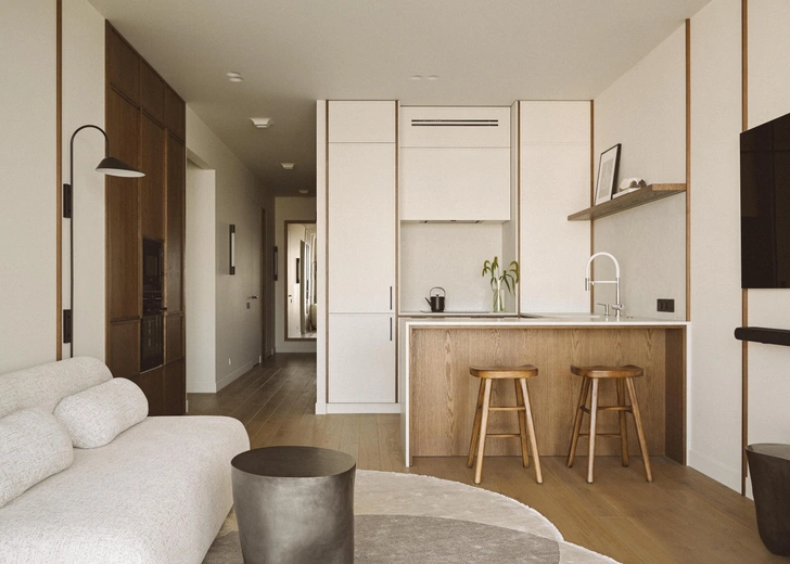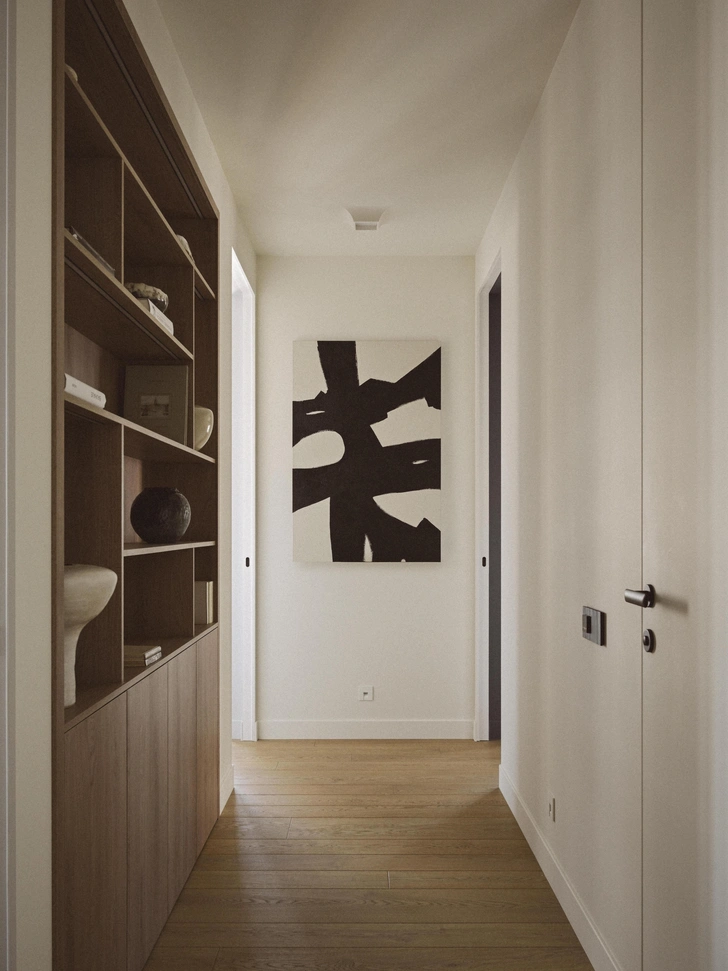 Один из ключевых приемов в интерьере — размыть границы каждой комнаты, сделав стены и потолок одного цвета. Даже встроенная мебель, окрашенная в цвет стен, растворяется в пространстве. Для этого же мы добавили и контрастное темное дерево. Этот природный материал забирает на себя внимание, становится акцентом и еще больше растворяет светлые однотонные границы помещений.