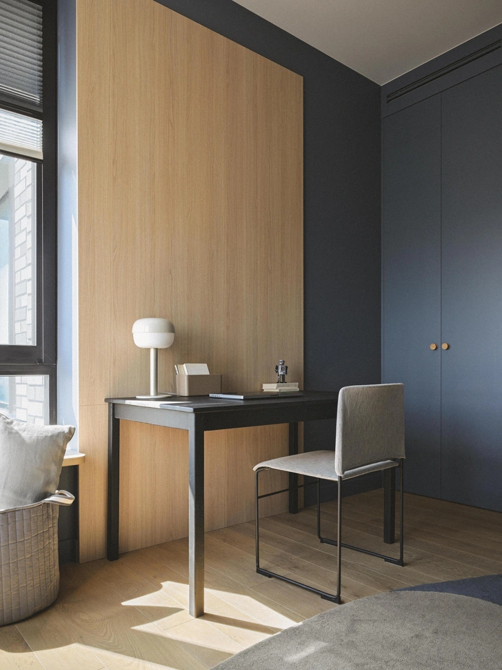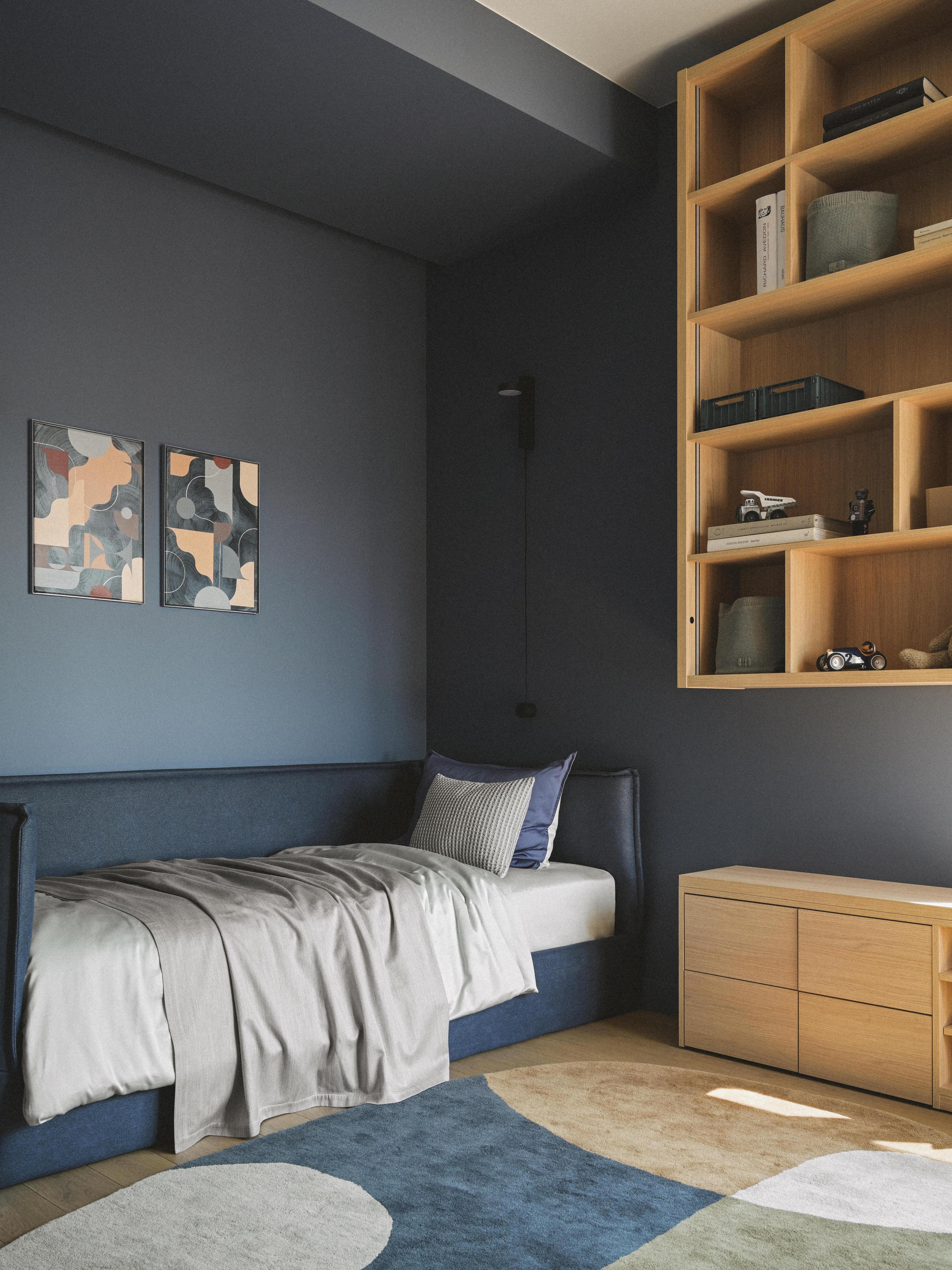 Спальня мальчика выполнена в темных тонах — цвета синего грозового неба. Юный геймер хотел получить «берлогу», в которой можно будет устанавливать и менять разные подсветки, сидеть на подоконнике с планшетом или за большим столом с монитором. А внутри шкафа мы спрятали доску для упражнений на пресс и шведскую стенку. Так что когда дверцы средней секции открываются, комната становится мини-спортзалом.