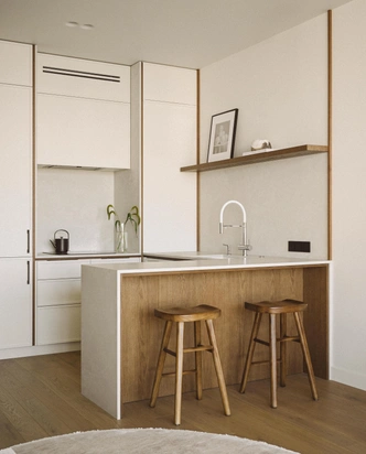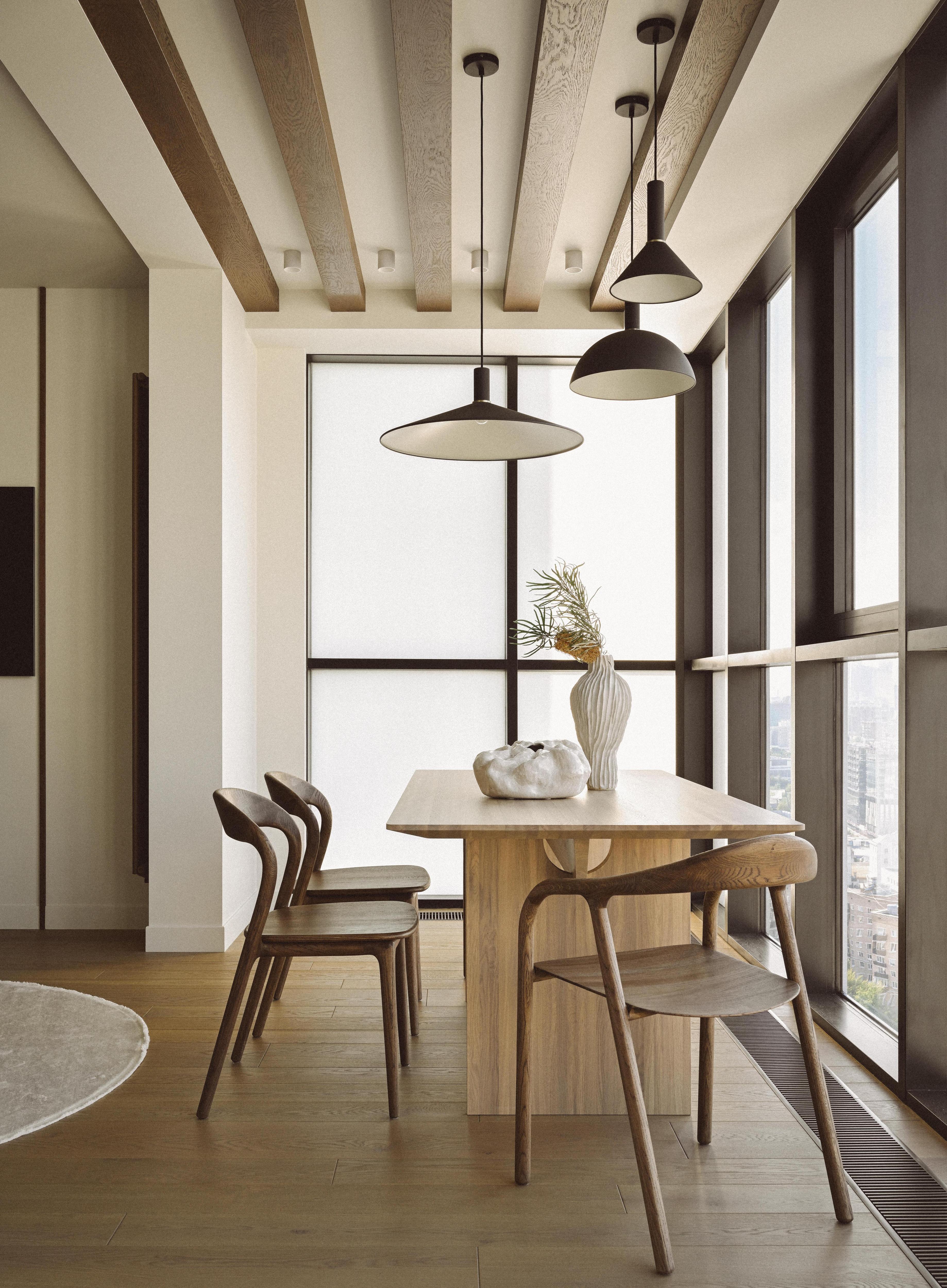 Прямоугольные четкие формы столешниц и фасадов сочетаются с обтекаемыми формами предметов мебели и декора. Деревянные стулья и табуреты, керамические столики, светильники из неровного стекла — они как будто сделаны вручную, с легкой небрежностью. Это привносит в интерьер элегантную естественность. А плавные линии диванов и кроватей добавляют интерьеру спокойствия и умиротворенности.