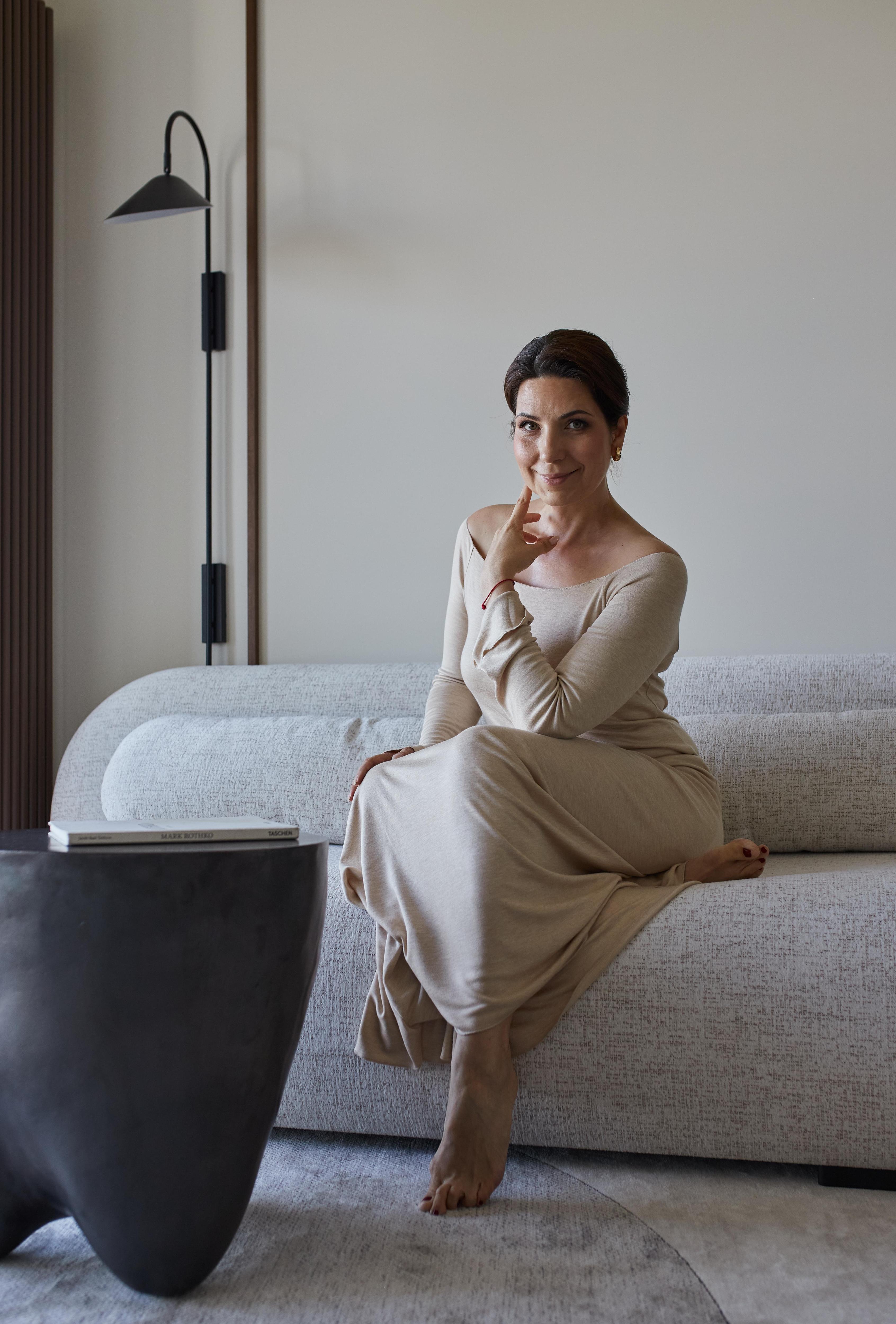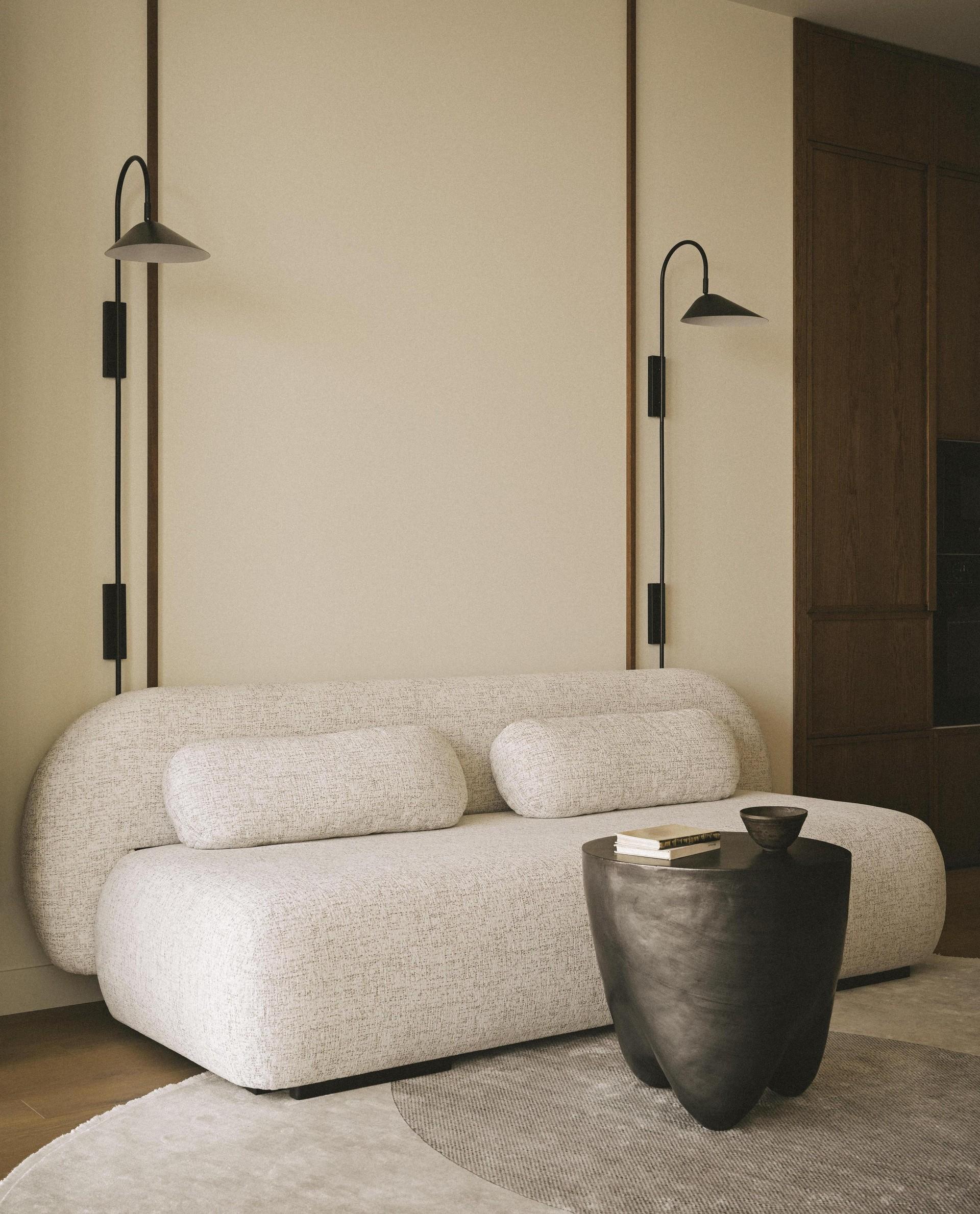 Диван изготовлен на заказ, Vysotka Home. Столик, Alex Home. Бра, Ferm Living.