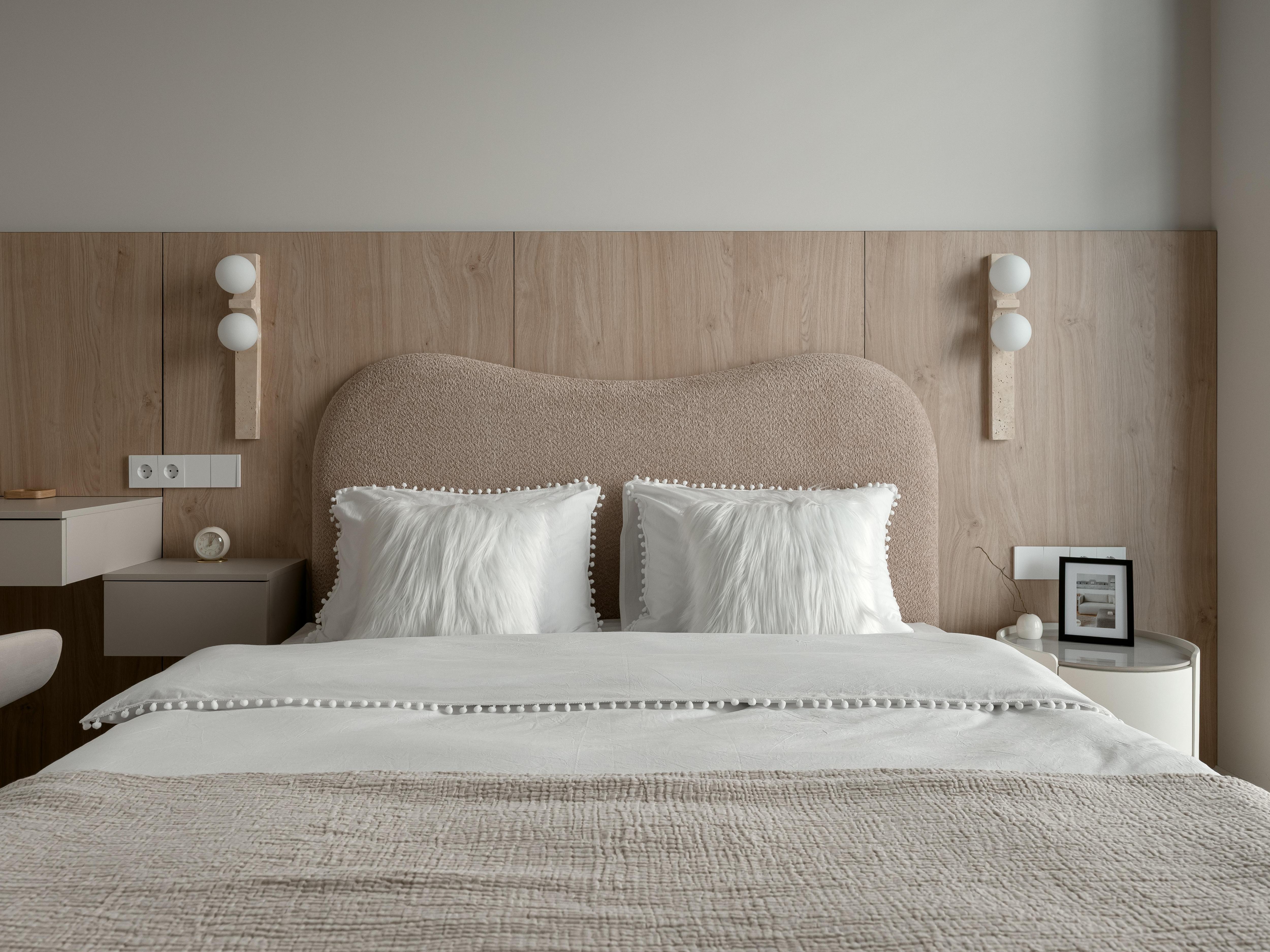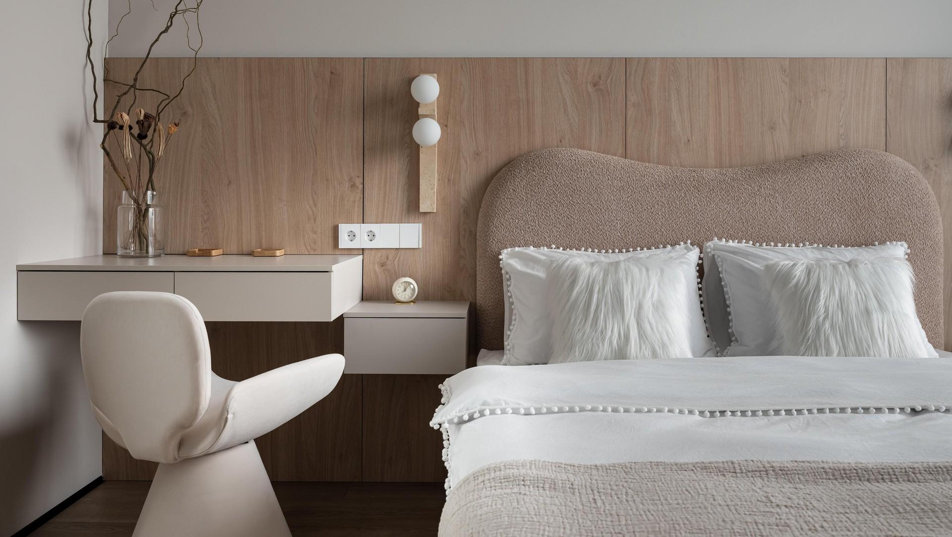 Кровать, стеновые панели и стол, прикроватная тумба изготовлены на заказ. Бра и стул заказаны из Китая.