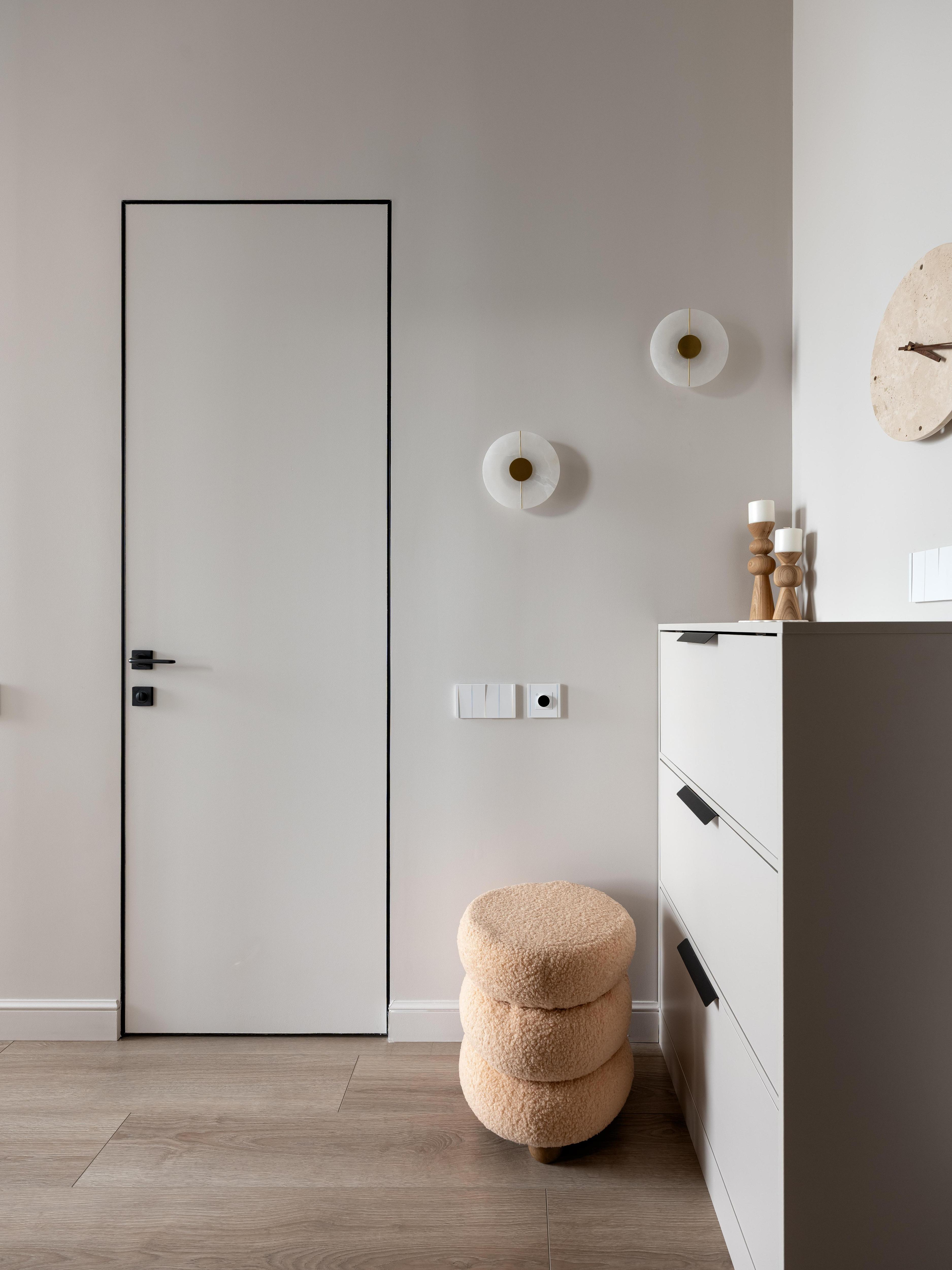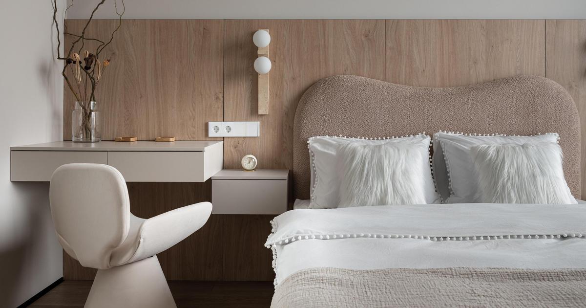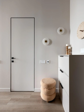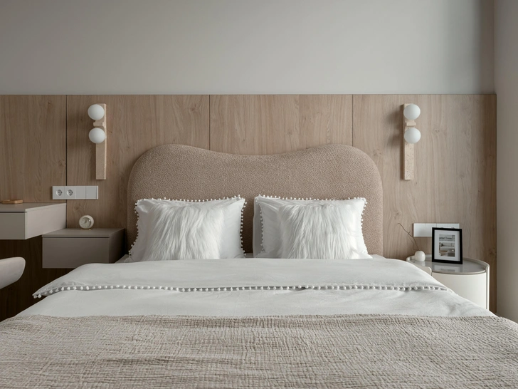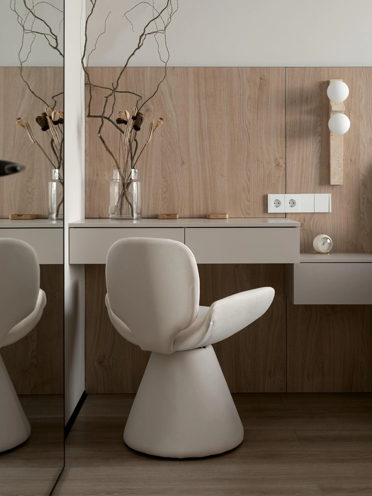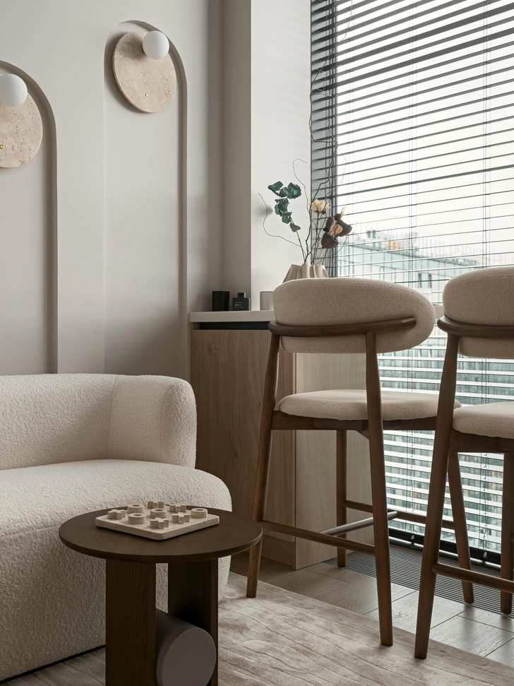 Все поверхности — в единой цветовой температуре, это помогло создать обволакивающую атмосферу. Оттенки крем-брюле в сочетании с деревянными панелями «утепляют» композицию и добавляют воздушности, а мягкая геометрия с плавными переходами и арочными элементами делает интерьер сбалансированным. Еще вместо штор мы использовали деревянные жалюзи — на наш взгляд, это отличное решение для небольших квартир, они регулируют свет и создают приватность, не утяжеляя пространство.