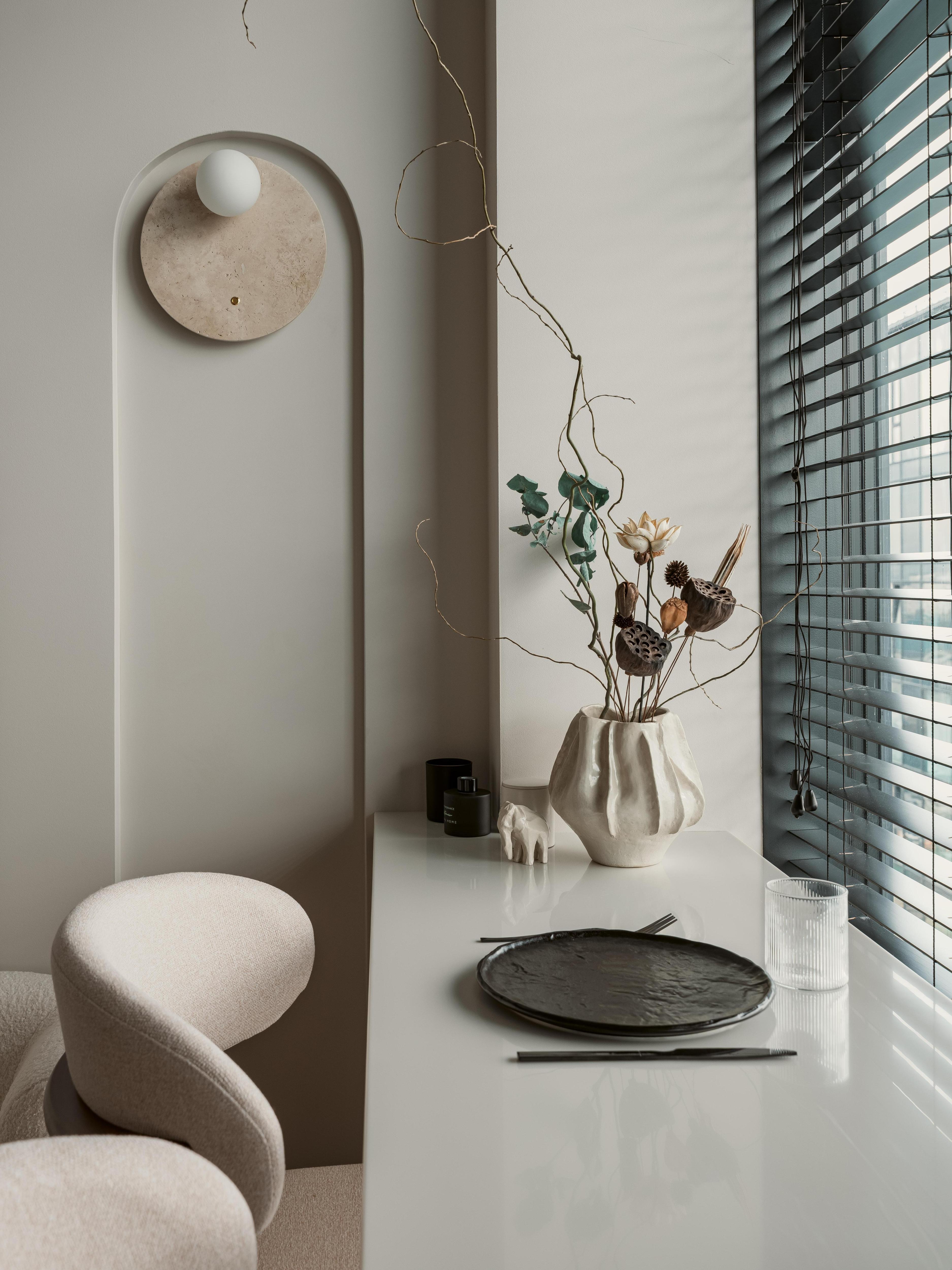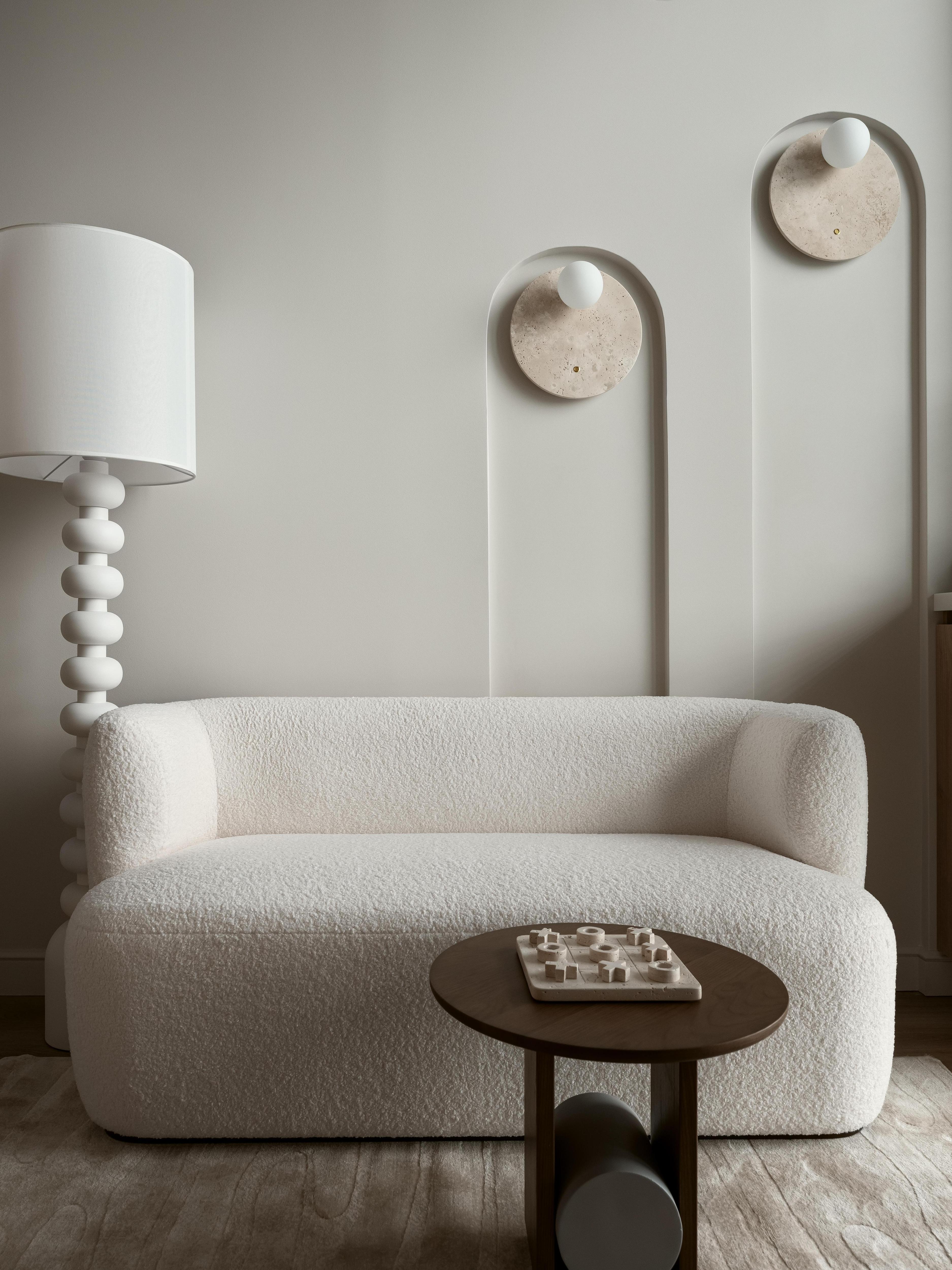 Нам особенно нравится, как в этом проекте взаимодействуют материалы — торшер, который похож на скульптуру, и бра из травертина, ткань букле и ковер с тактильной фактурой. Холодная плотность камня и теплая шероховатость ткани создают особую гармонию. Мы гордимся тем, что этот проект получился именно таким — тихим, естественным, что удалось выстроить свет, декор и архитектуру в едином ритме.
