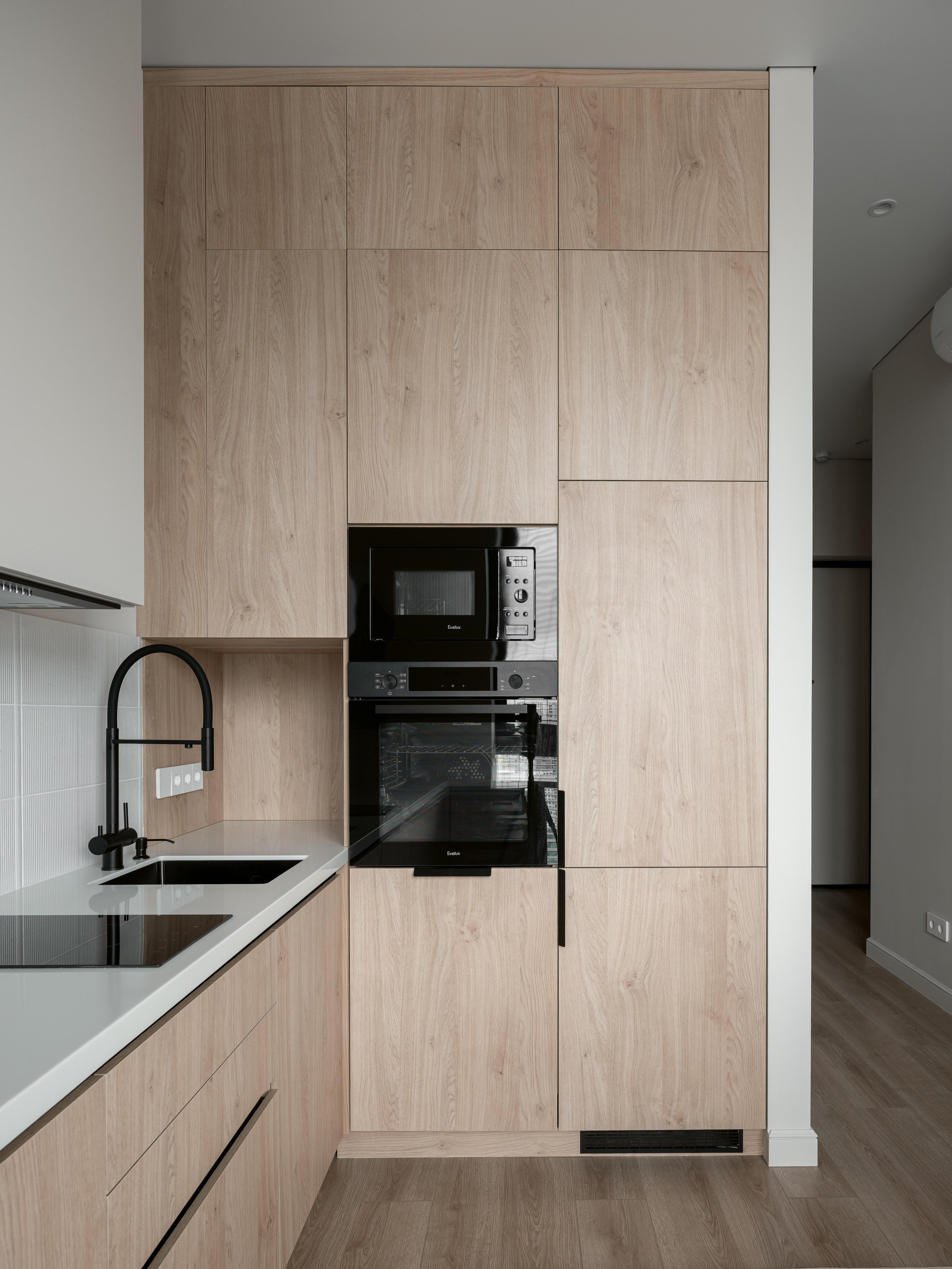 Плитка на фартуке «Скарпа», Kerama Marazzi. Кухонный гарнитур со столешницей из акрилового камня Grandex Natural White изготовлен на заказ по эскизам дизайнеров. Техника, Evelux.