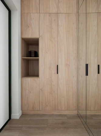 Поэтому выделили изолированную спальню, сохранили кухню-гостиную и добавили продуманные системы хранения — вместительный шкаф в прихожей и полноценную гардеробную в спальне. Так планировка стала более целостной и удобной. Много мебели изготовили на заказ: стеновые панели, шкафы, ТВ-тумба — все собрано из ЛДСП Egger и Kronospan. Стоят приемлемо, а выглядят дорого.