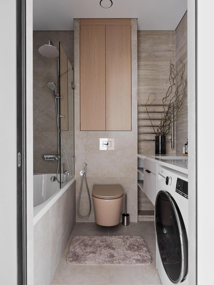 В ванной внимание сразу привлекает бежевый унитаз — редкий выбор, который идеально вписался в спокойную палитру интерьера. Его расположили напротив входа, что обычно считается спорным решением, но здесь оно полностью оправдано: такая планировка позволила разместить в компактном пространстве все необходимое — ванну, вместительную тумбу с раковиной, стеллаж и стирально-сушильную машину.