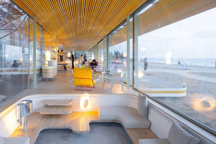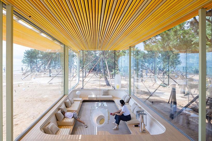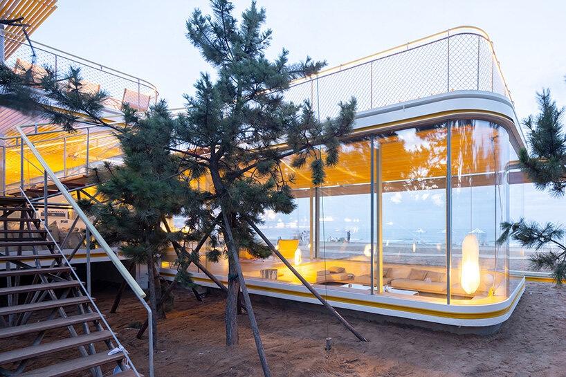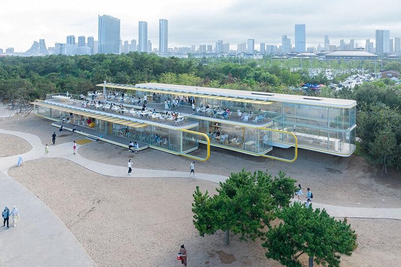 При взгляде с пляжа кафе почти исчезает, потому что стеклянные поверхности отражают лес и небо: сам пейзаж объединяется с архитектурой. Только мягкие переливы алюминиевых солнцезащитных козырьков и движение людей внутри выдают его присутствие.