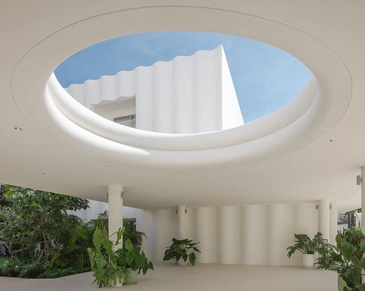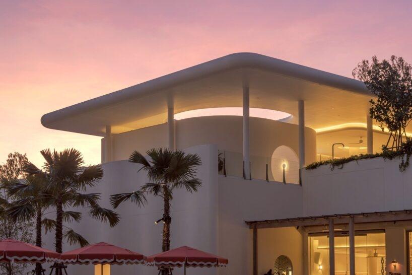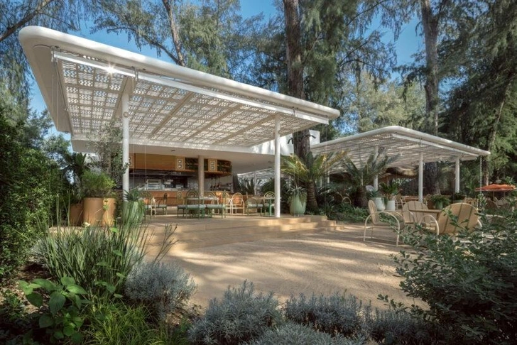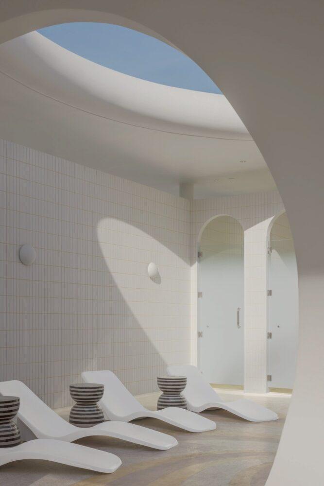 Четвертый внутренний двор организован как большое открытое общественное пространство и ведет прямо к пляжу. Росшие на участке сосны сохранили и интегрировали в архитектурную композицию, а здание аккуратно расположили среди них. Тут находятся главный бассейн, ресторан, бар и спа-зона. С них открывается вид на закат, благодаря чему архитектура напрямую взаимодействует с прибрежным ландшафтом.